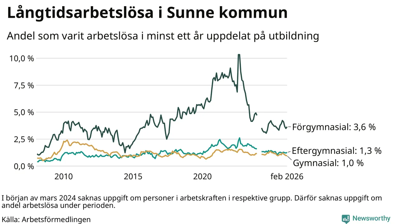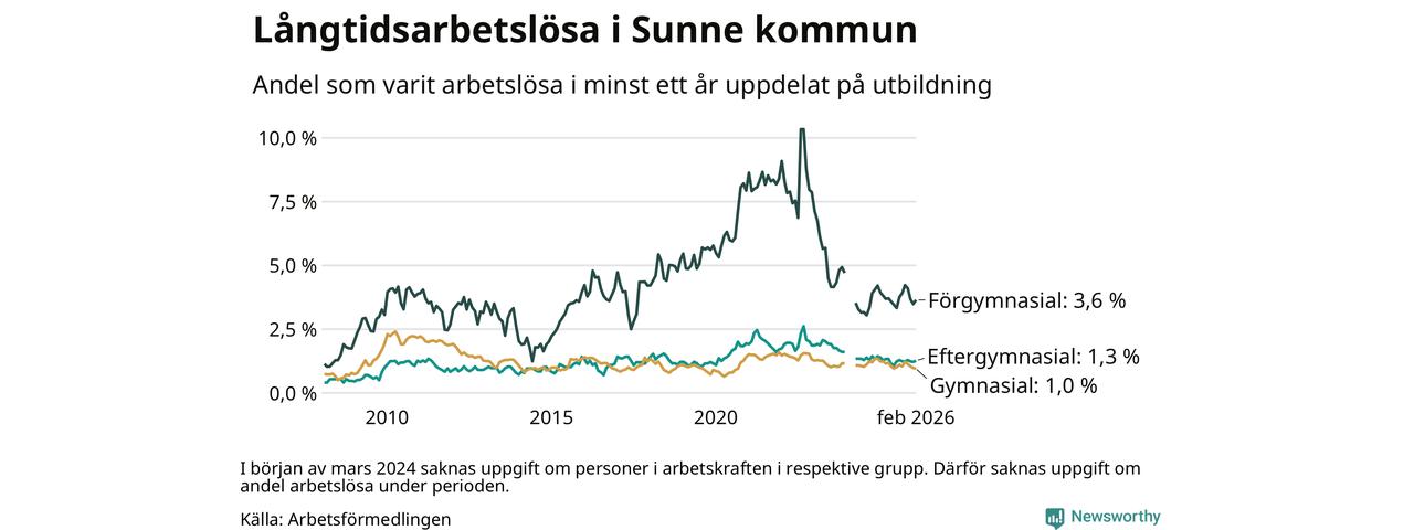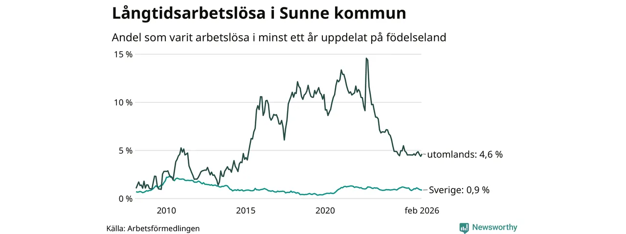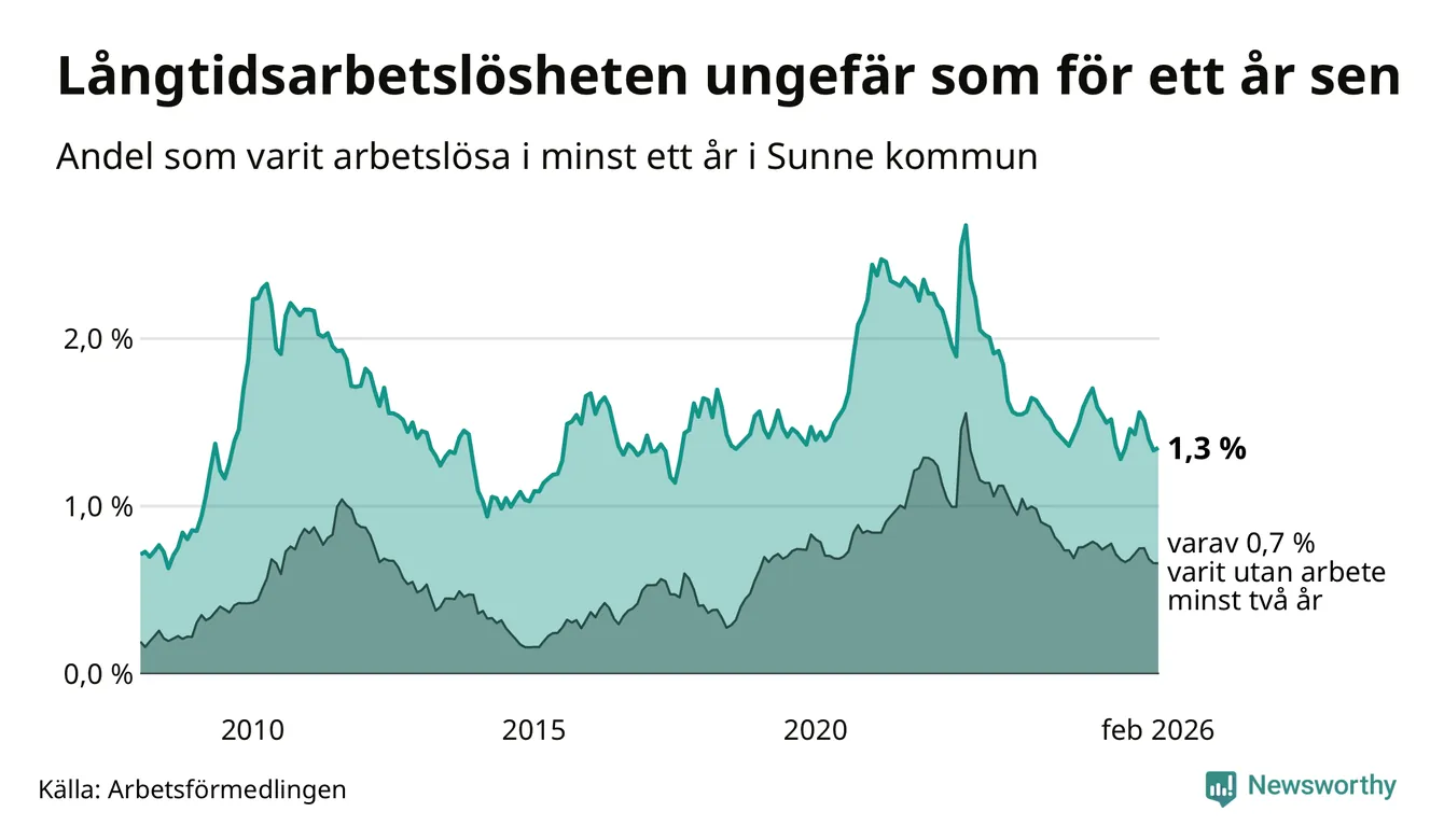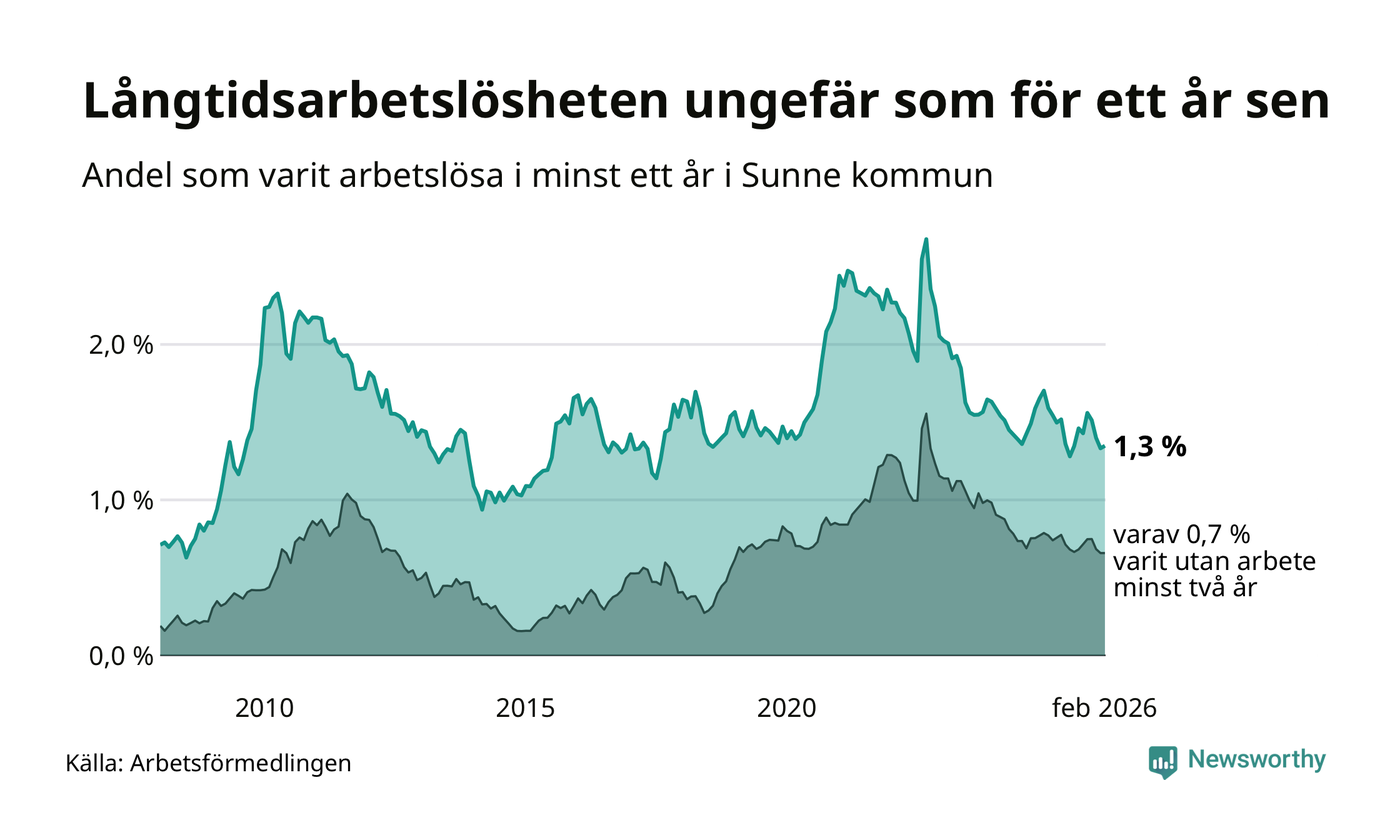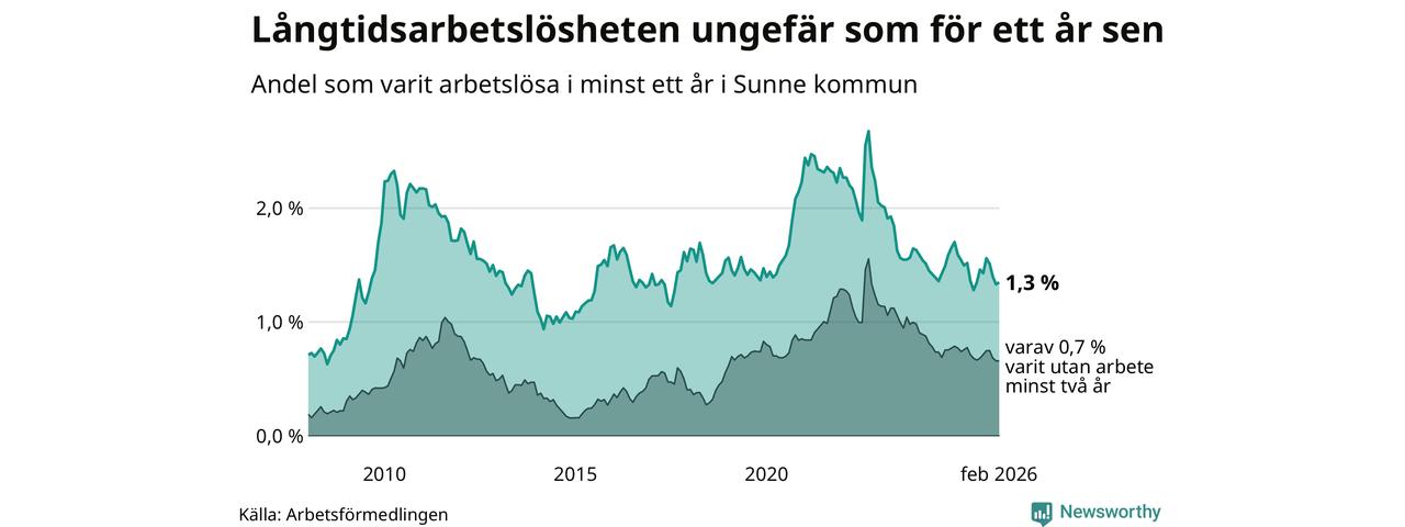 Andelen som varit utan arbete i minst ett år i Sunne var ungefär lika stor i februari jämfört med samma månad för ett år sedan. Det visar Arbetsfömedlingens senaste månadsstatistik.
