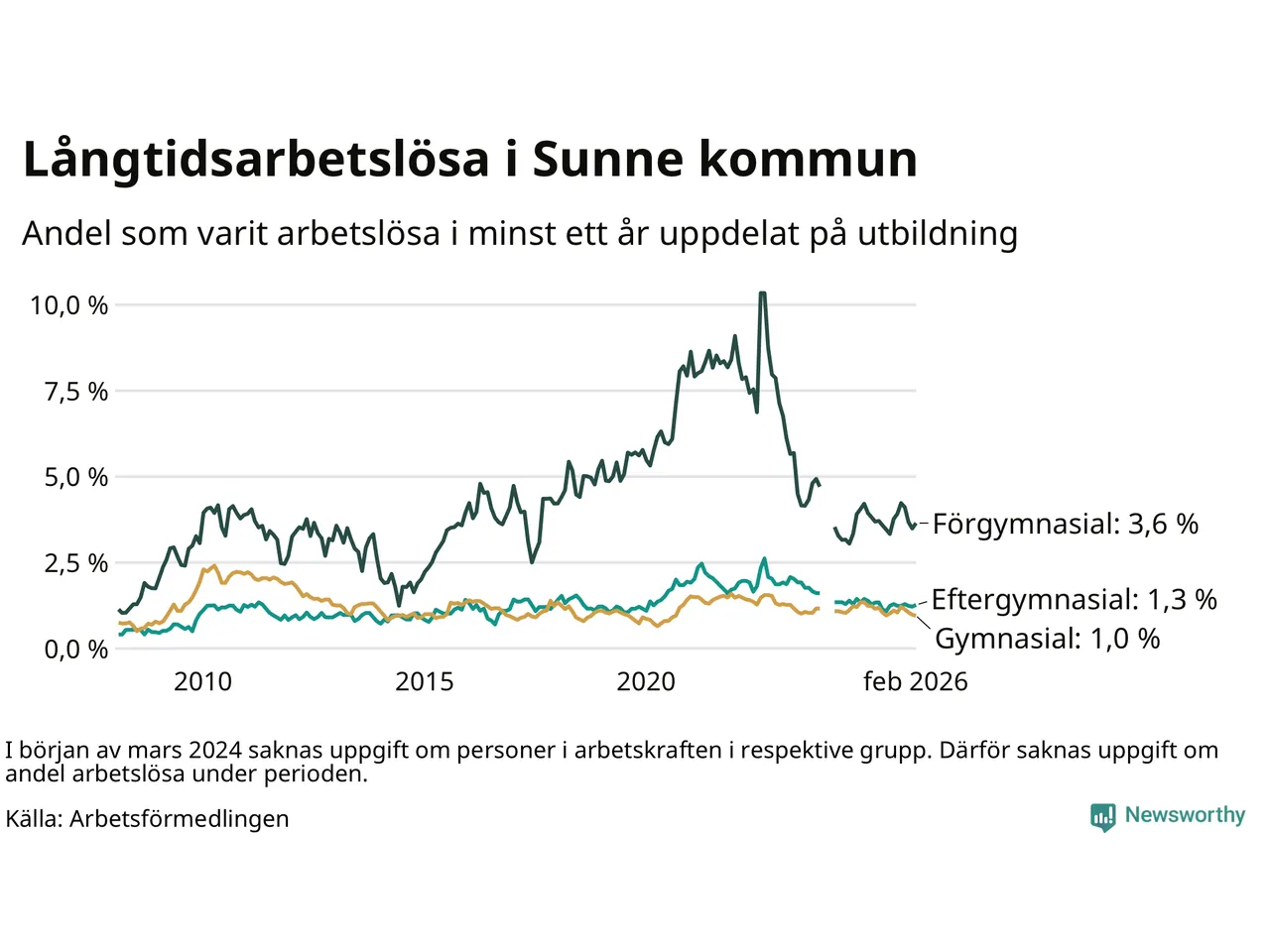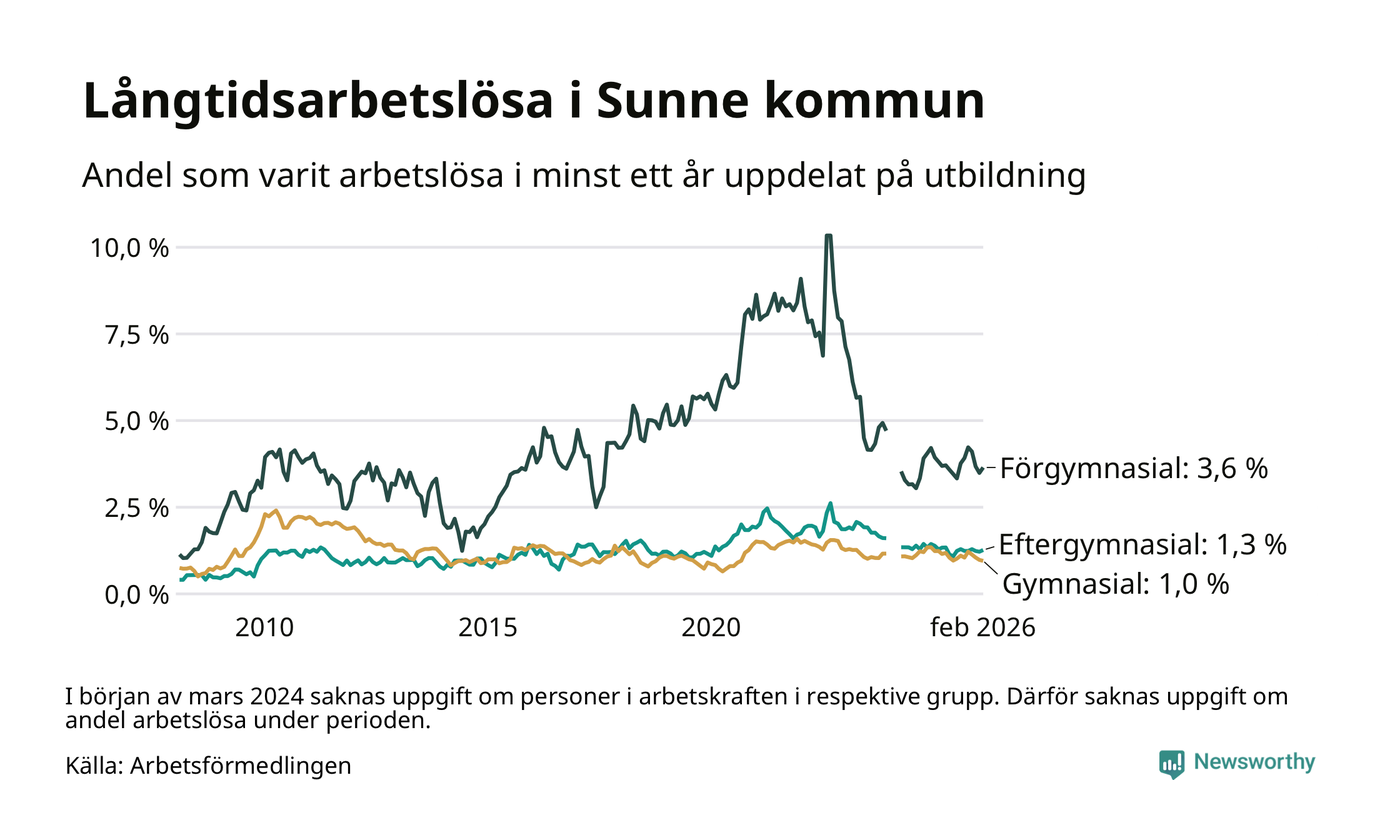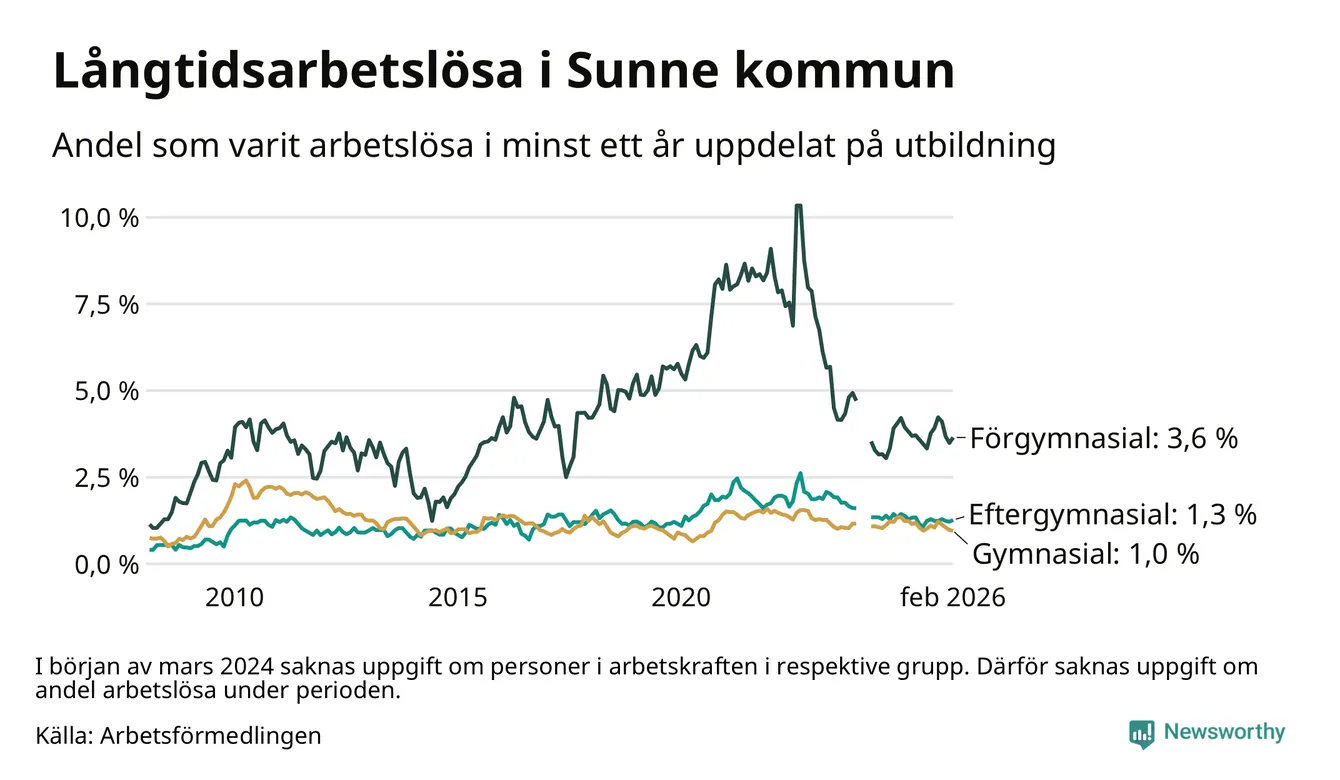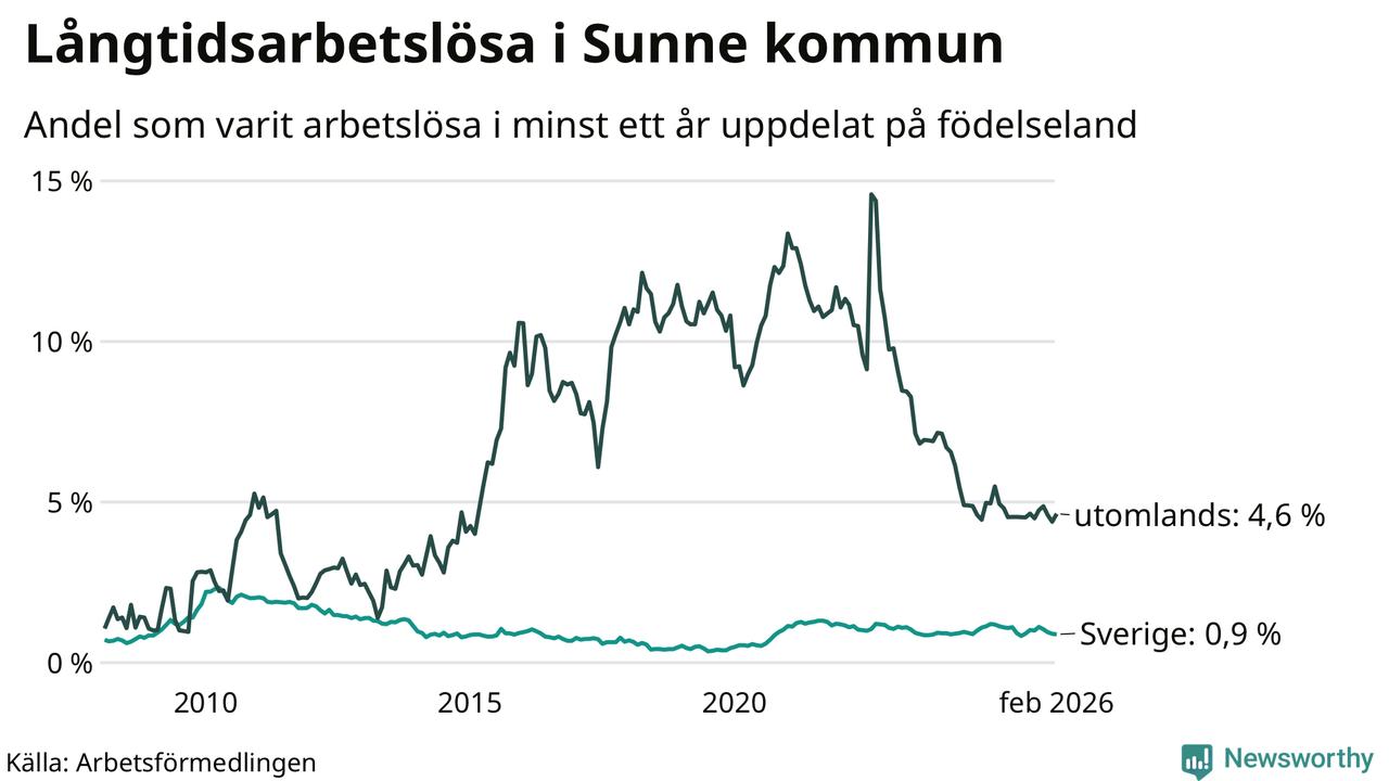 Andelen som varit utan arbete i minst ett år i Sunne var ungefär lika stor i februari jämfört med samma månad för ett år sedan. Det visar Arbetsfömedlingens senaste månadsstatistik.