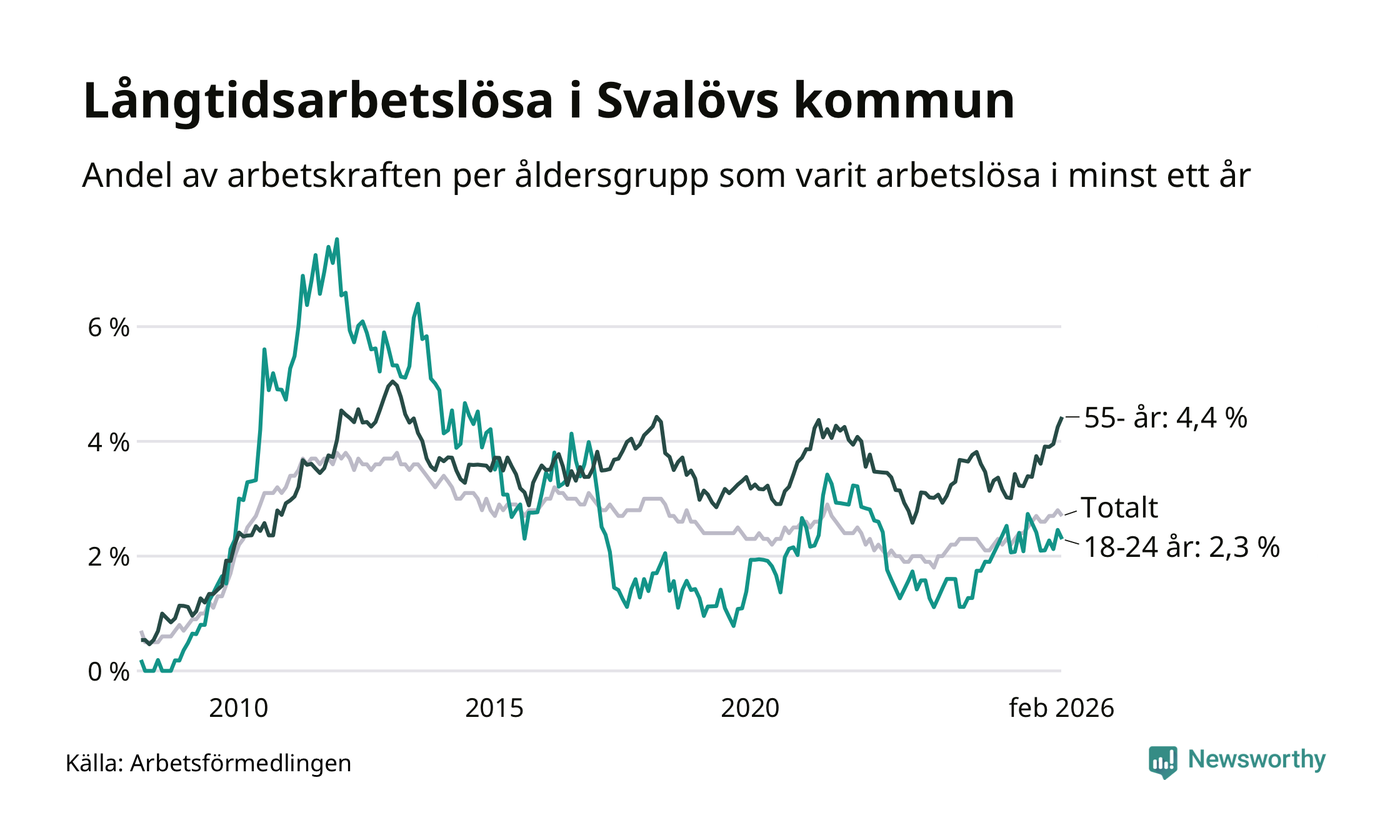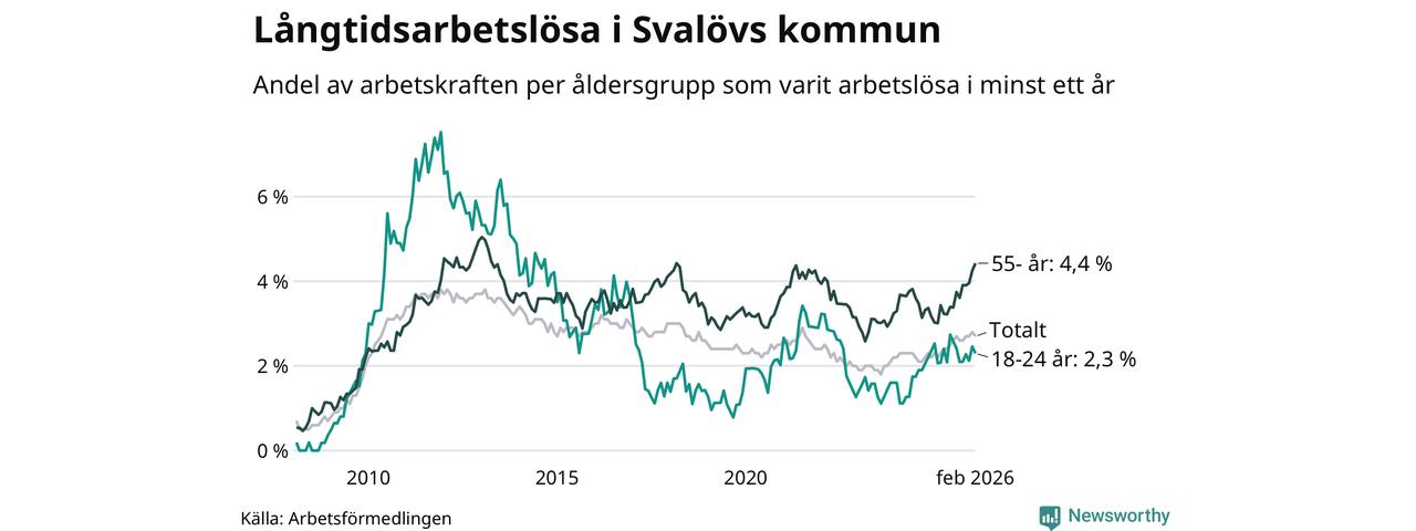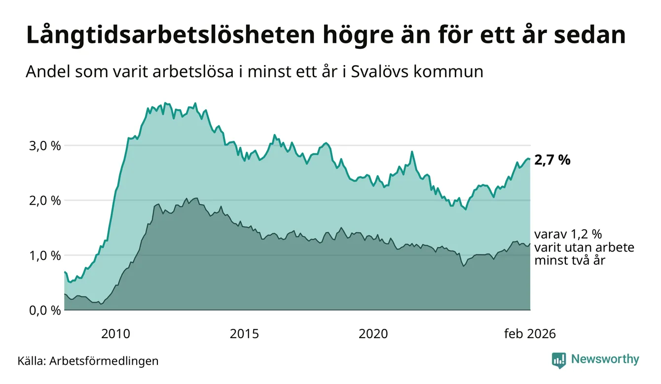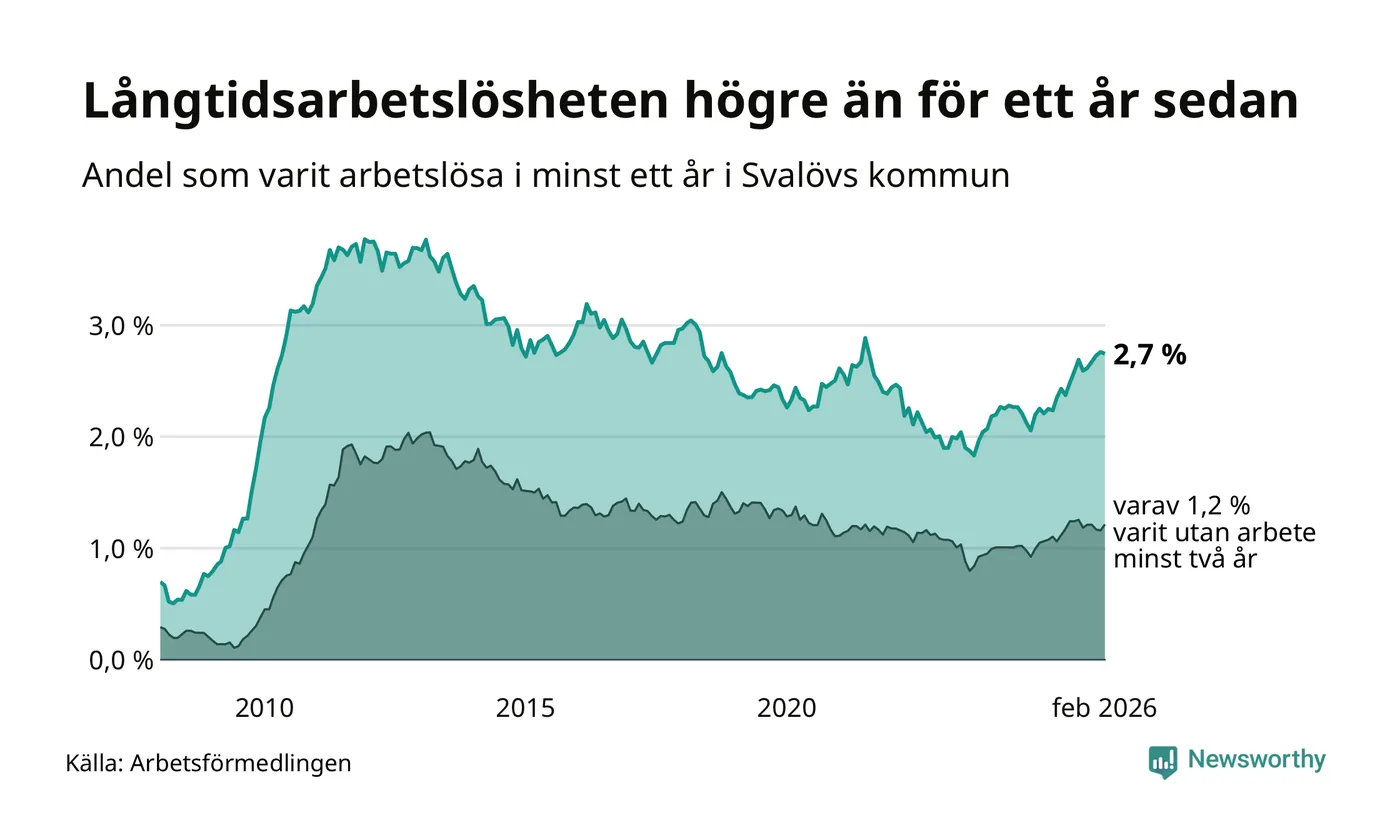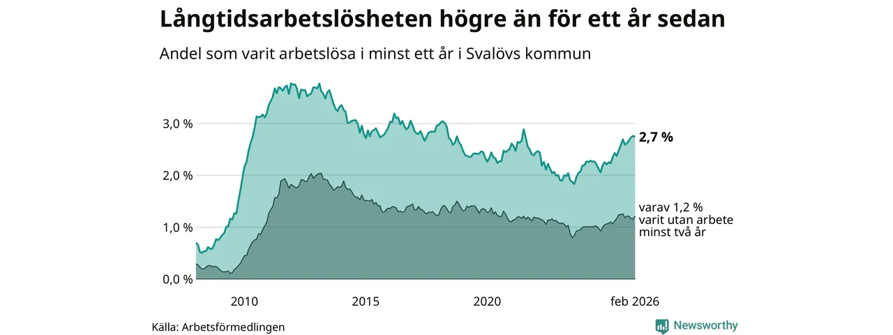 I februari hade 199 Svalövsbor varit arbetslösa i minst ett år, vilket är en färre än månaden innan. Det är den första månaden sedan september 2025 som antalet arbetslösa minskar. 199 personer motsvarar 2,7 procent av arbetskraften i kommunen – andelen långtidsarbetslösa är 0,5 procentenheter högre än samma månad för ett år sedan.