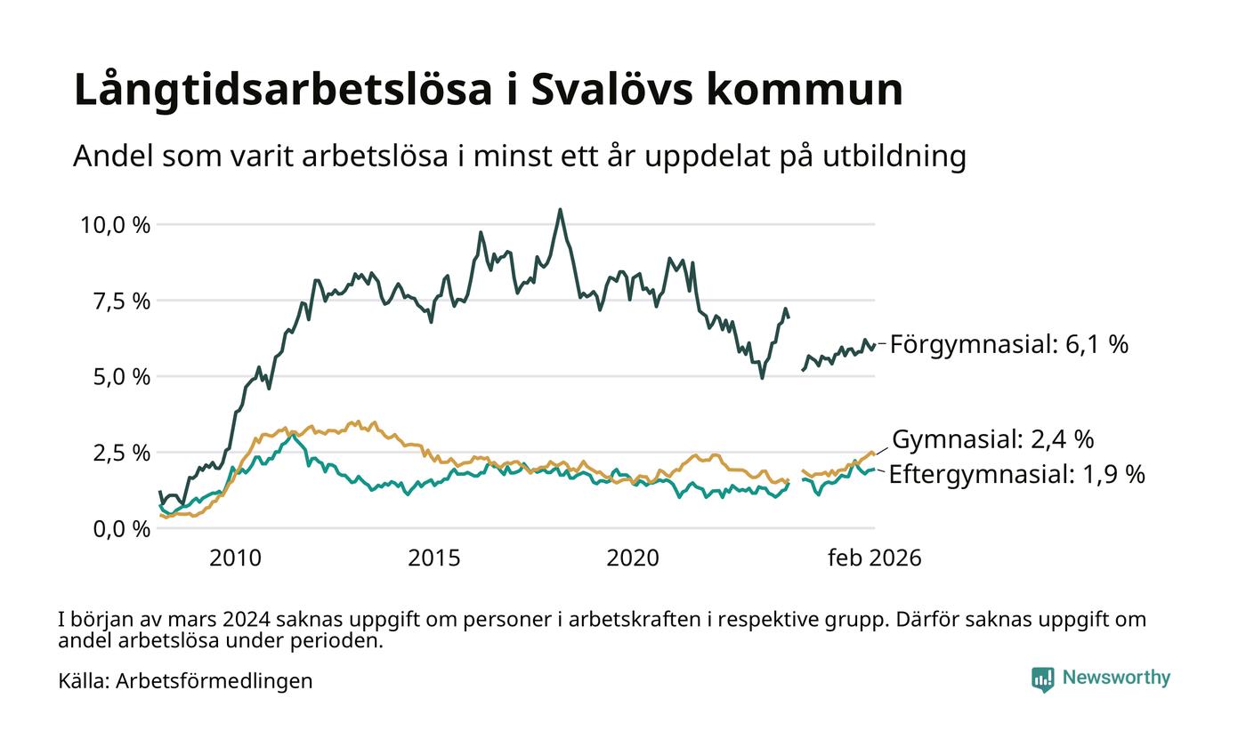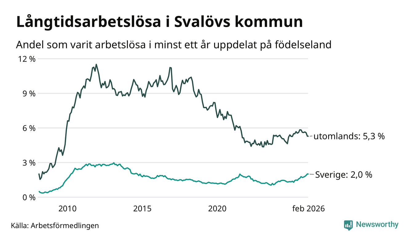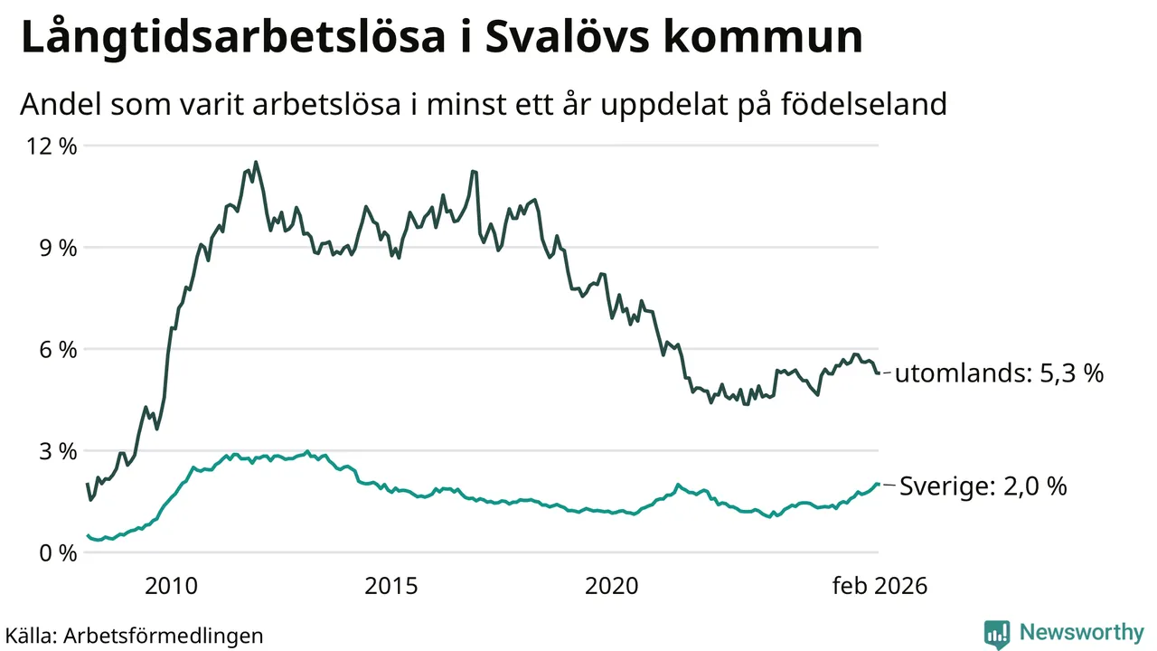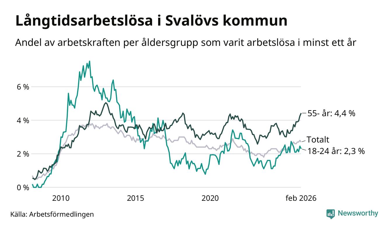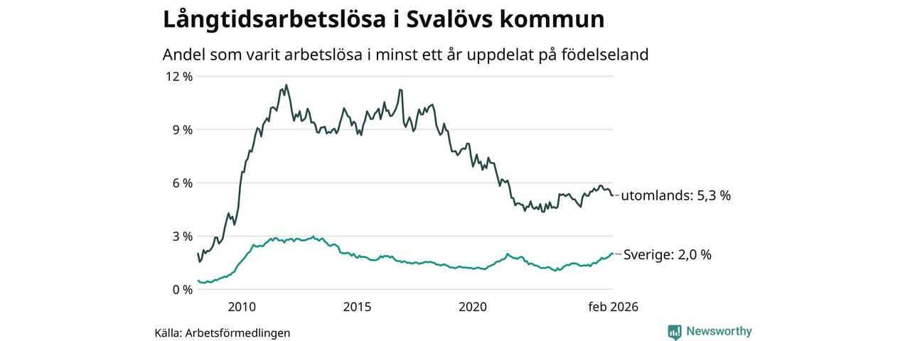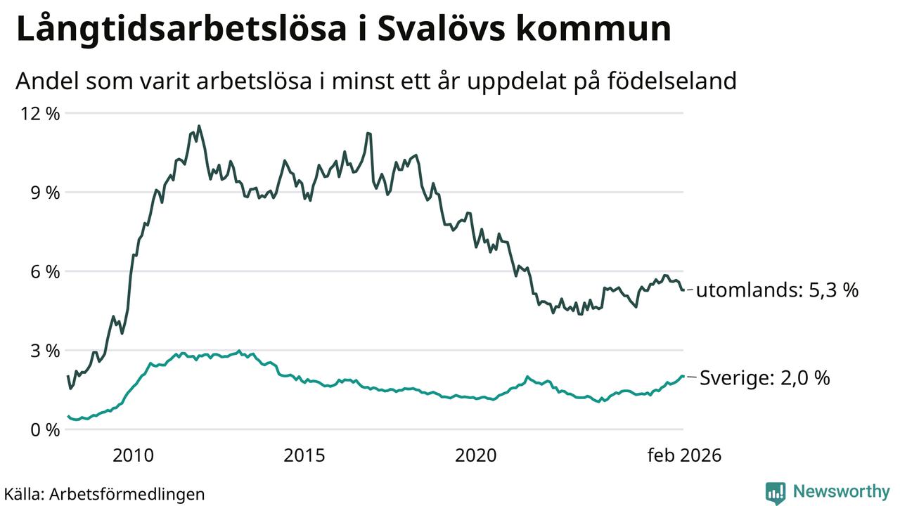 I februari hade 199 Svalövsbor varit arbetslösa i minst ett år, vilket är en färre än månaden innan. Det är den första månaden sedan september 2025 som antalet arbetslösa minskar. 199 personer motsvarar 2,7 procent av arbetskraften i kommunen – andelen långtidsarbetslösa är 0,5 procentenheter högre än samma månad för ett år sedan.