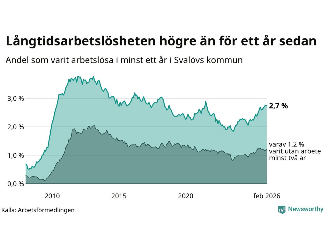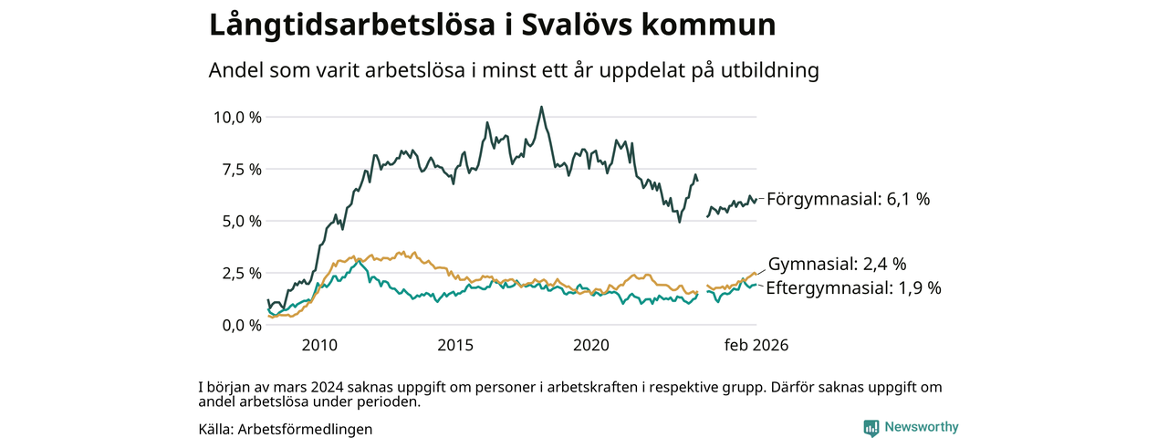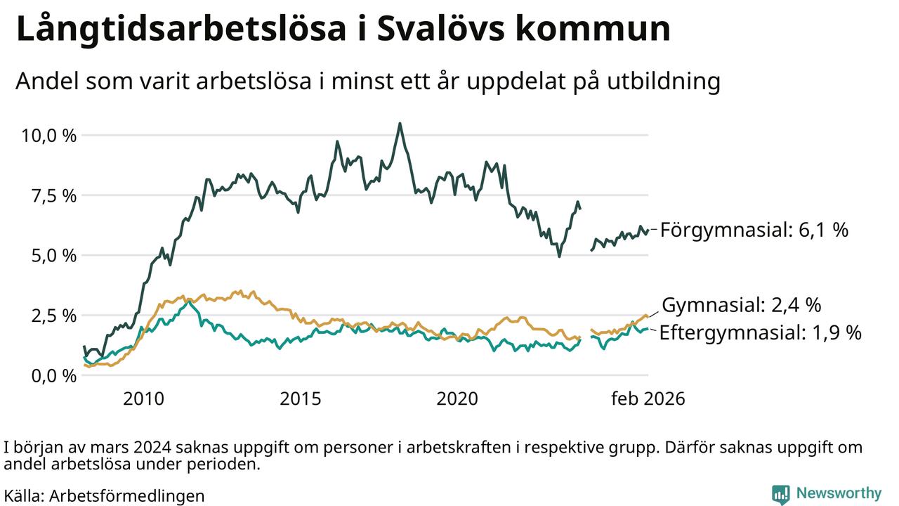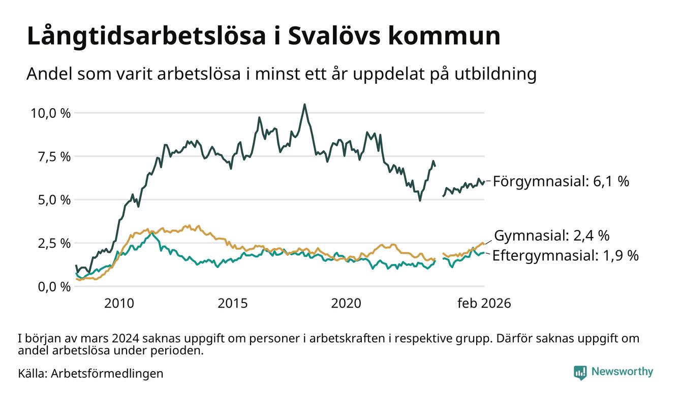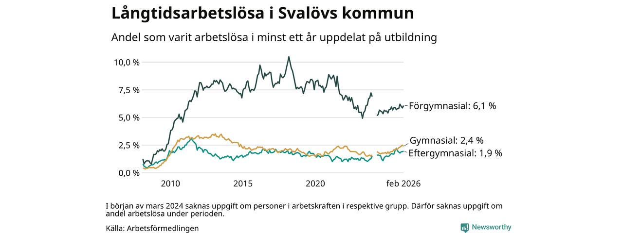 I februari hade 199 Svalövsbor varit arbetslösa i minst ett år, vilket är en färre än månaden innan. Det är den första månaden sedan september 2025 som antalet arbetslösa minskar. 199 personer motsvarar 2,7 procent av arbetskraften i kommunen – andelen långtidsarbetslösa är 0,5 procentenheter högre än samma månad för ett år sedan.