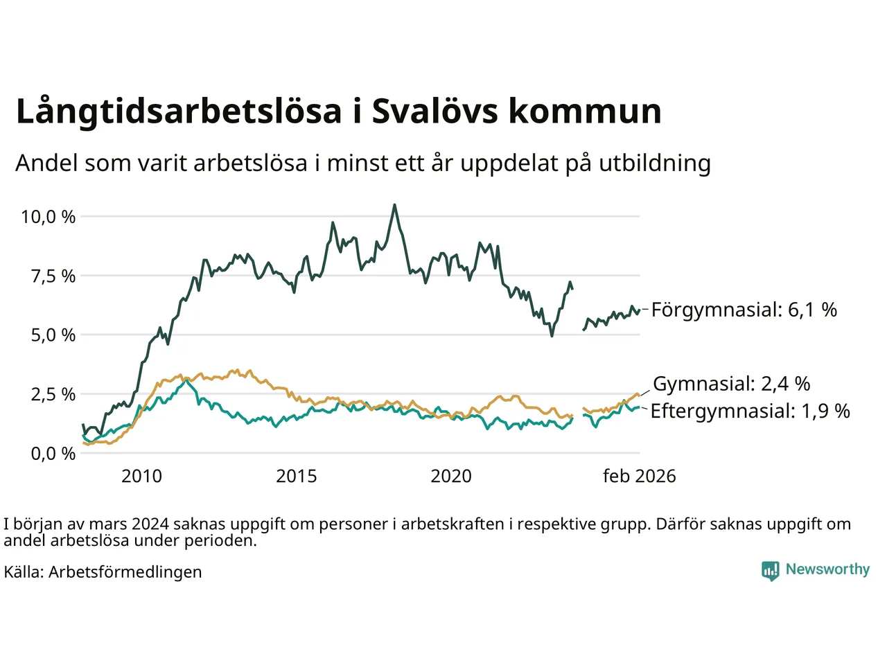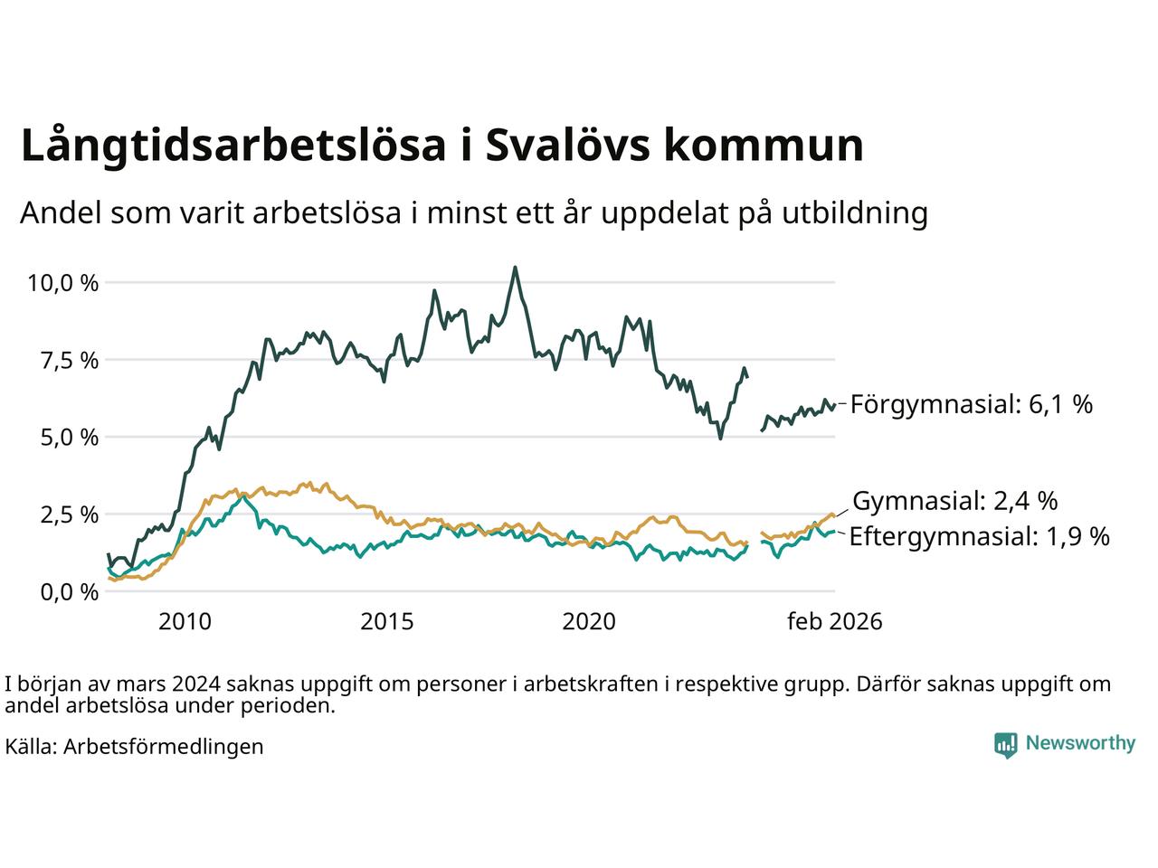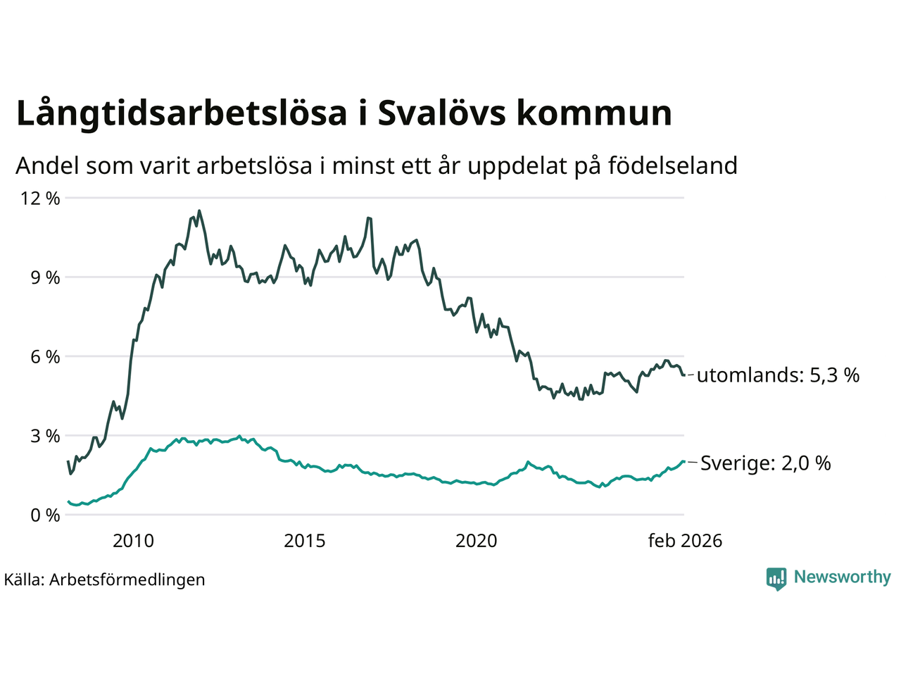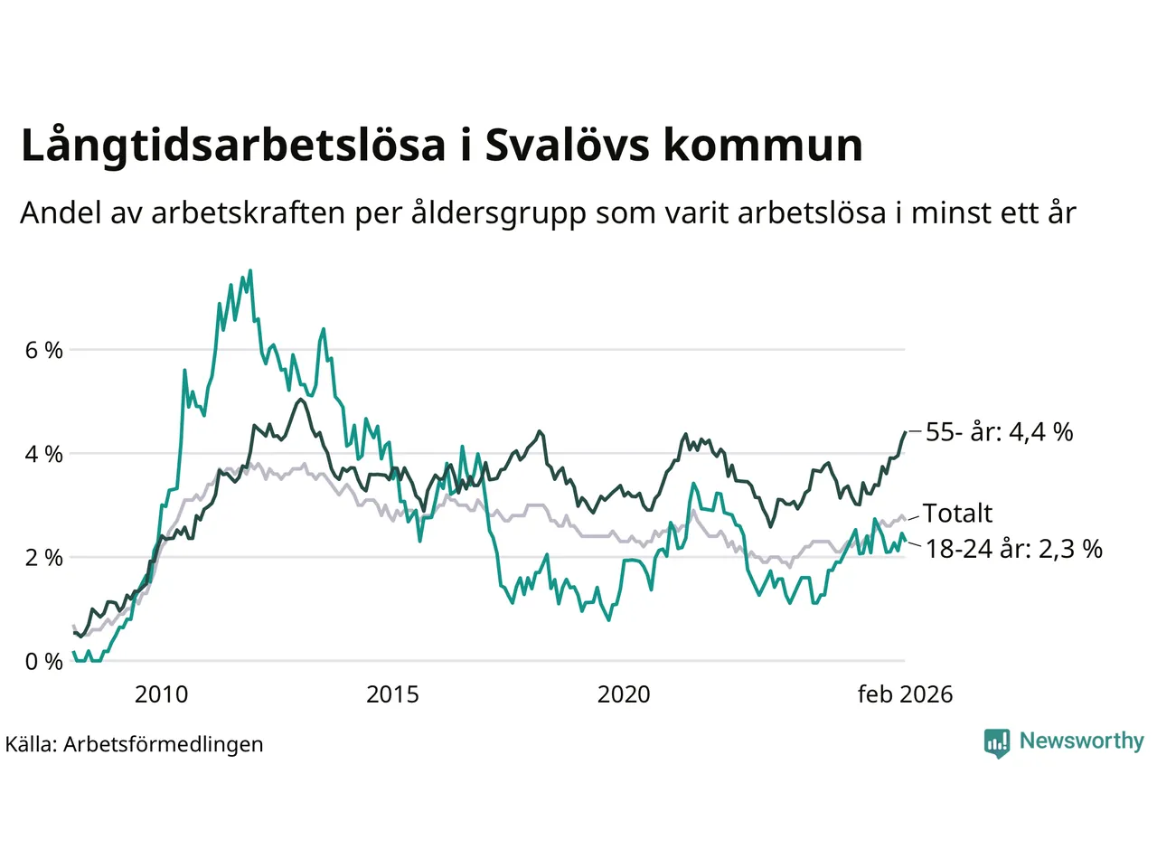I februari hade 199 Svalövsbor varit arbetslösa i minst ett år, vilket är en färre än månaden innan. Det är den första månaden sedan september 2025 som antalet arbetslösa minskar. 199 personer motsvarar 2,7 procent av arbetskraften i kommunen – andelen långtidsarbetslösa är 0,5 procentenheter högre än samma månad för ett år sedan.