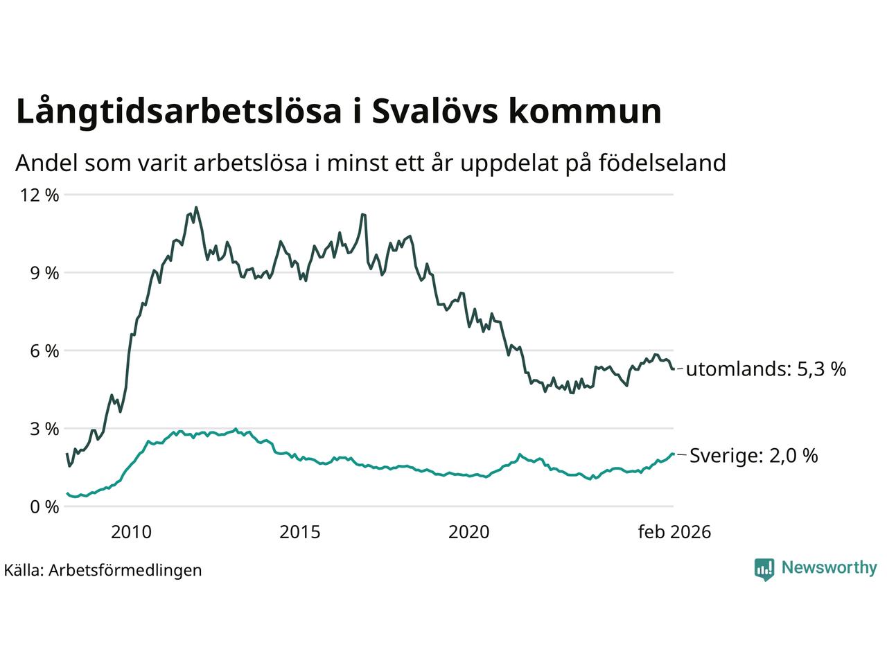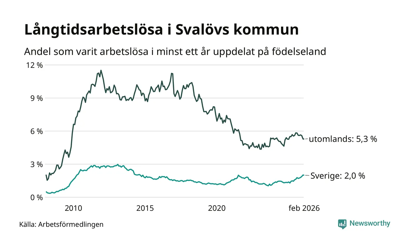 112 av de långtidsarbetslösa i Svalöv är födda i Sverige, medan 87 är födda utomlands. Det innebär att långtidsarbetslösheten bland Sverigefödda är 2,0 procent, medan den är tre gånger så hög – 5,3 procent – bland födda utomlands. Även i riket som helhet är arbetslösheten högre bland utrikesfödda.