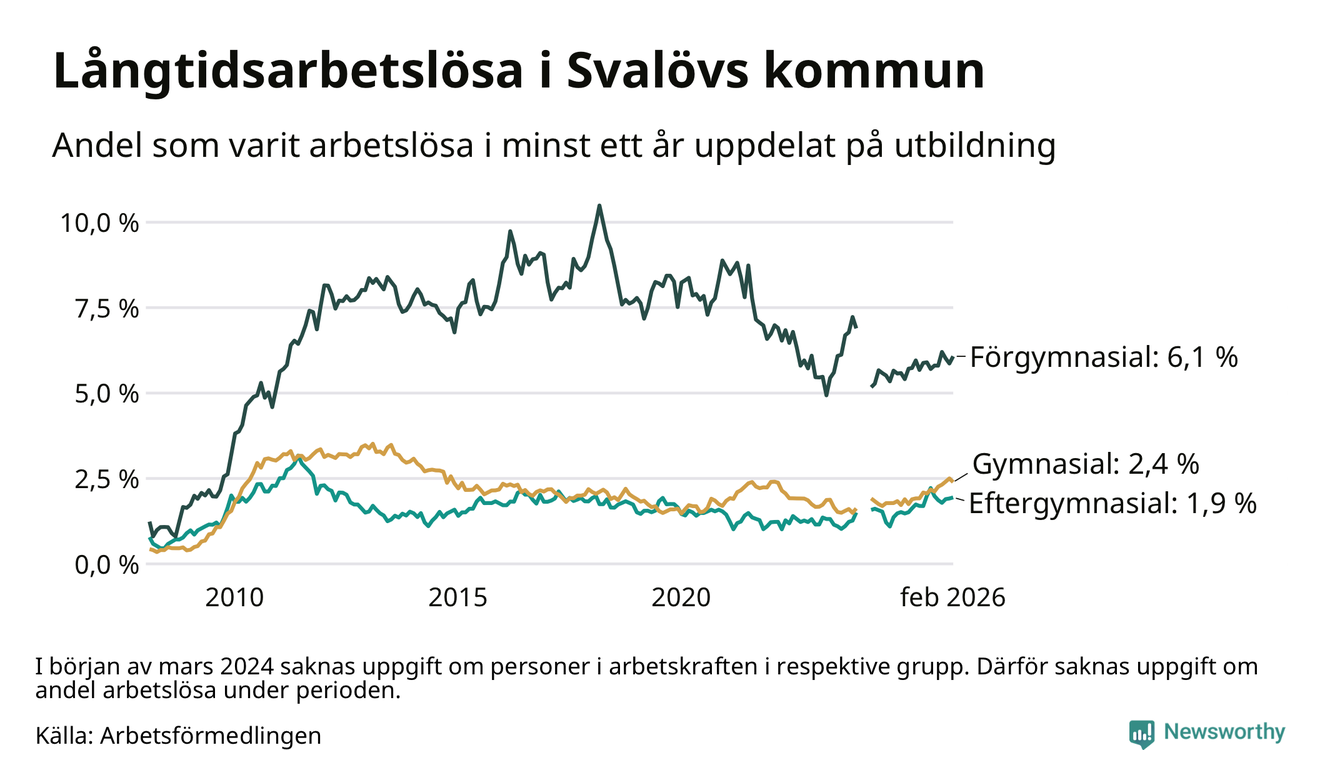 Andelen som varit utan arbete i minst ett år i Svalöv i februari var högre än för ett år sedan. Men jämfört med i januari har antalet långtidsarbetslösa minskat.