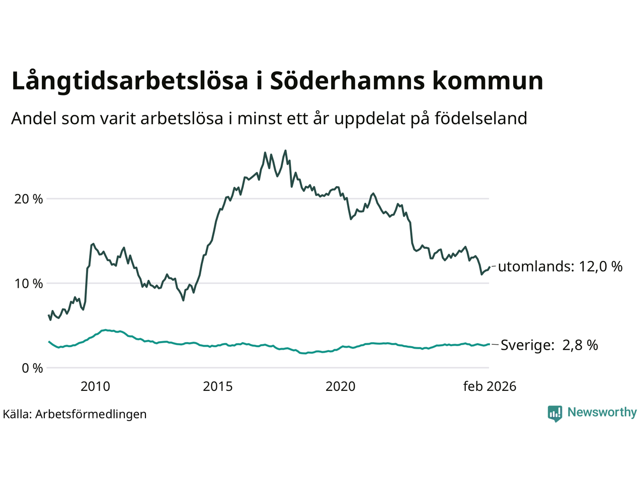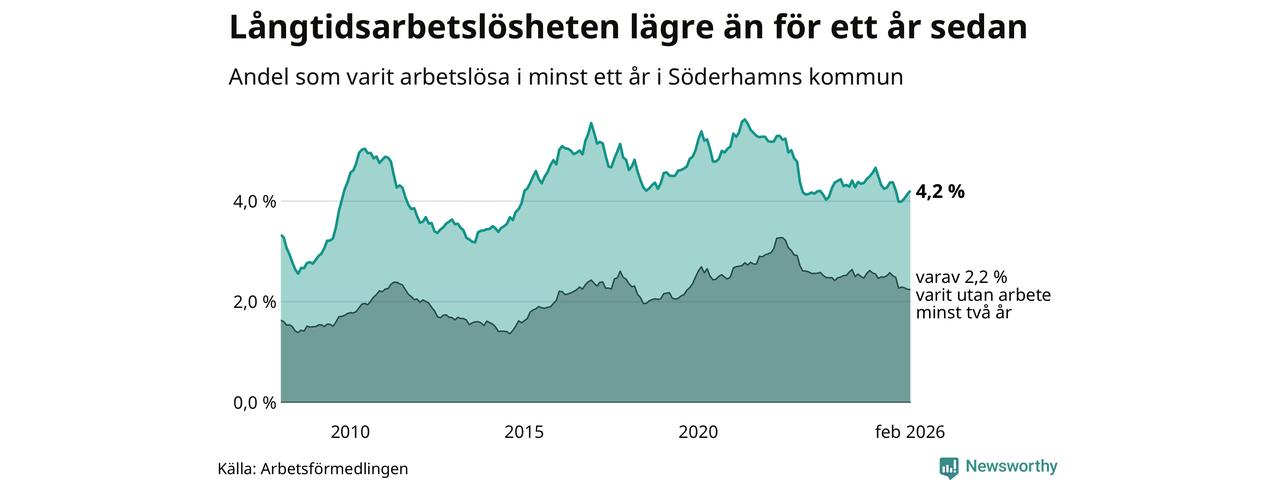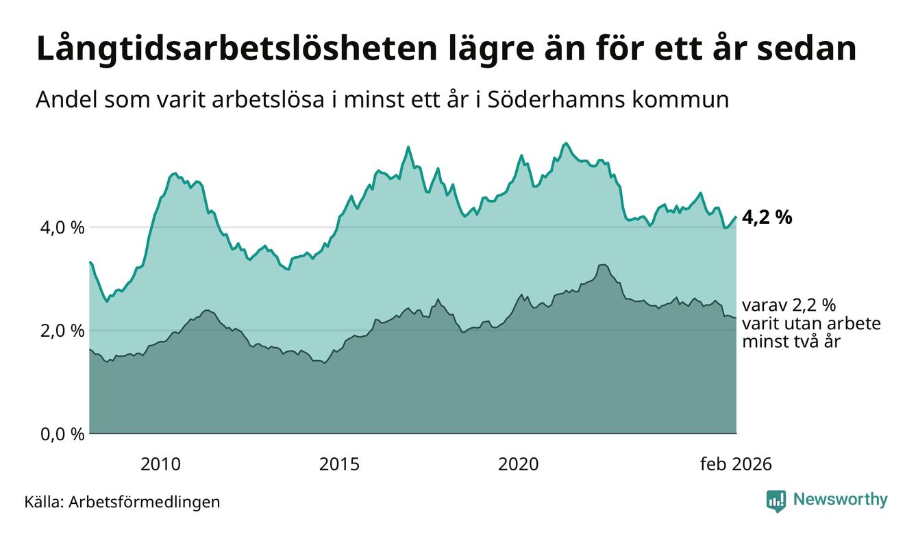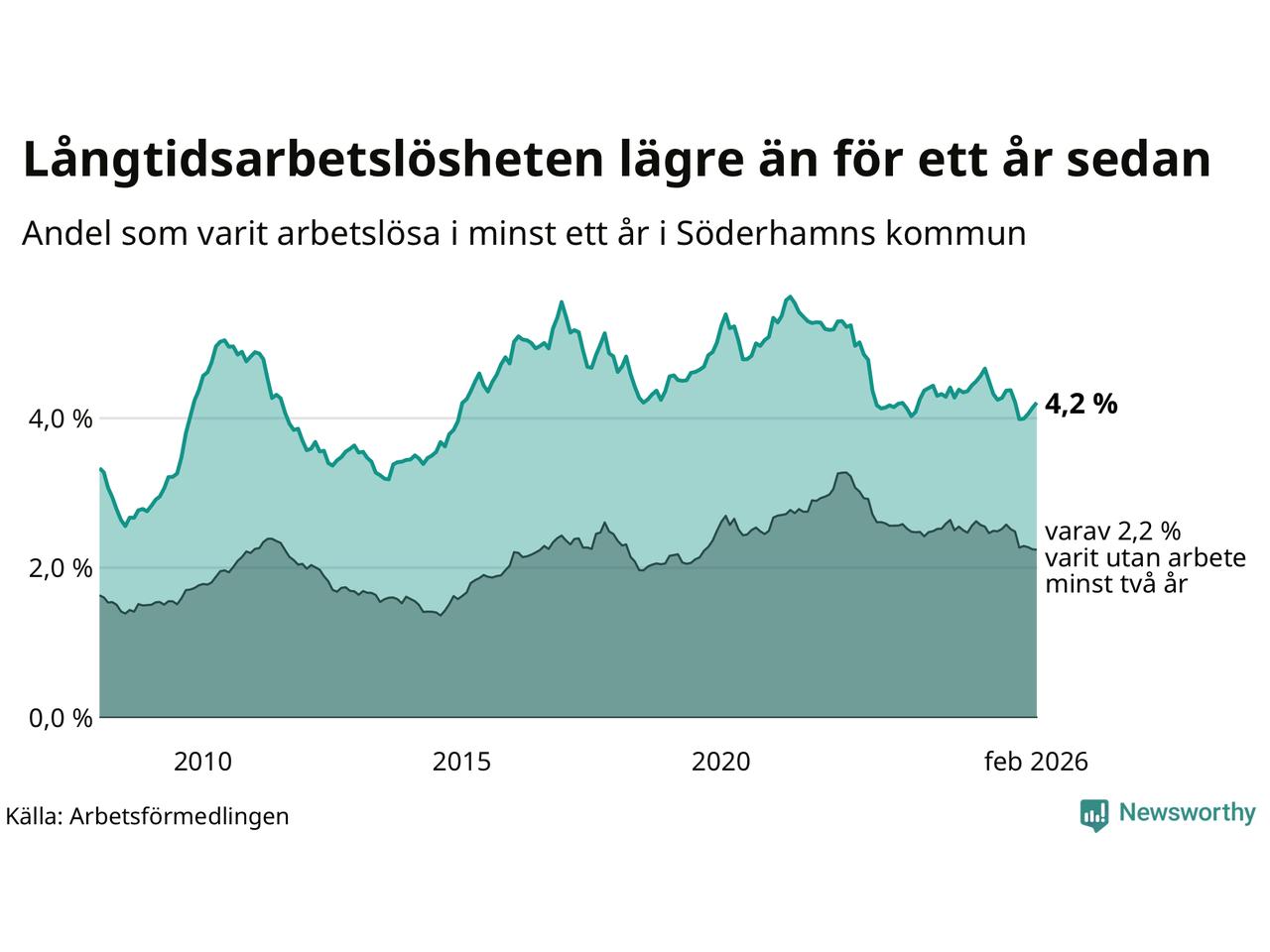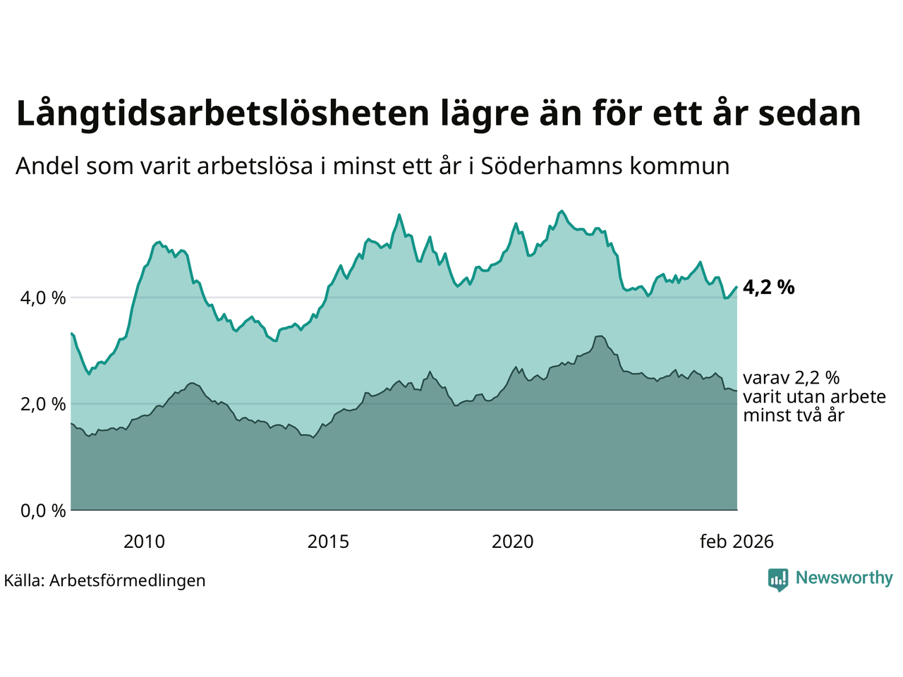 I februari hade 460 Söderhamnsbor varit arbetslösa i minst ett år, vilket är sju fler än månaden innan. 460 personer motsvarar 4,2 procent av arbetskraften i kommunen – andelen långtidsarbetslösa är 0,5 procentenheter lägre än samma månad för ett år sedan. Söderhamn tillhör de kommuner som har högst andel långtidsarbetslösa i hela landet just nu.