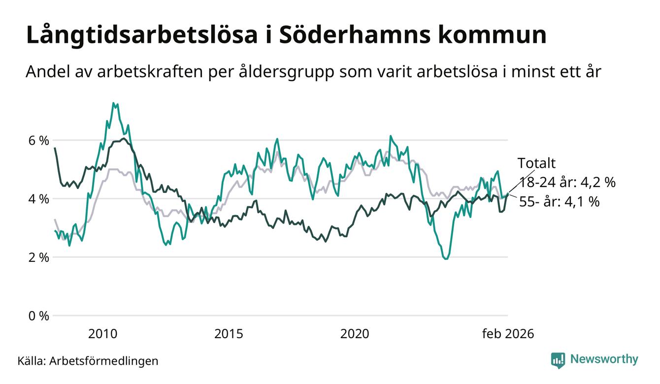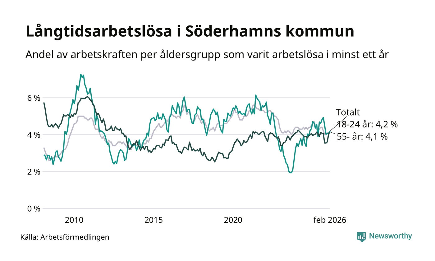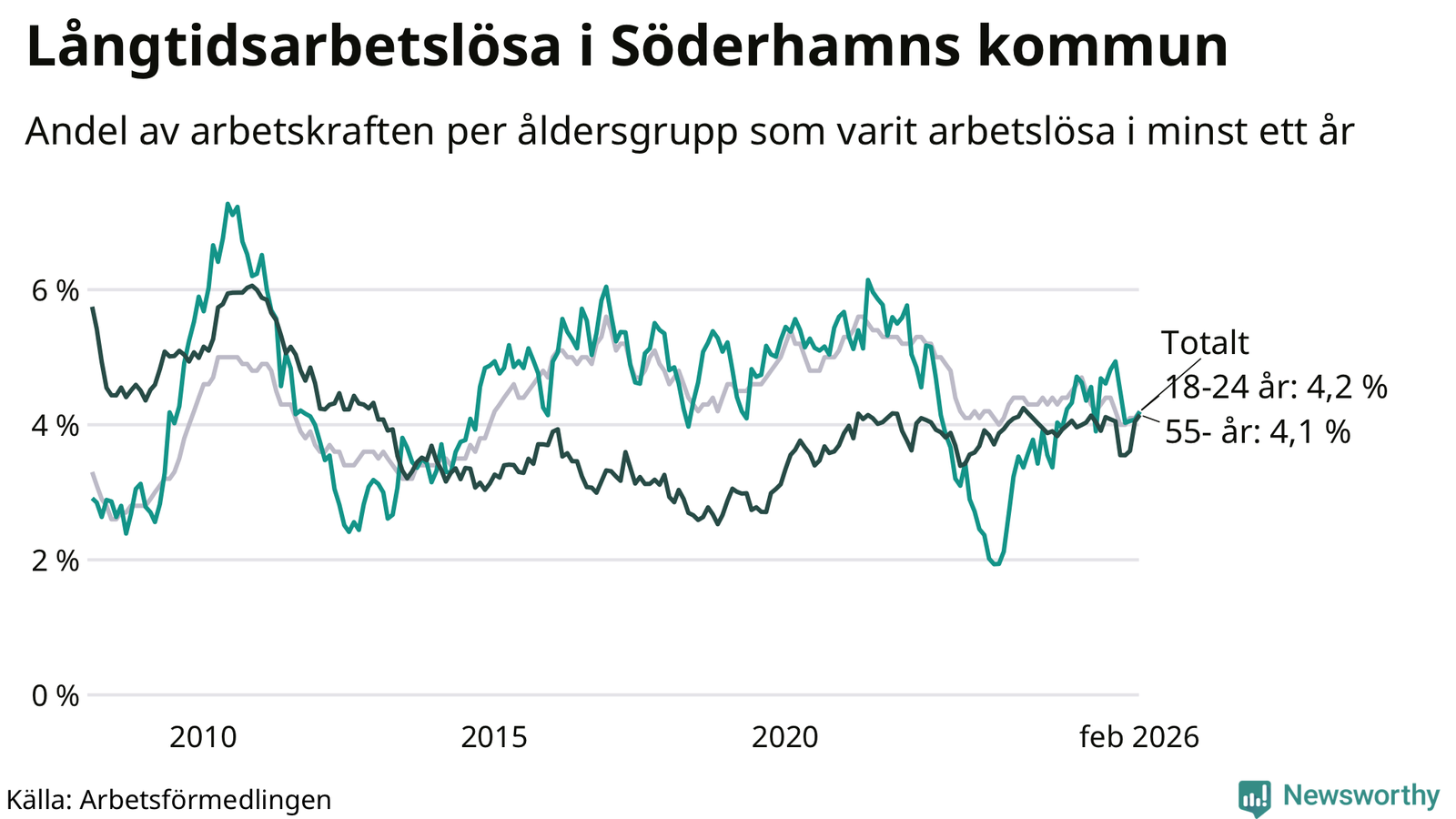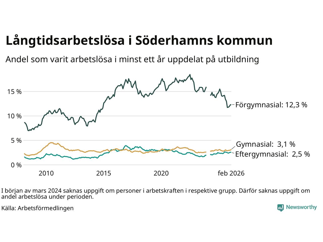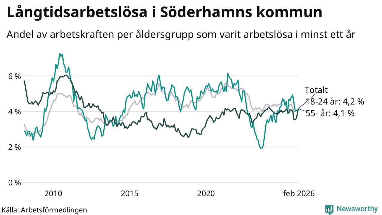 I februari hade 460 Söderhamnsbor varit arbetslösa i minst ett år, vilket är sju fler än månaden innan. 460 personer motsvarar 4,2 procent av arbetskraften i kommunen – andelen långtidsarbetslösa är 0,5 procentenheter lägre än samma månad för ett år sedan. Söderhamn tillhör de kommuner som har högst andel långtidsarbetslösa i hela landet just nu.