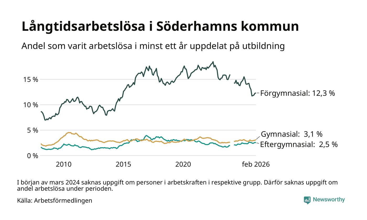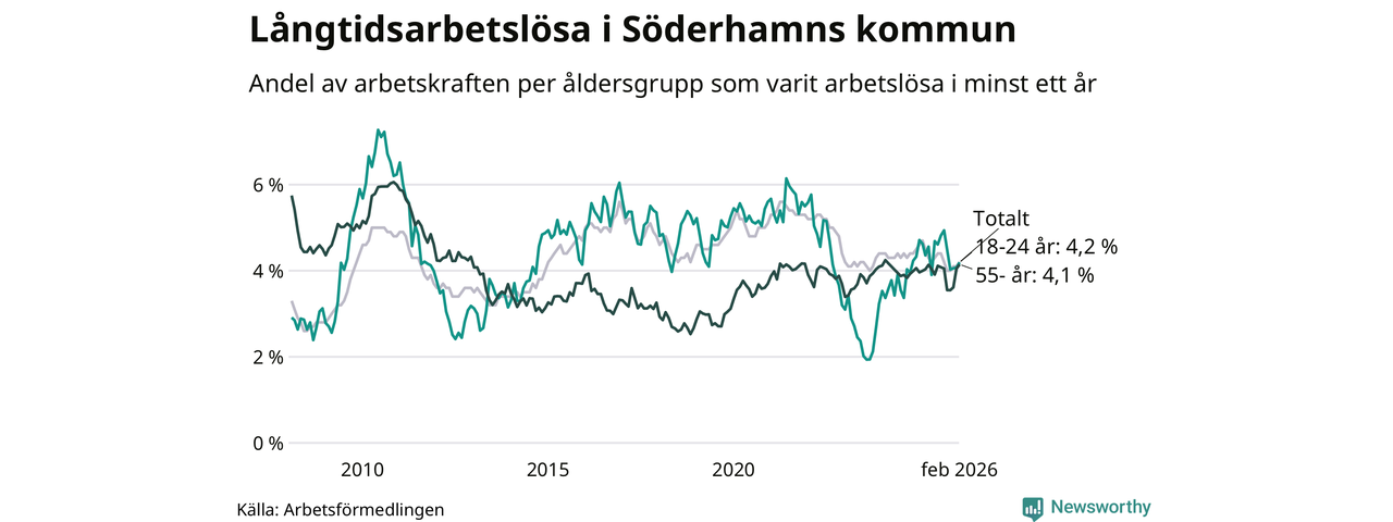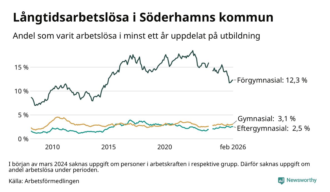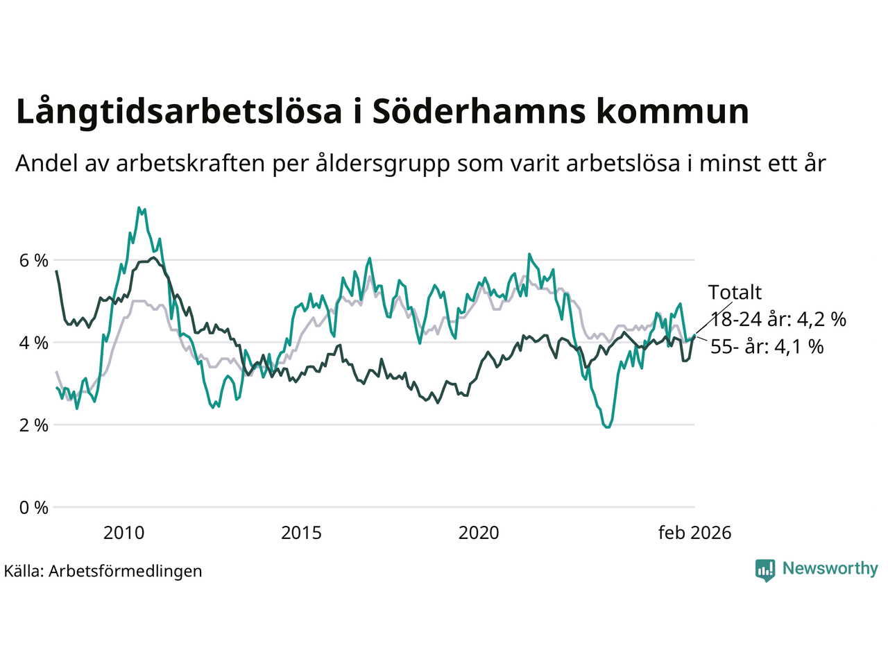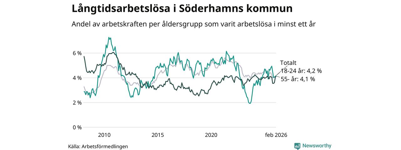 I februari hade 460 Söderhamnsbor varit arbetslösa i minst ett år, vilket är sju fler än månaden innan. 460 personer motsvarar 4,2 procent av arbetskraften i kommunen – andelen långtidsarbetslösa är 0,5 procentenheter lägre än samma månad för ett år sedan. Söderhamn tillhör de kommuner som har högst andel långtidsarbetslösa i hela landet just nu.