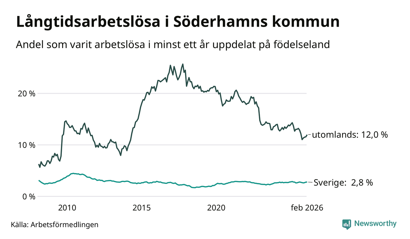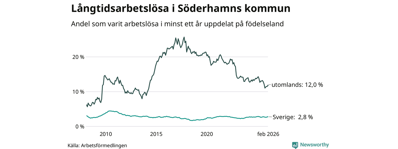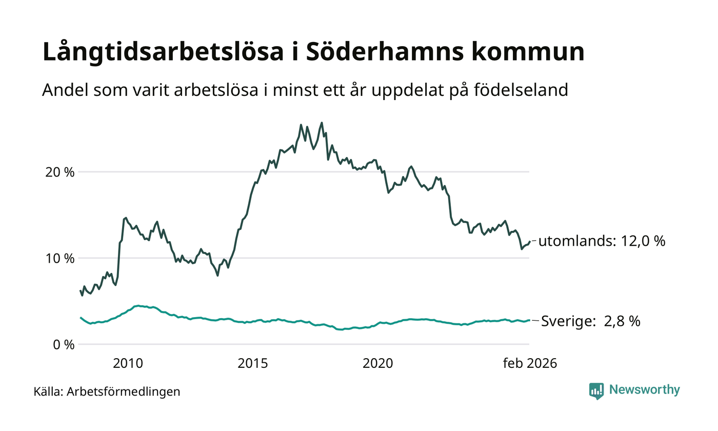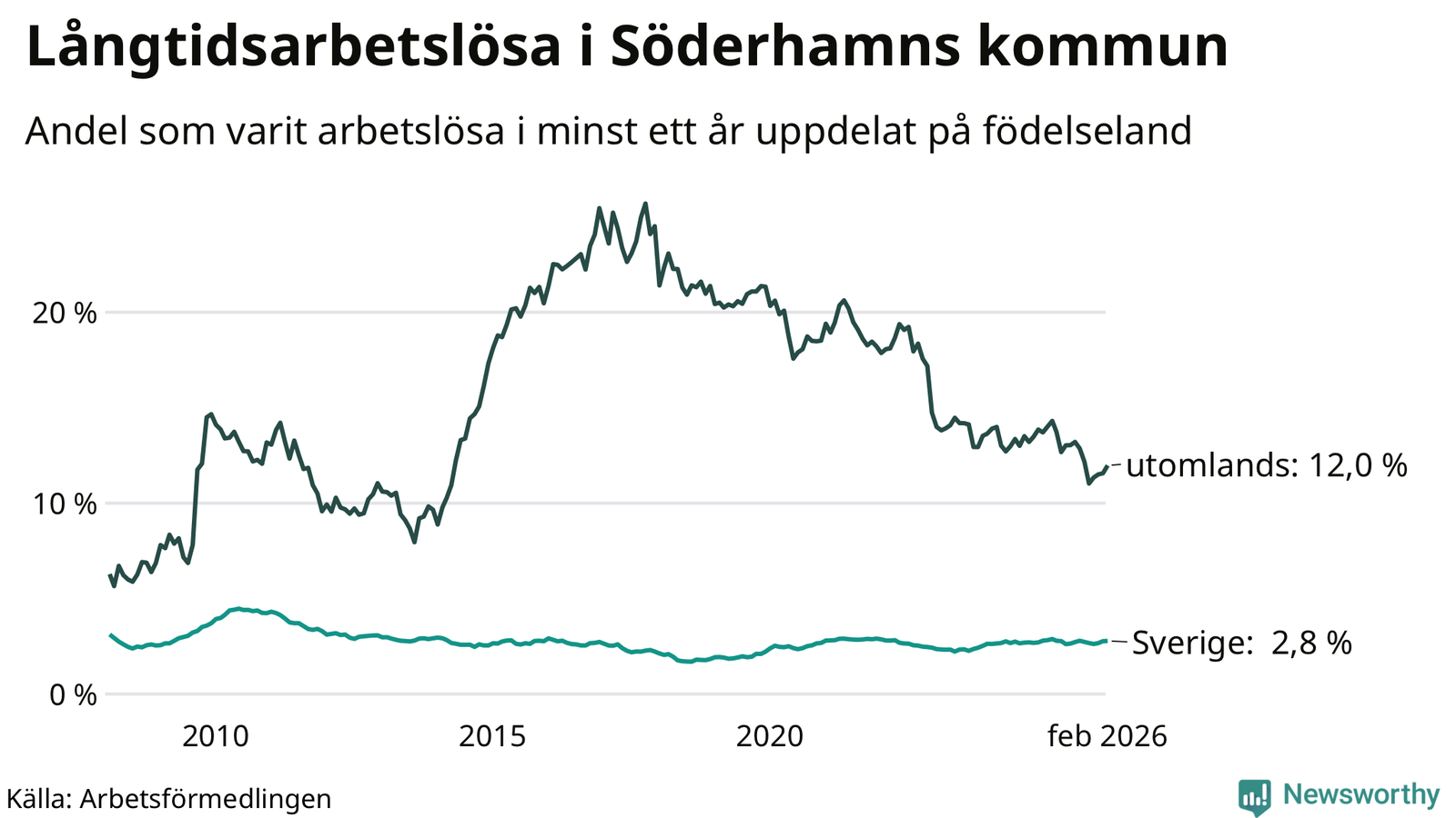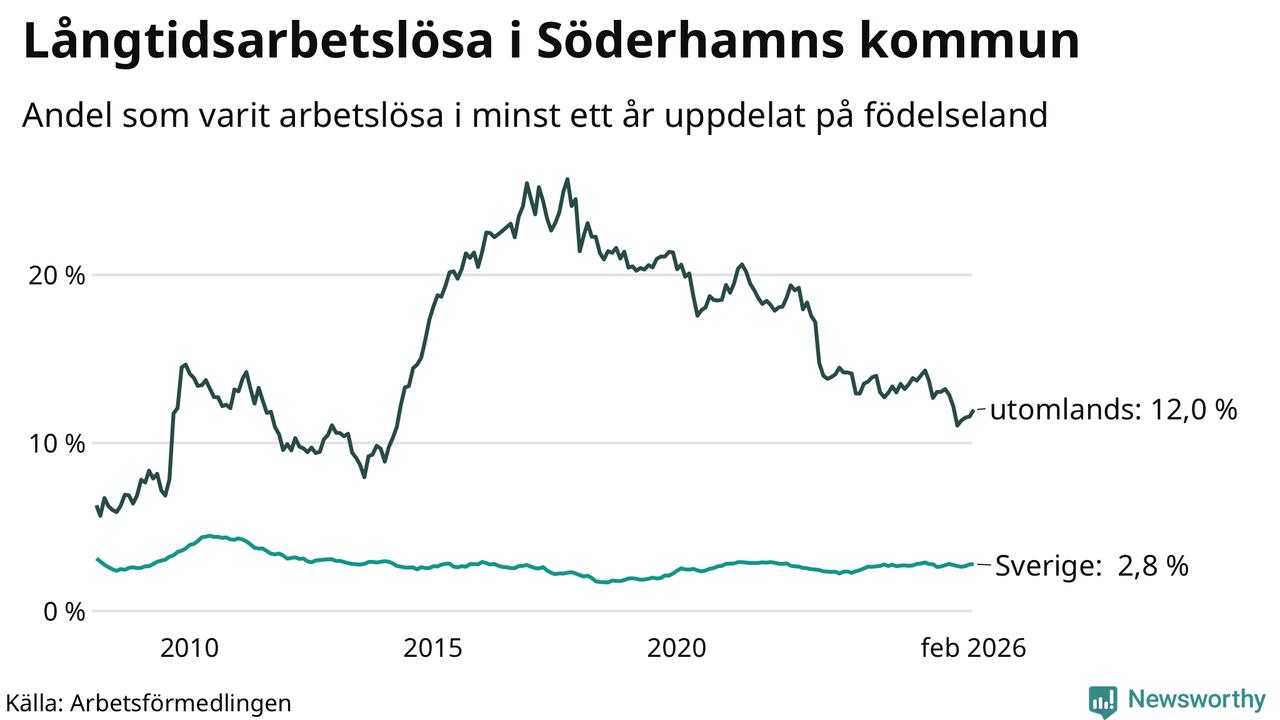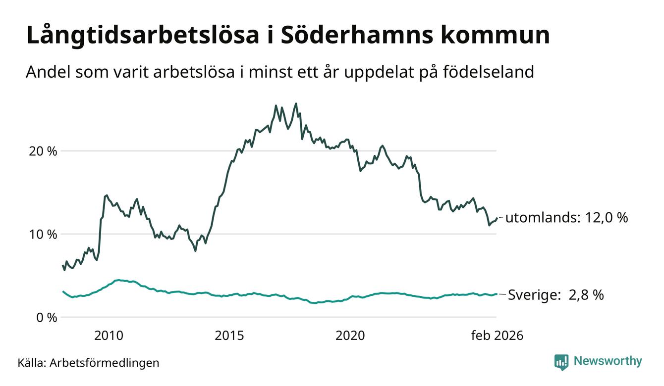 257 av de långtidsarbetslösa i Söderhamn är födda i Sverige, medan 203 är födda utomlands. Det innebär att långtidsarbetslösheten bland Sverigefödda är 2,8 procent, medan den är fyra gånger så hög – 12,0 procent – bland födda utomlands. Även i riket som helhet är arbetslösheten högre bland utrikesfödda.