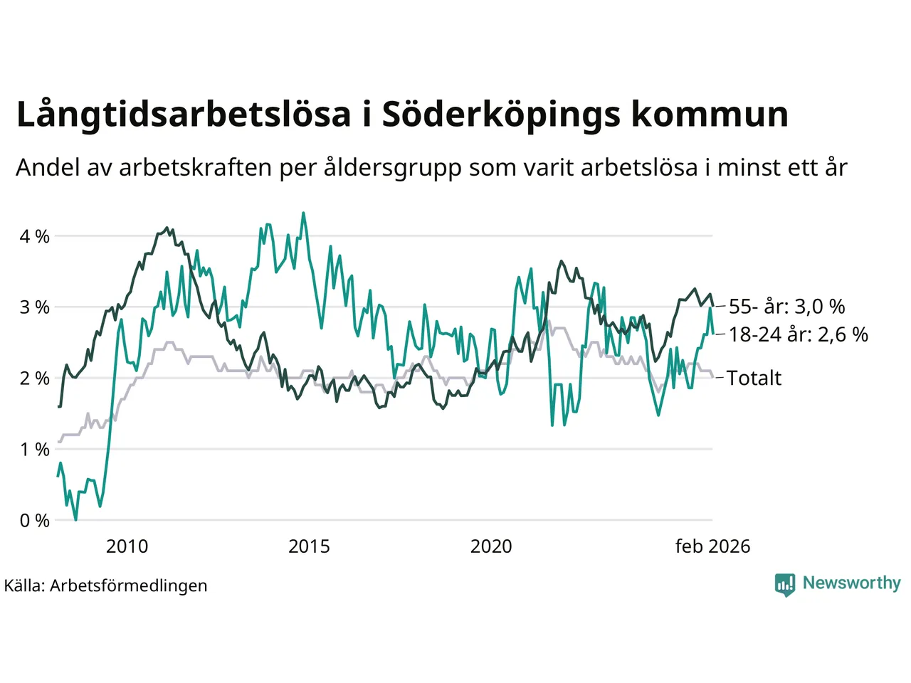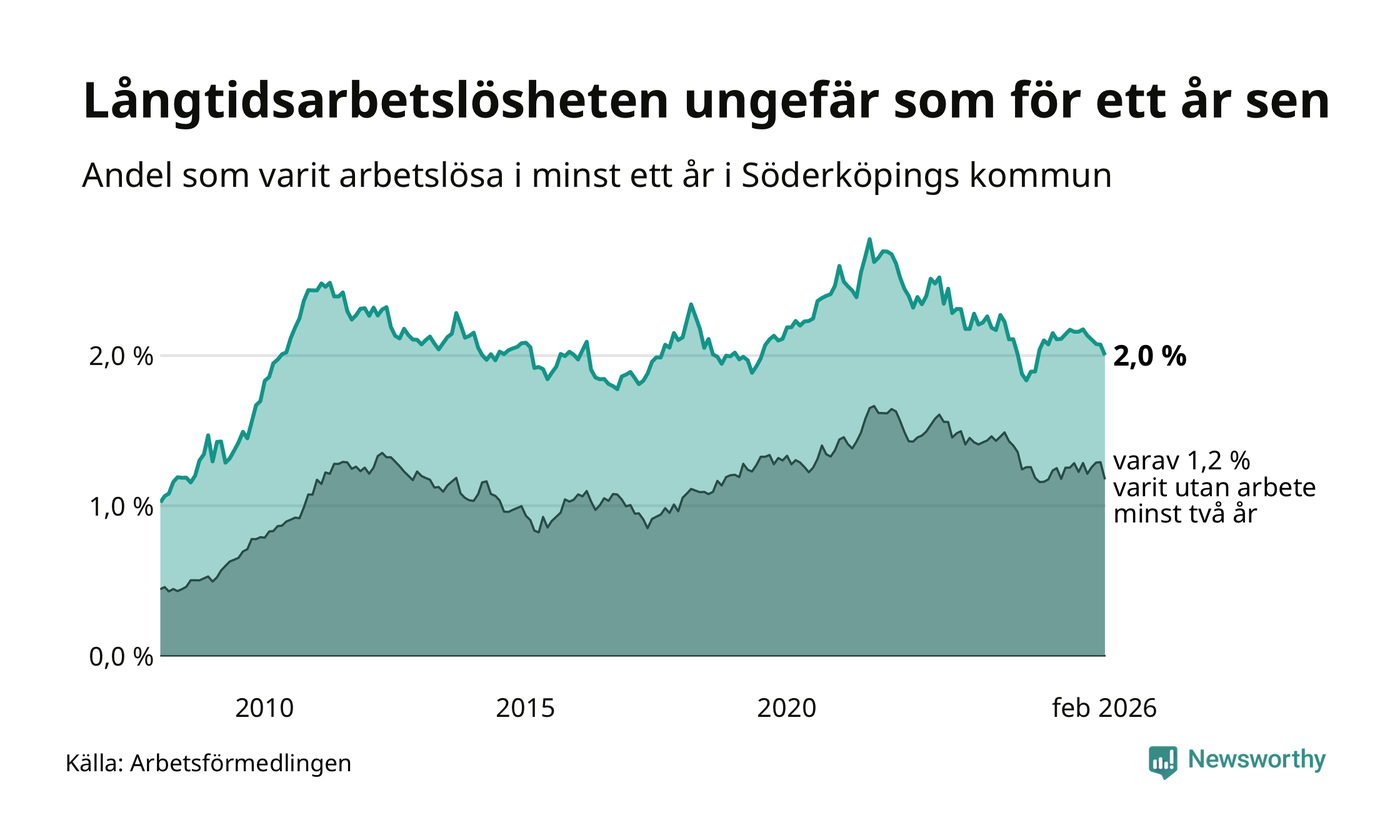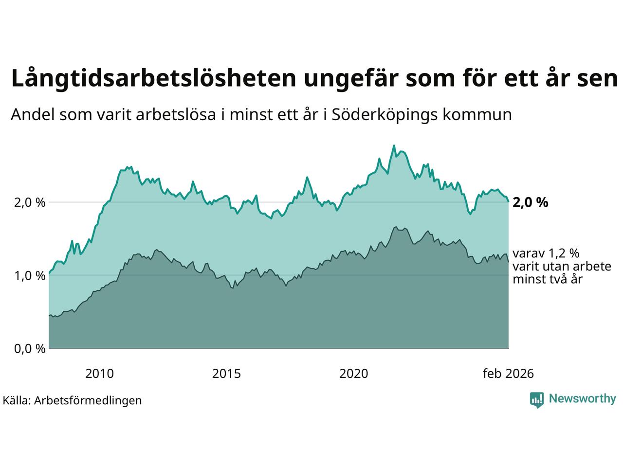 I februari hade 138 Söderköpingsbor varit arbetslösa i minst ett år, vilket är fem färre än månaden innan. 138 personer motsvarar 2,0 procent av arbetskraften i kommunen – andelen långtidsarbetslösa är ungefär på samma nivå som för ett år sedan.