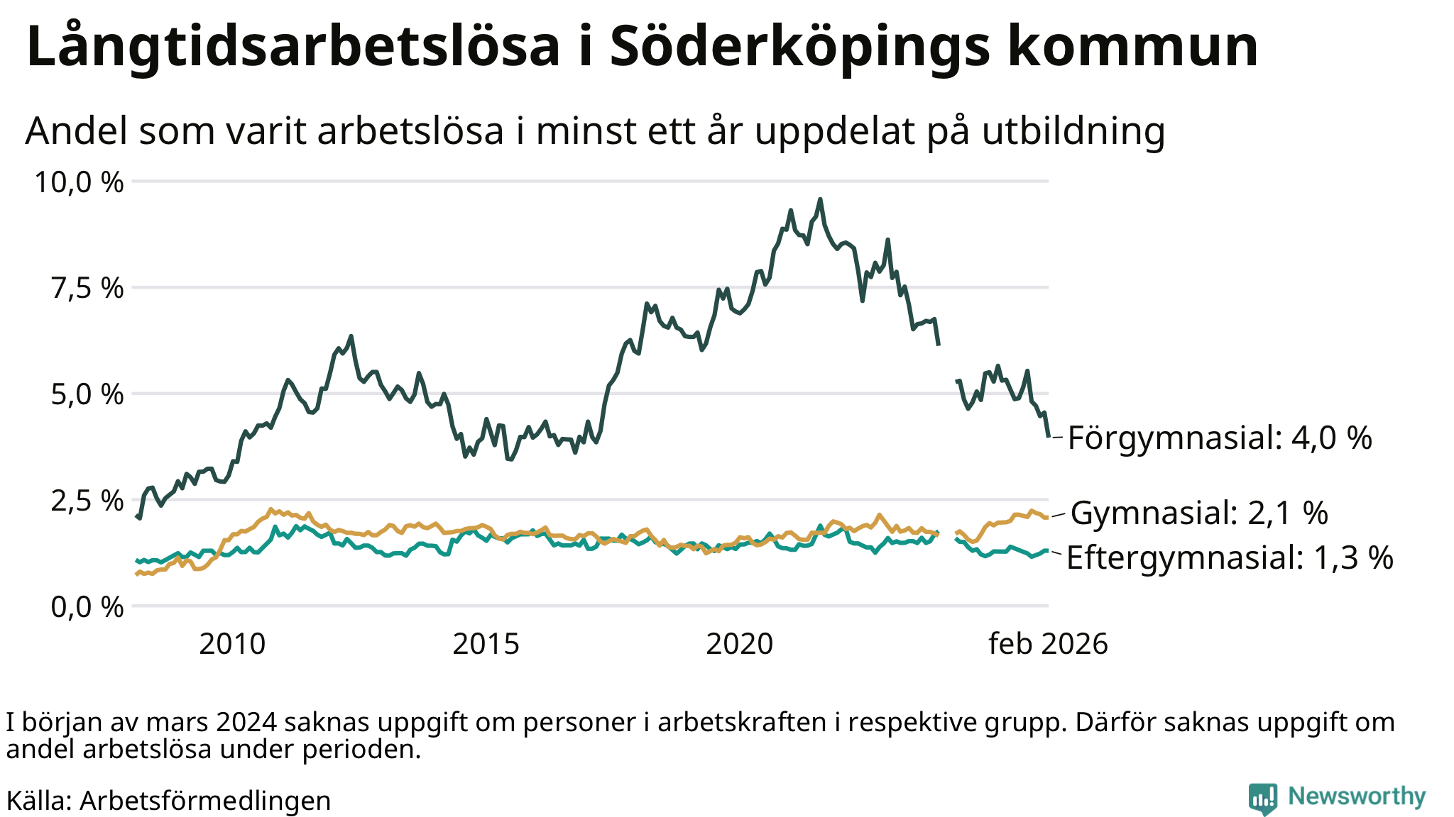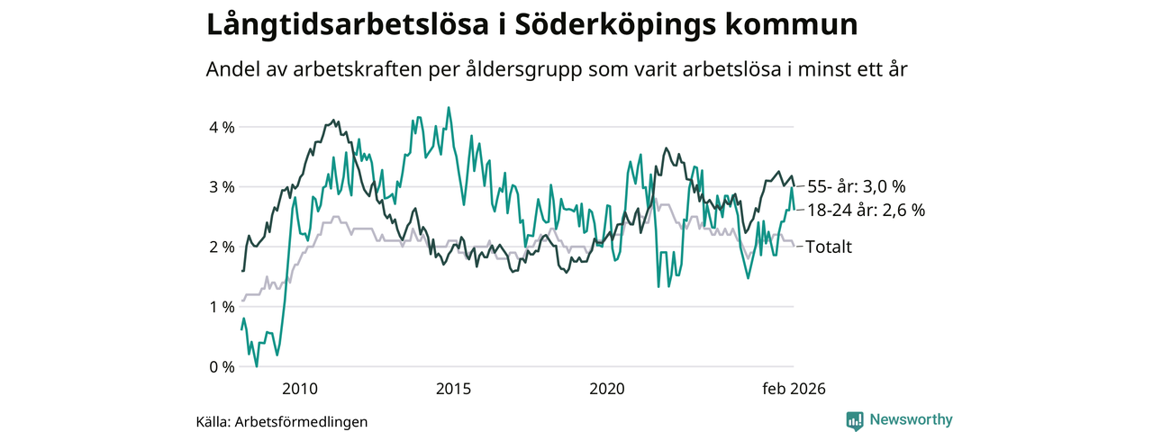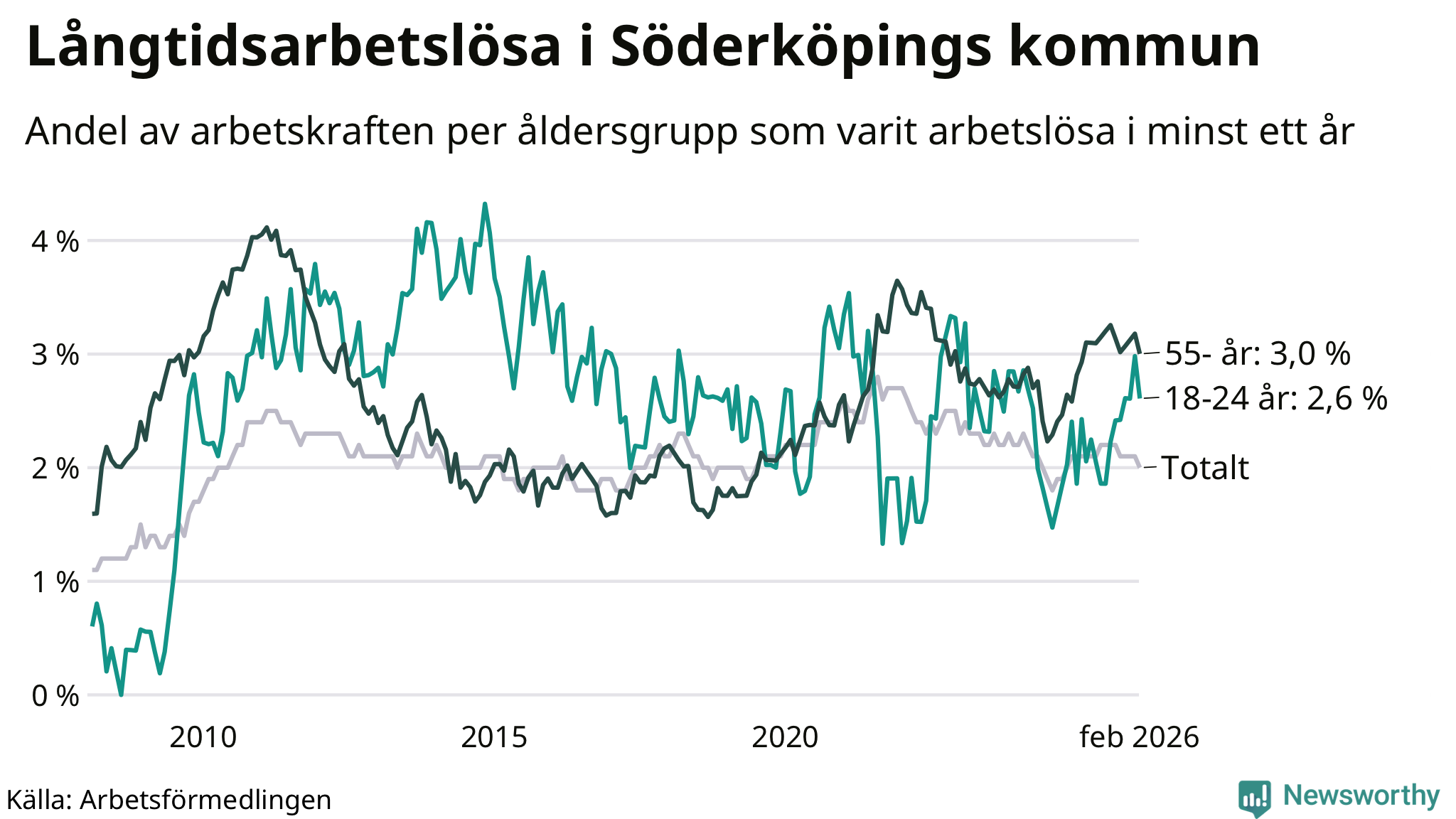 I februari hade 138 Söderköpingsbor varit arbetslösa i minst ett år, vilket är fem färre än månaden innan. 138 personer motsvarar 2,0 procent av arbetskraften i kommunen – andelen långtidsarbetslösa är ungefär på samma nivå som för ett år sedan.