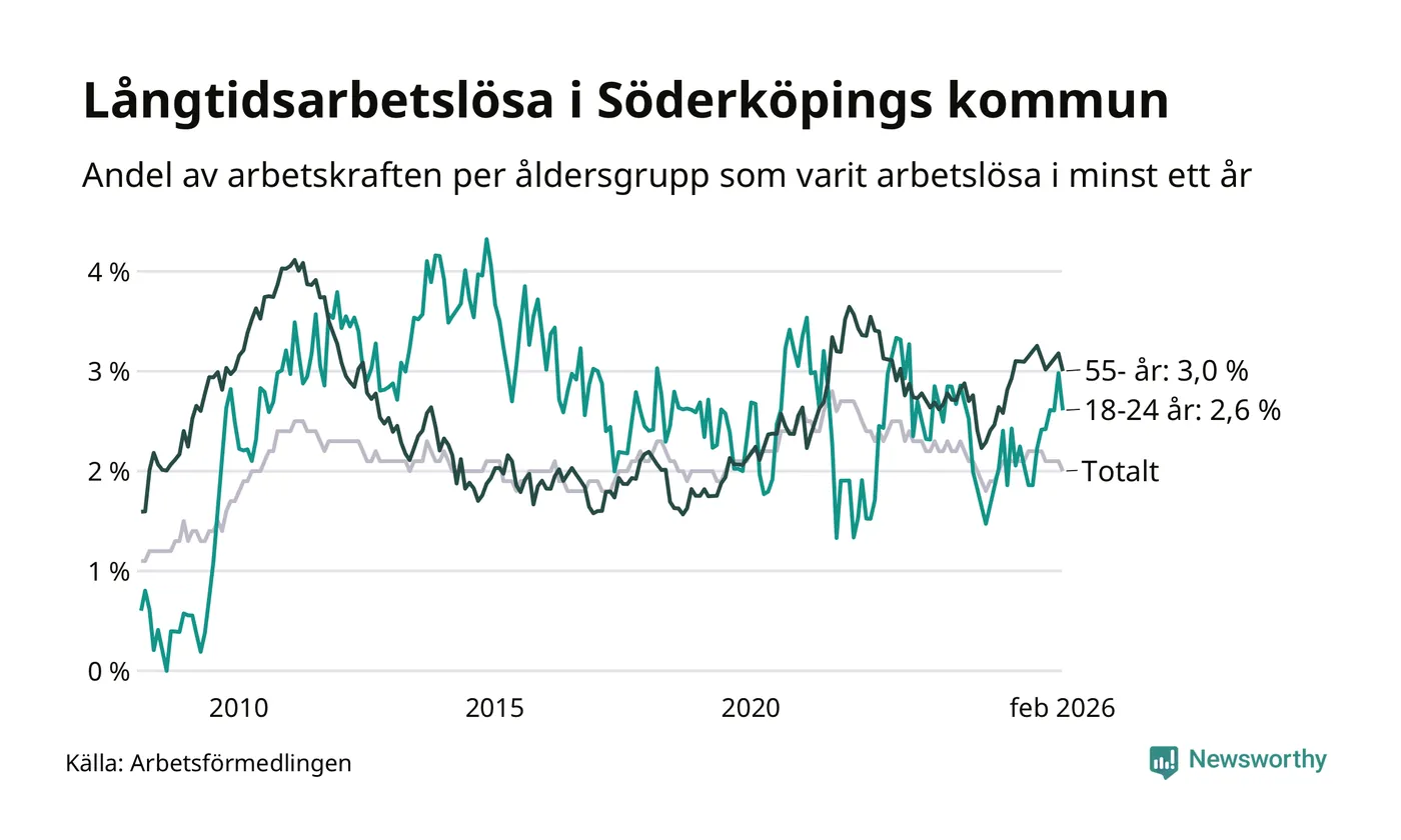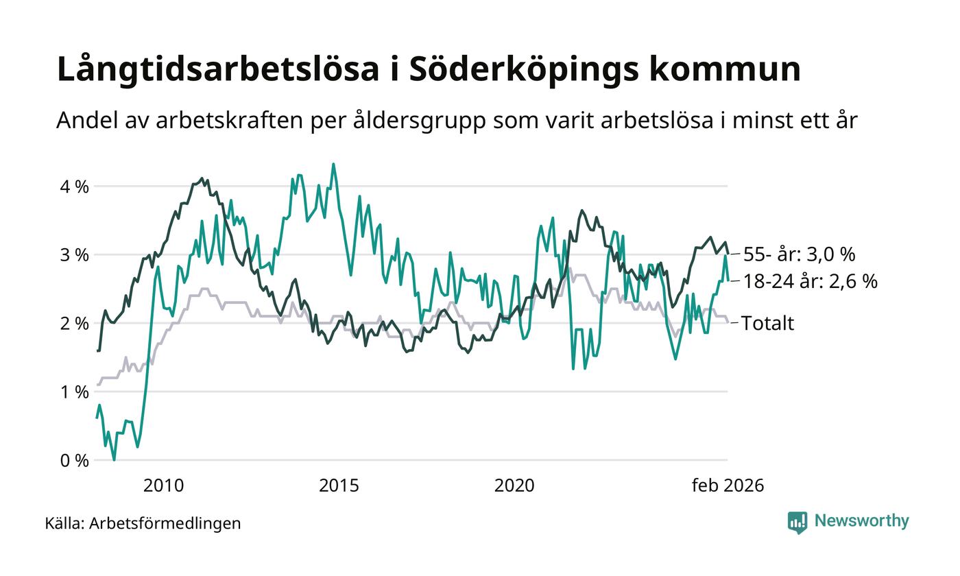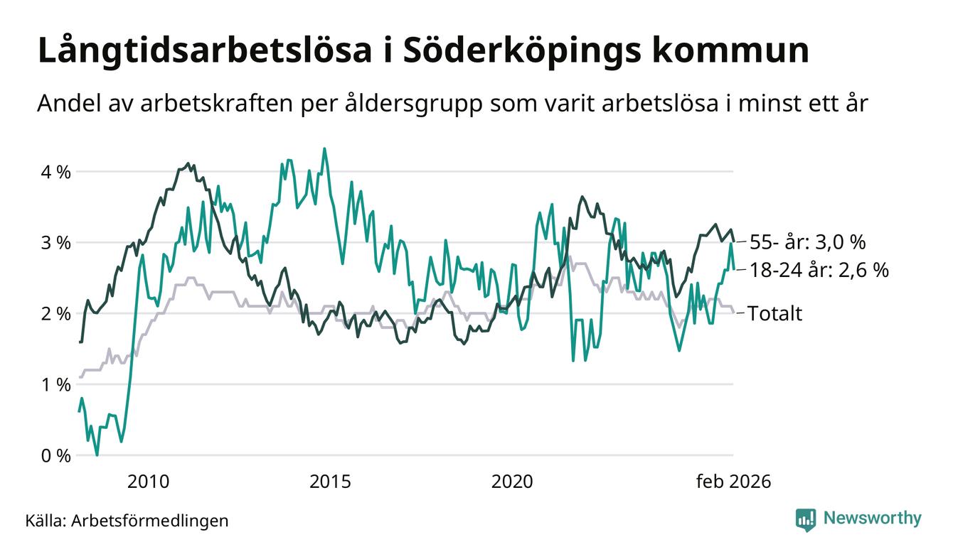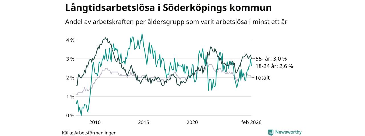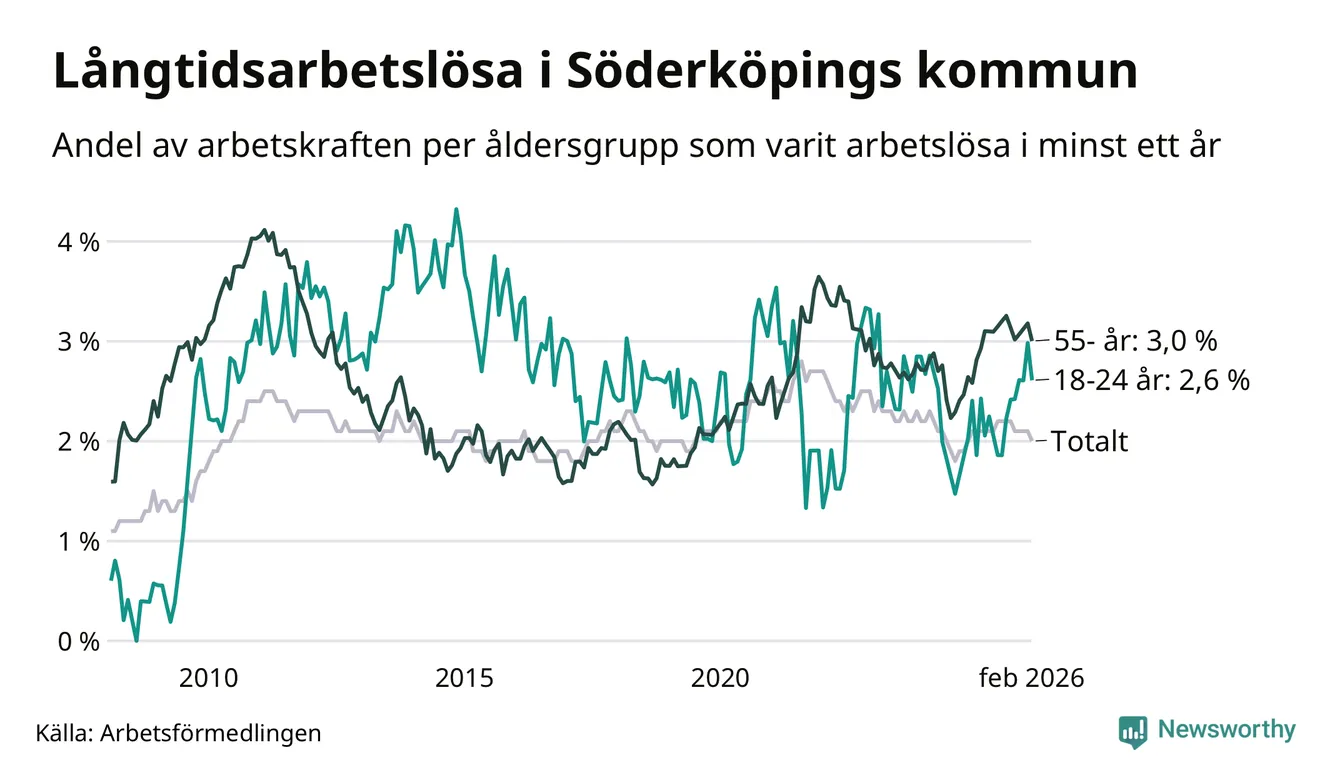 Av de 138 personerna som varit arbetslösa i mer än ett år i Söderköpings kommun är 52 personer mellan 55 och 661 år och 14 är mellan 18 och 24 år. För den äldre gruppen är andelen arbetslösa 3,0 procent medan den i den yngre gruppen är 2,6 procent. Även i riket som helhet är långtidsarbetslösheten högre i gruppen äldre.