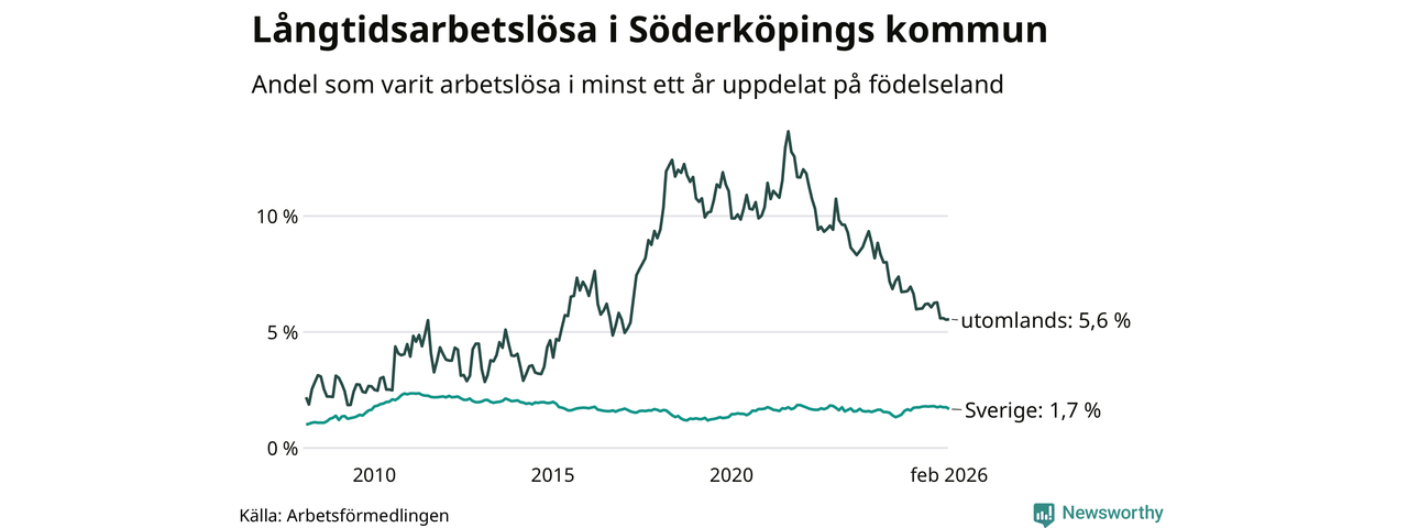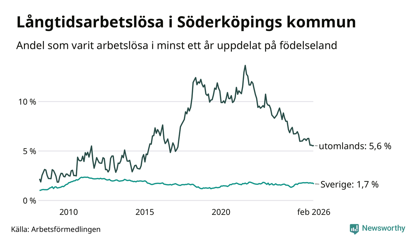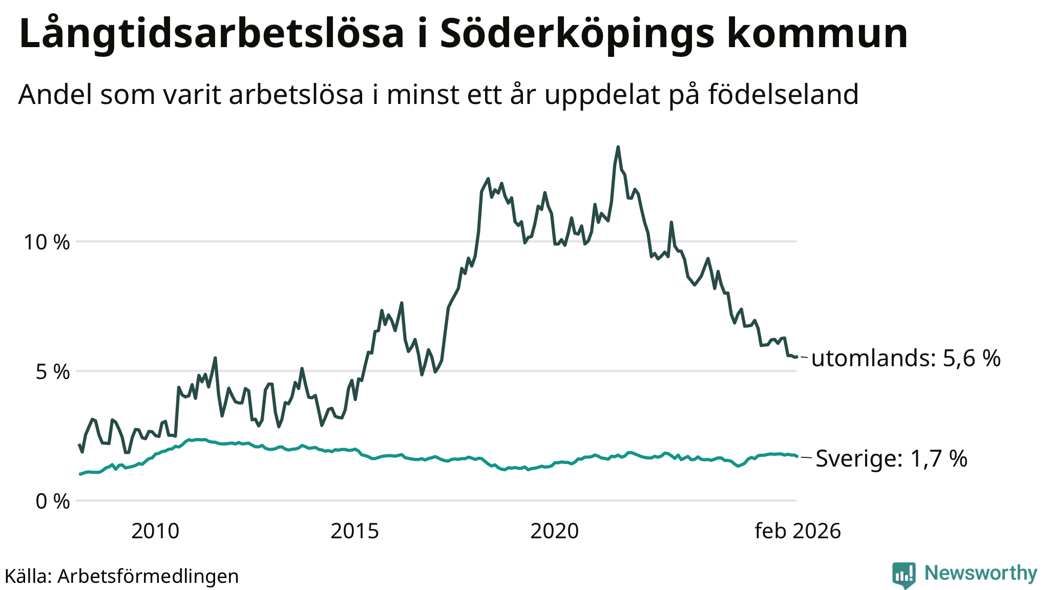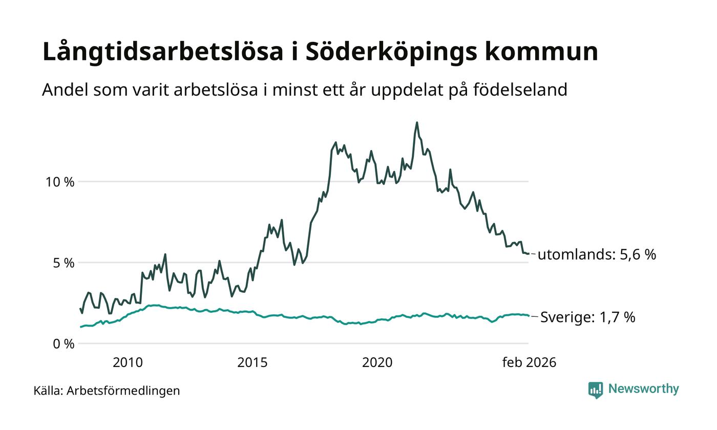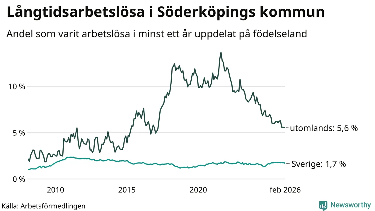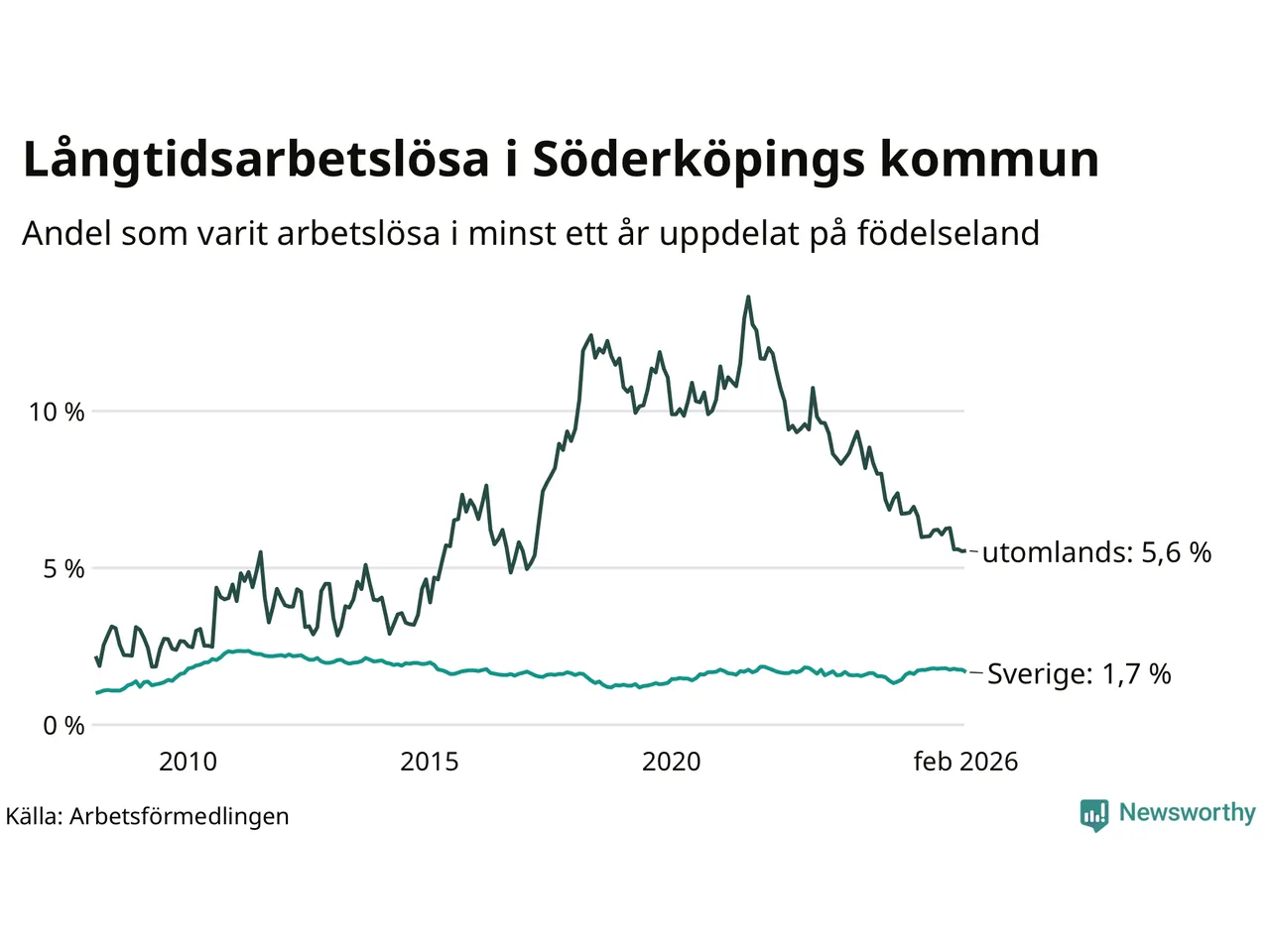 106 av de långtidsarbetslösa i Söderköping är födda i Sverige, medan 32 är födda utomlands. Det innebär att långtidsarbetslösheten bland Sverigefödda är 1,7 procent, medan den är tre gånger så hög – 5,6 procent – bland födda utomlands. Även i riket som helhet är arbetslösheten högre bland utrikesfödda.