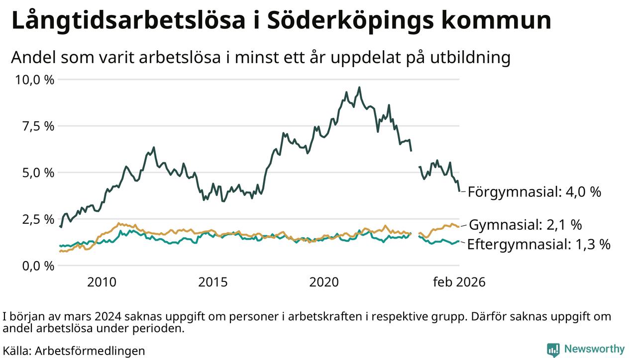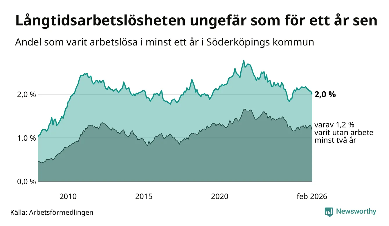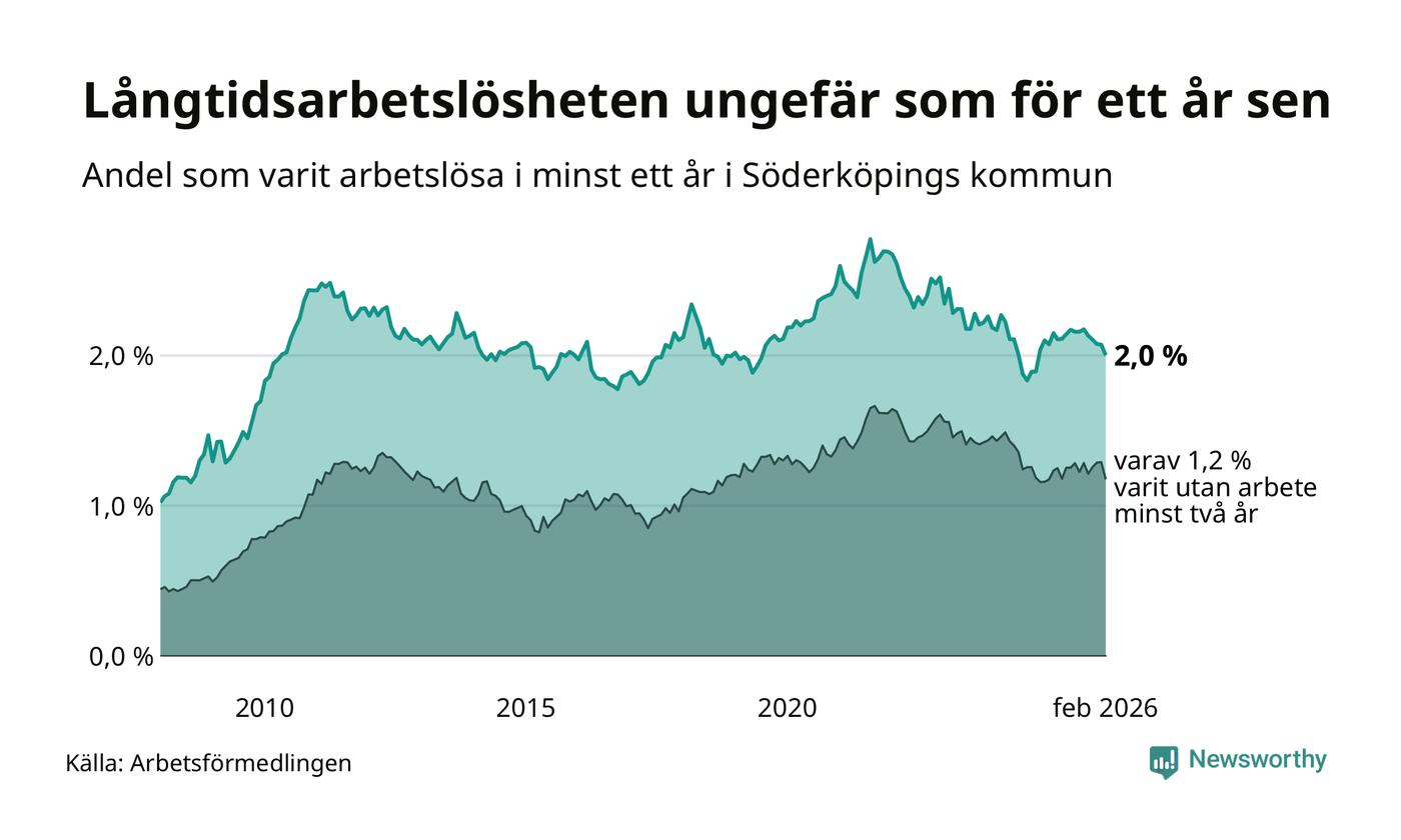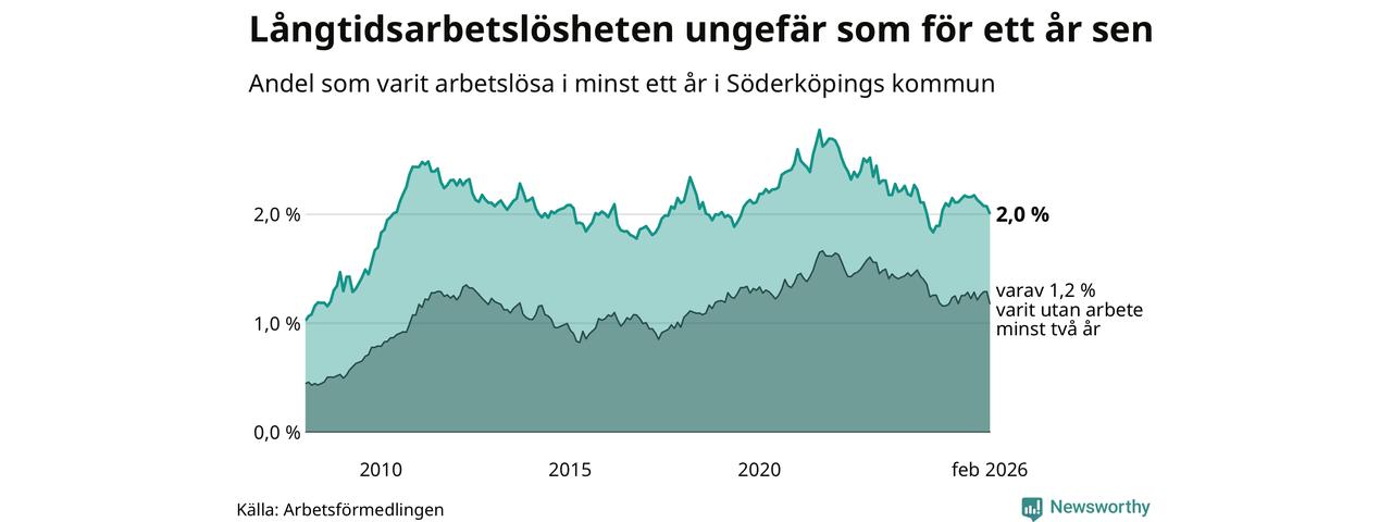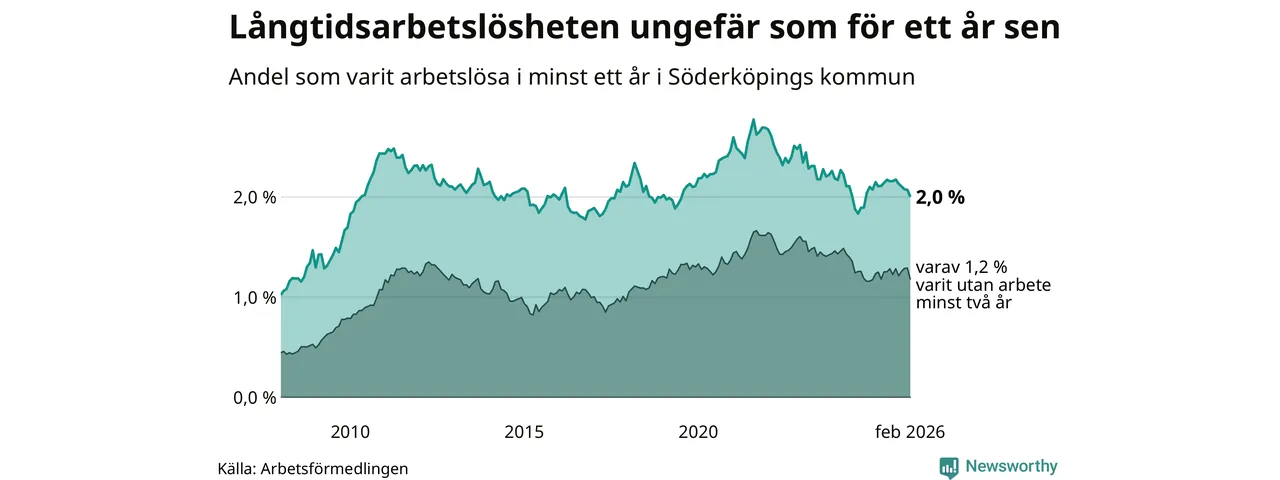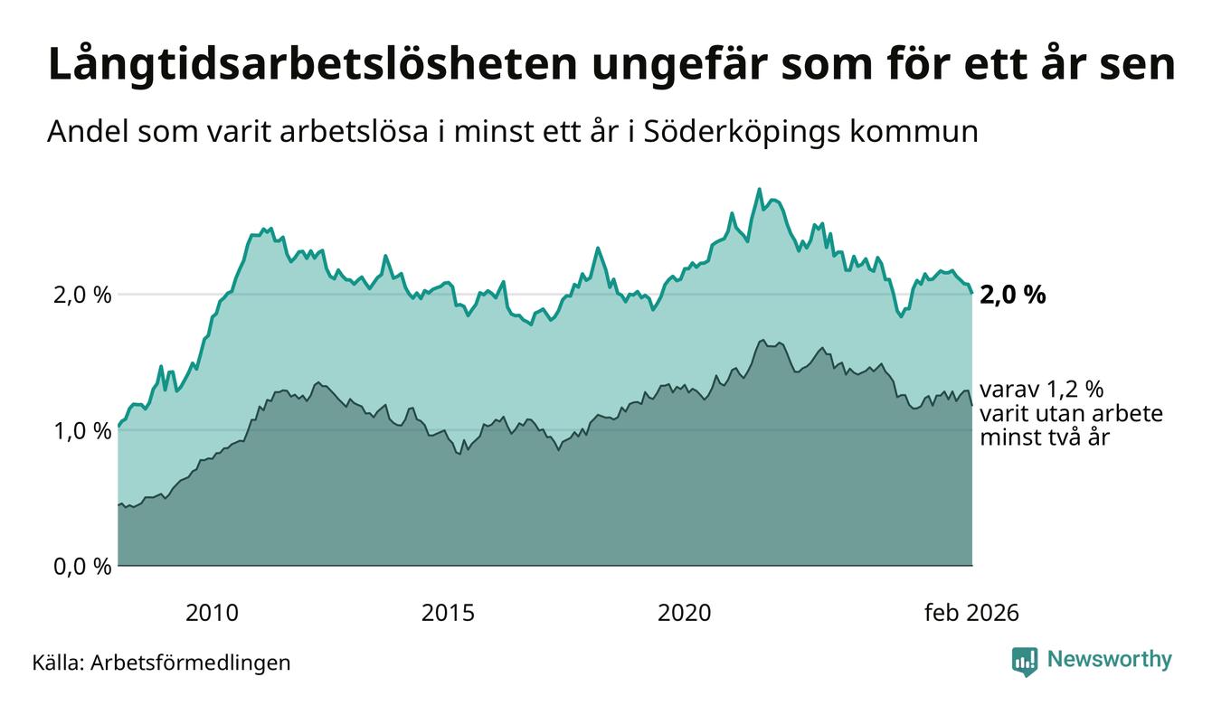 Andelen som varit utan arbete i minst ett år i Söderköping var ungefär lika stor i februari jämfört med samma månad för ett år sedan. Det visar Arbetsfömedlingens senaste månadsstatistik.
