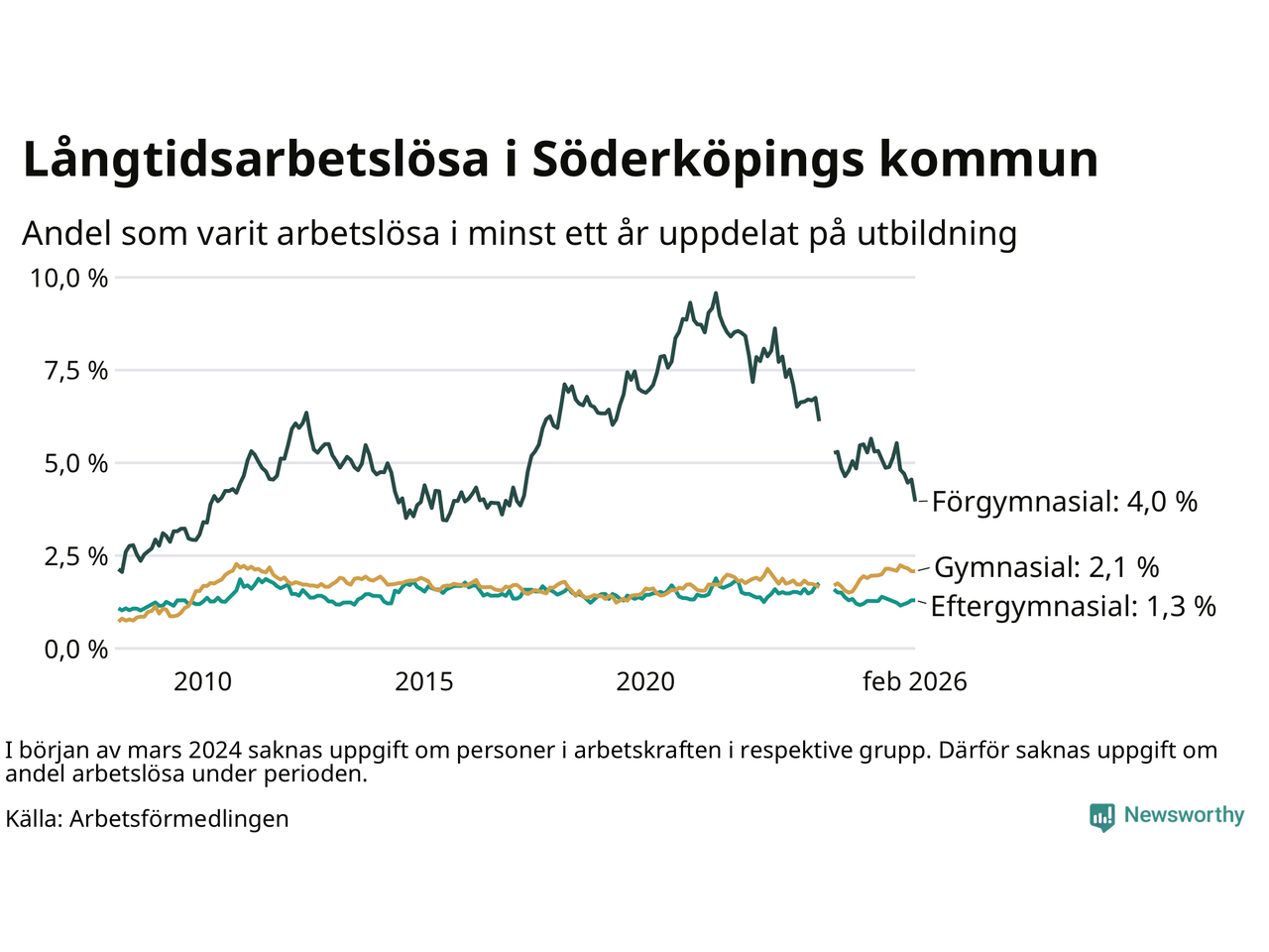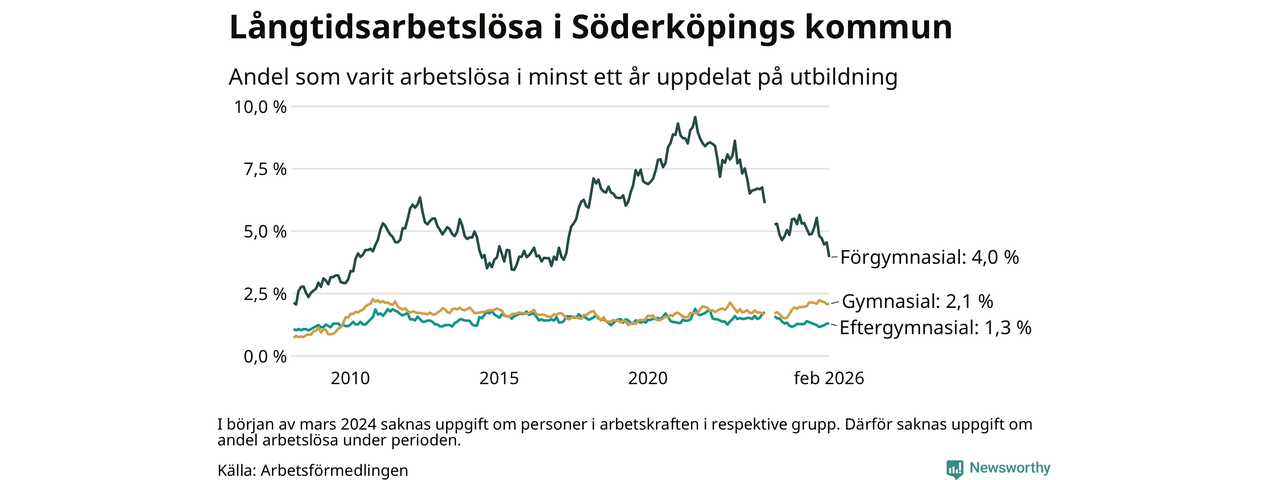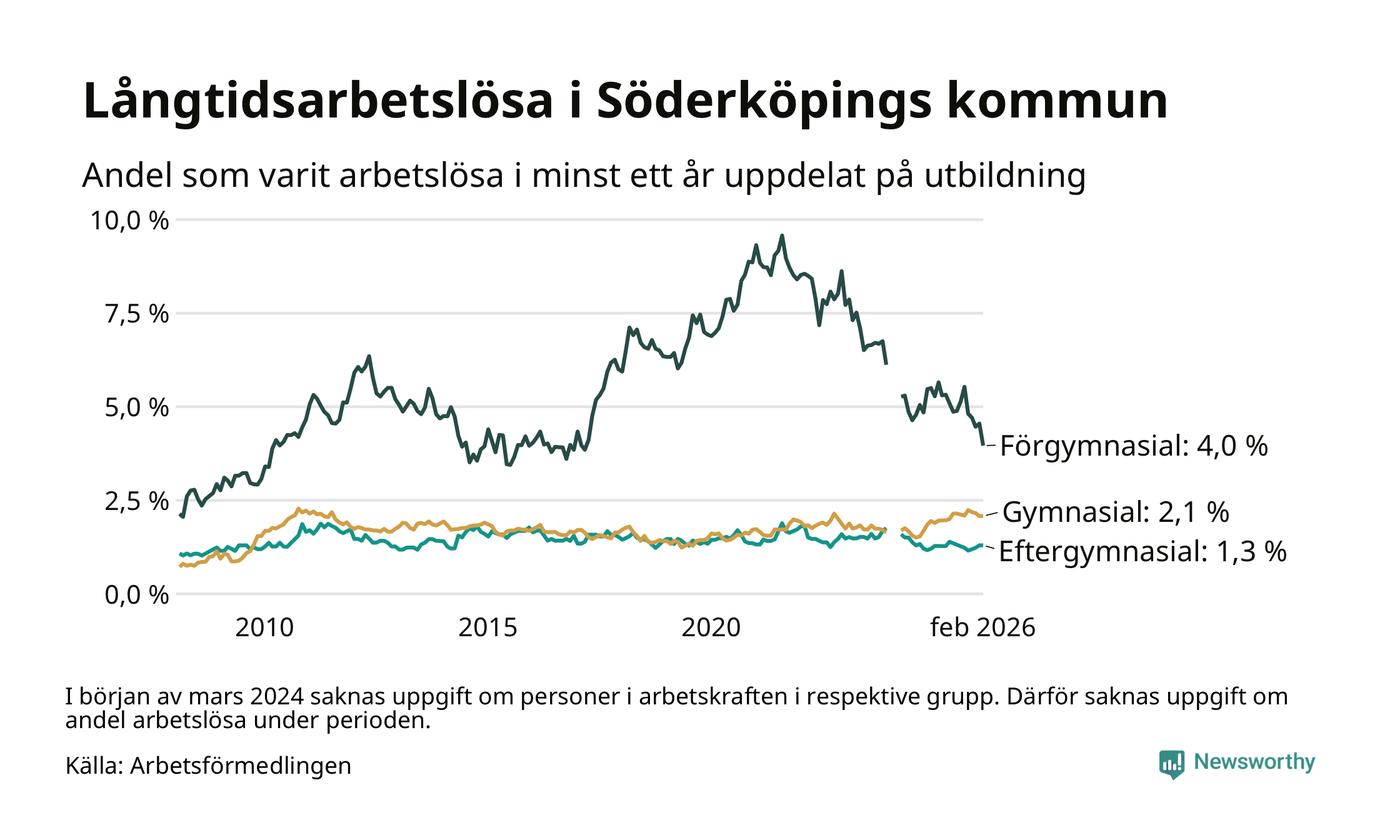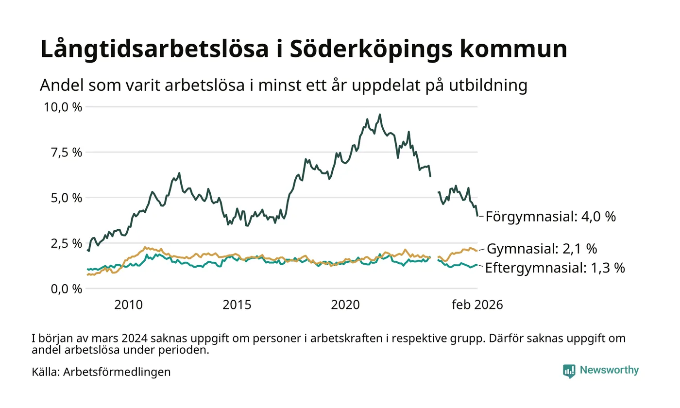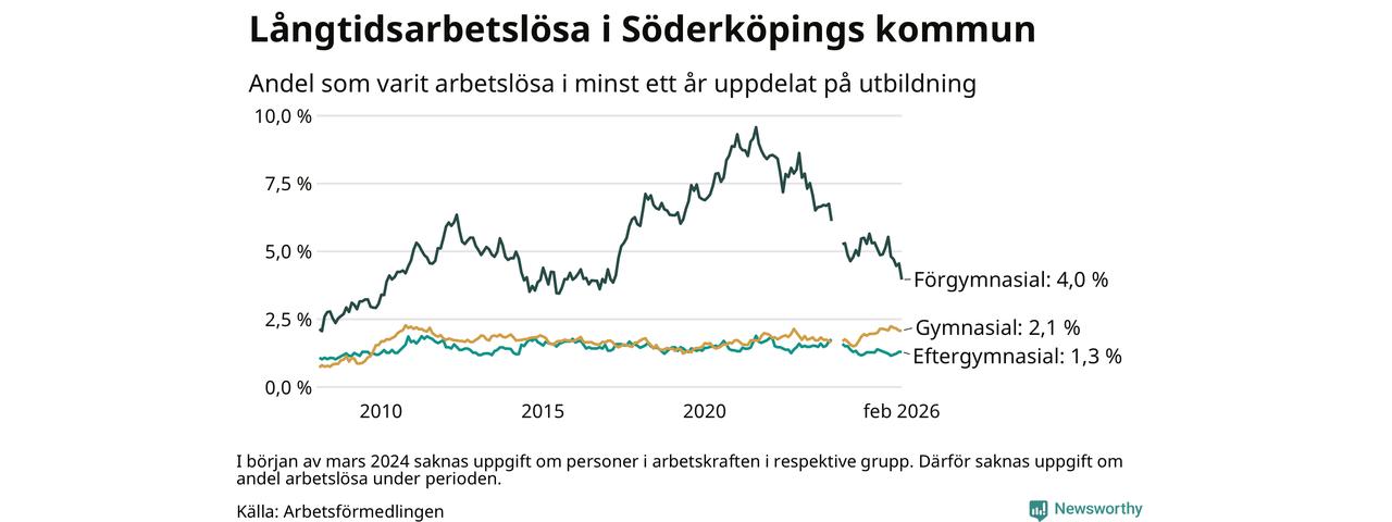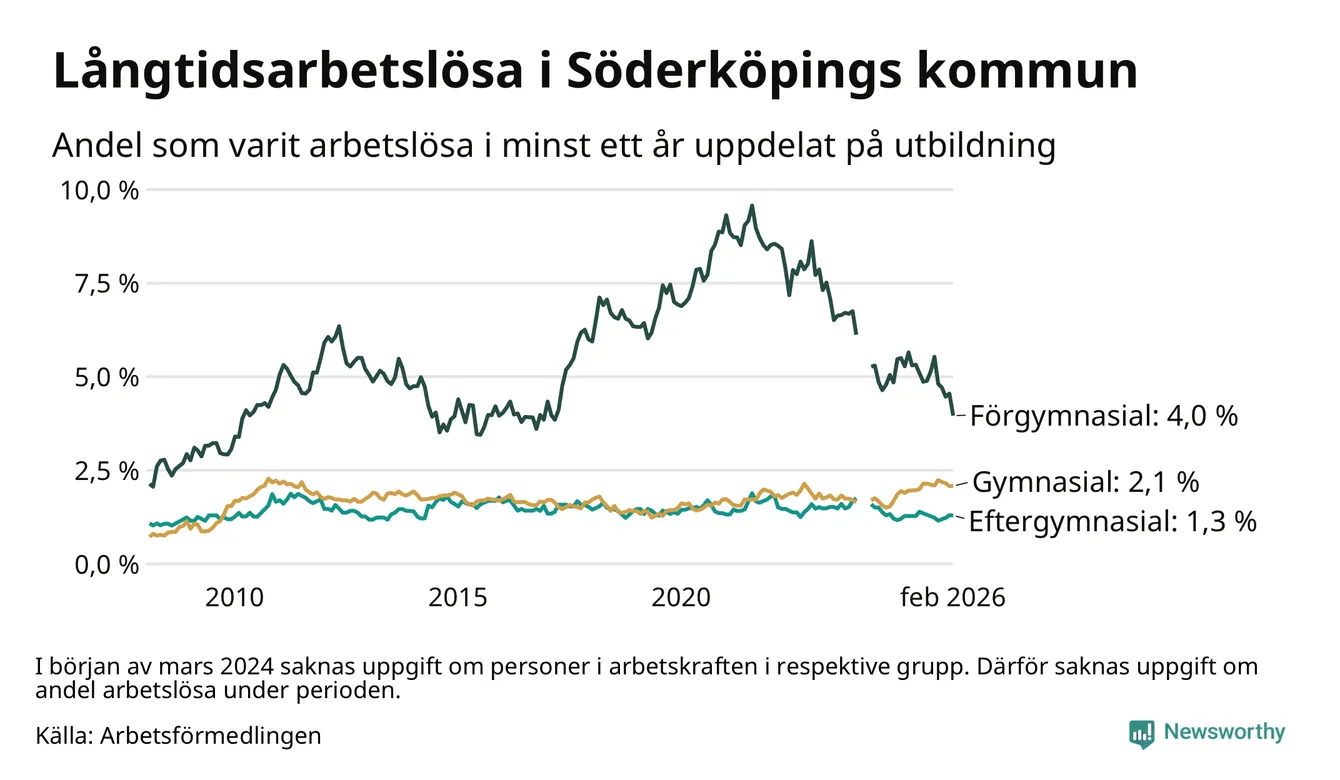 Andelen som varit utan arbete i minst ett år i Söderköping var ungefär lika stor i februari jämfört med samma månad för ett år sedan. Det visar Arbetsfömedlingens senaste månadsstatistik.