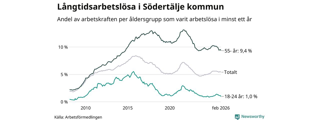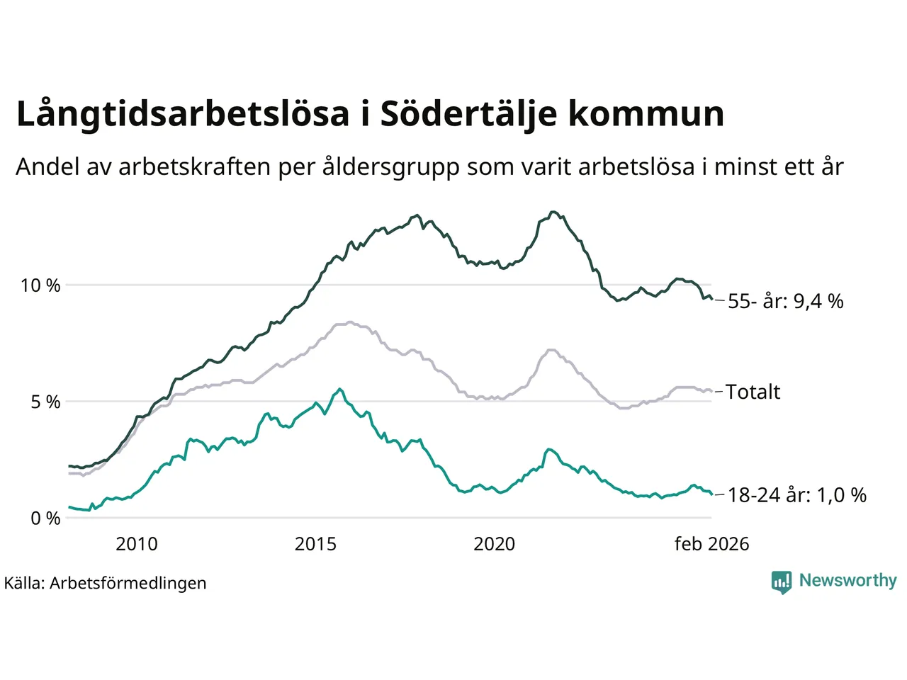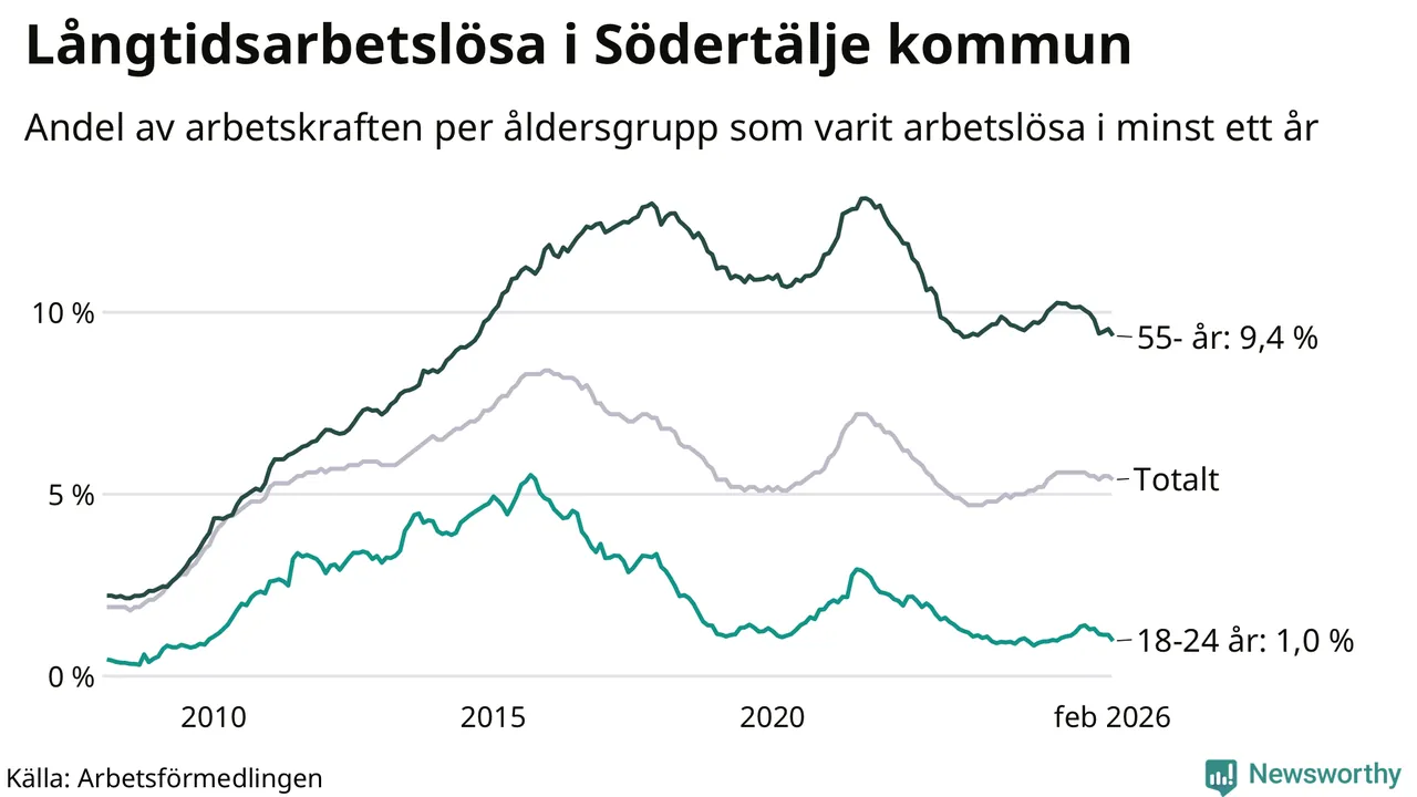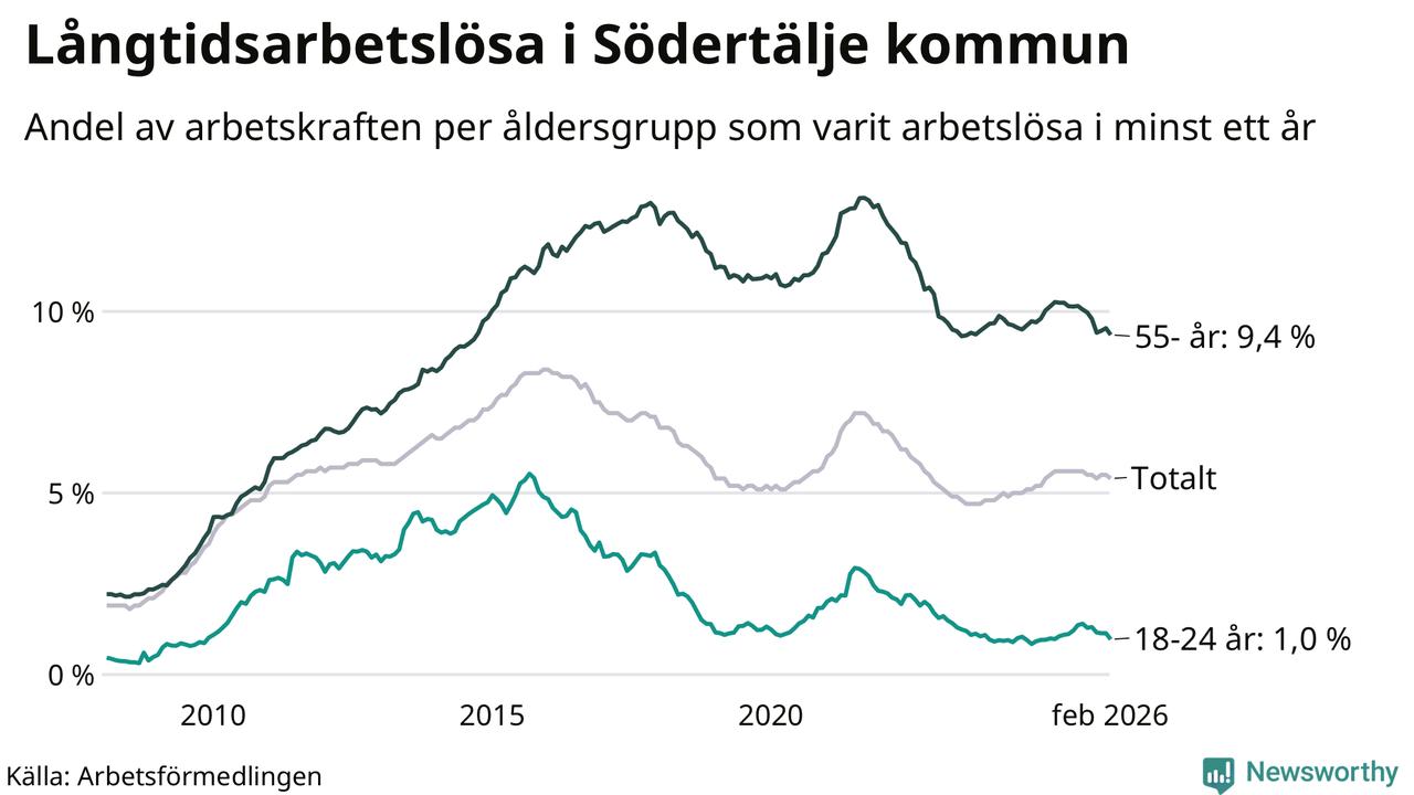 Av de 2 894 personerna som varit arbetslösa i mer än ett år i Södertälje kommun är 1 026 personer mellan 55 och 661 år och 52 är mellan 18 och 24 år. För den äldre gruppen är andelen arbetslösa 9,4 procent medan den i den yngre gruppen är 1,0 procent. Även i riket som helhet är långtidsarbetslösheten högre i gruppen äldre.