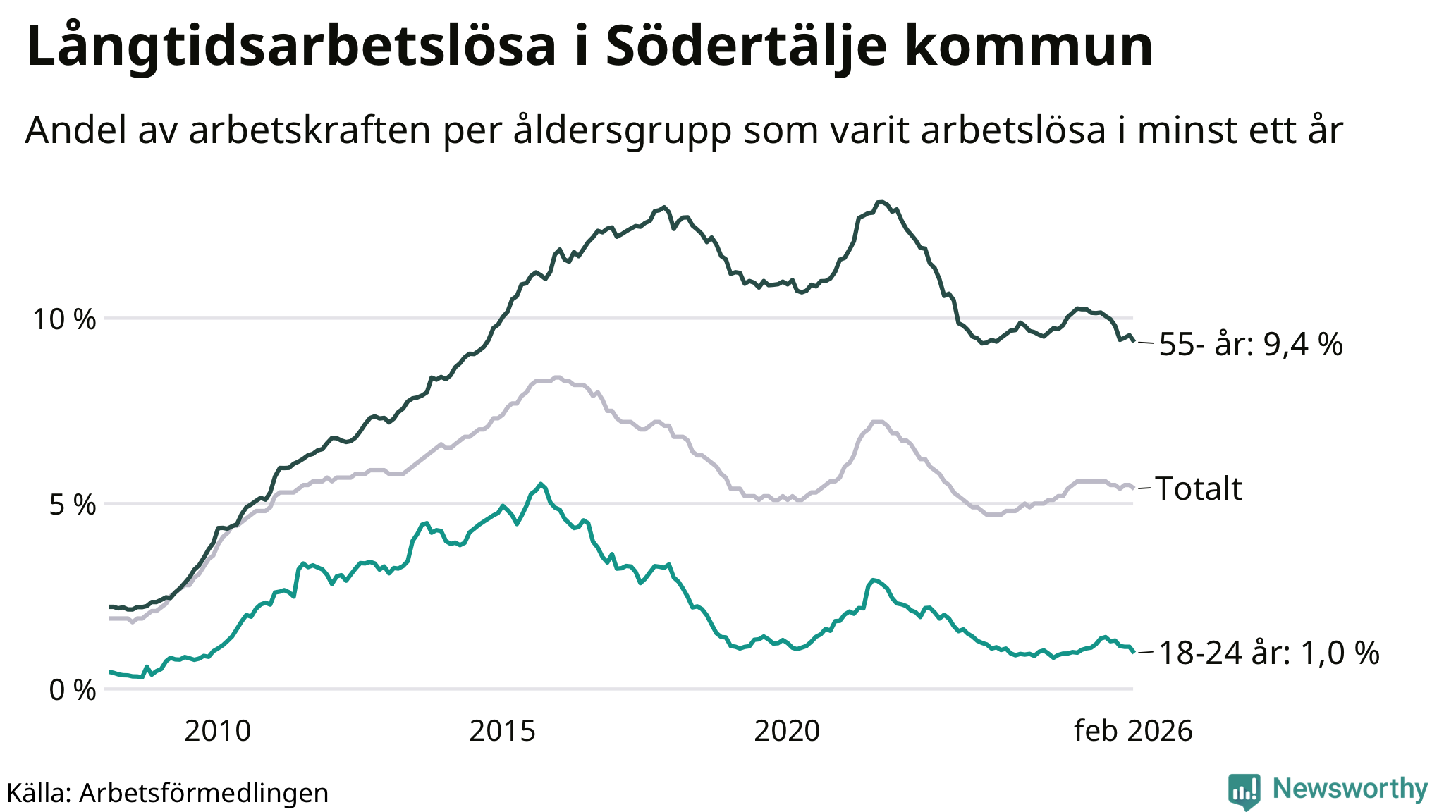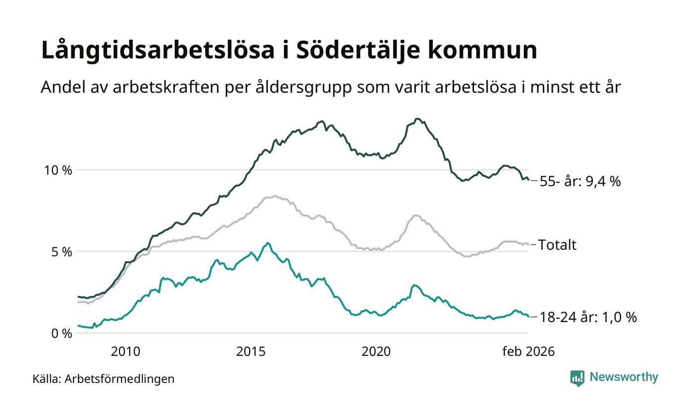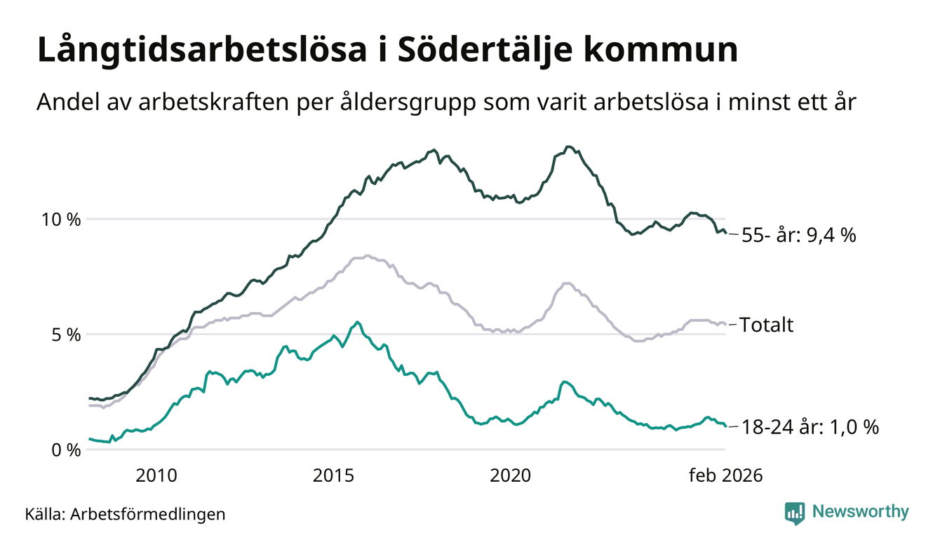 Av de 2 894 personerna som varit arbetslösa i mer än ett år i Södertälje kommun är 1 026 personer mellan 55 och 661 år och 52 är mellan 18 och 24 år. För den äldre gruppen är andelen arbetslösa 9,4 procent medan den i den yngre gruppen är 1,0 procent. Även i riket som helhet är långtidsarbetslösheten högre i gruppen äldre.