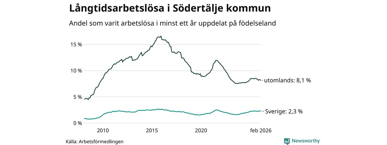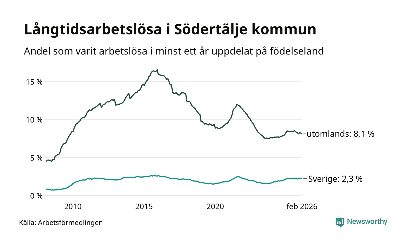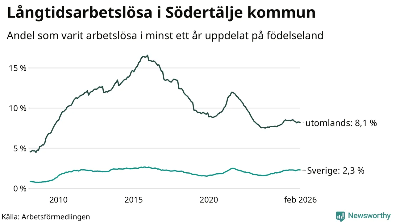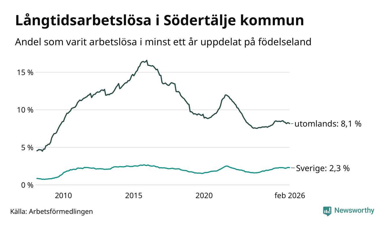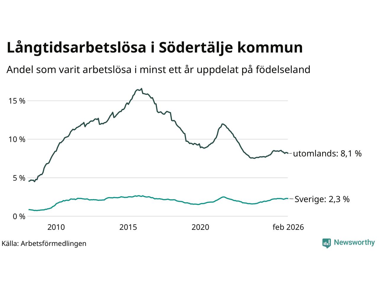 566 av de långtidsarbetslösa i Södertälje är födda i Sverige, medan 2 328 är födda utomlands. Det innebär att långtidsarbetslösheten bland Sverigefödda är 2,3 procent, medan den är fyra gånger så hög – 8,1 procent – bland födda utomlands. Även i riket som helhet är arbetslösheten högre bland utrikesfödda.
