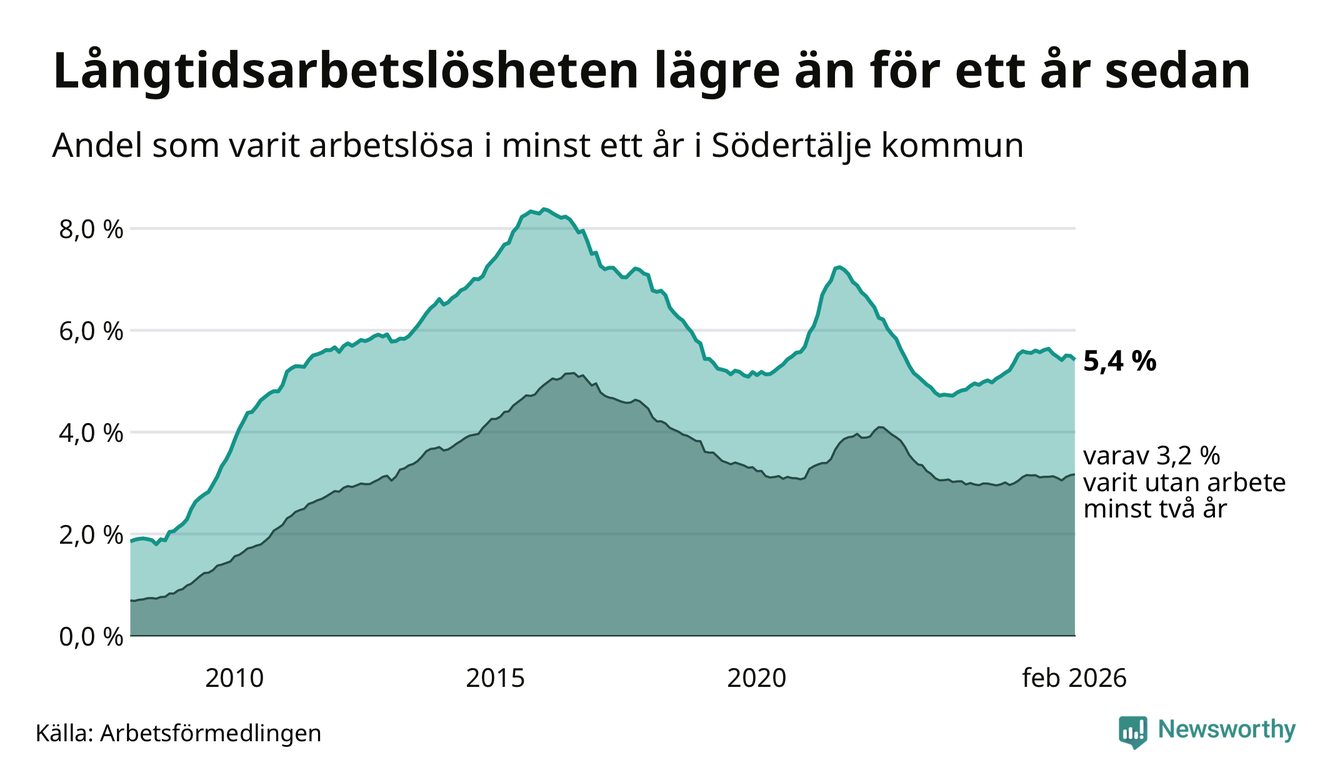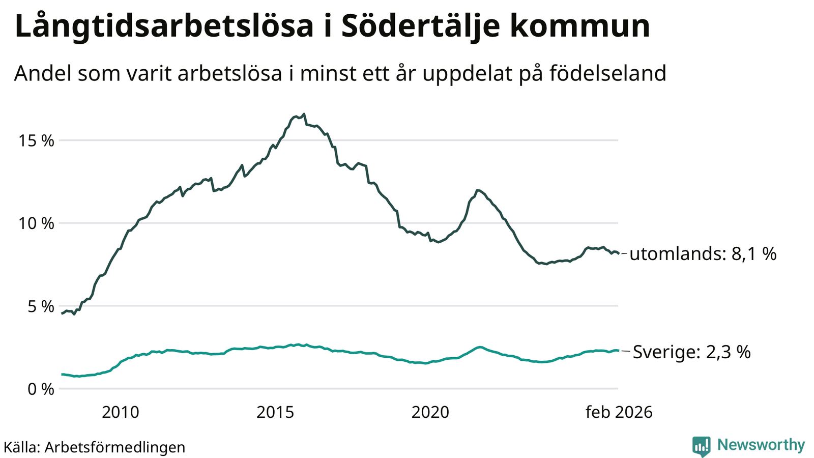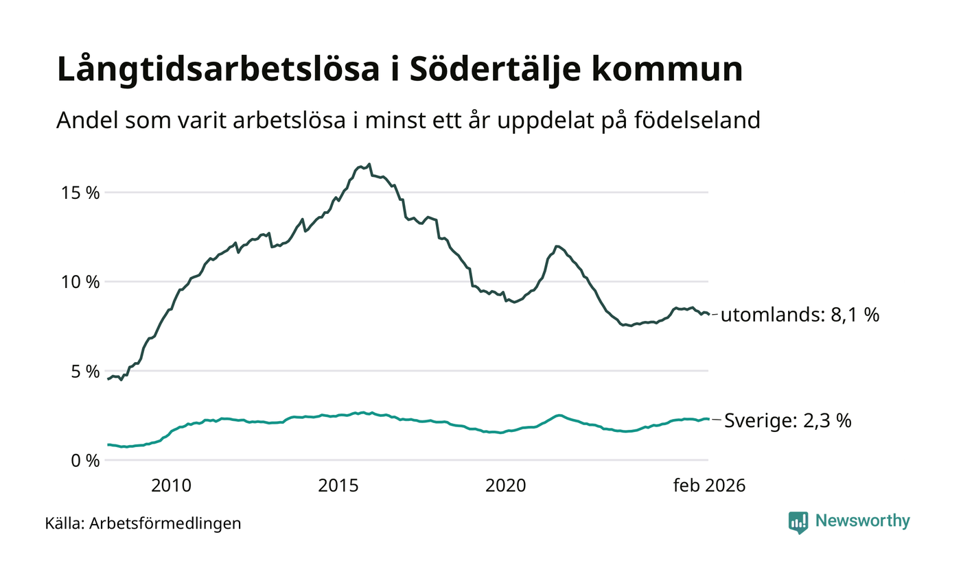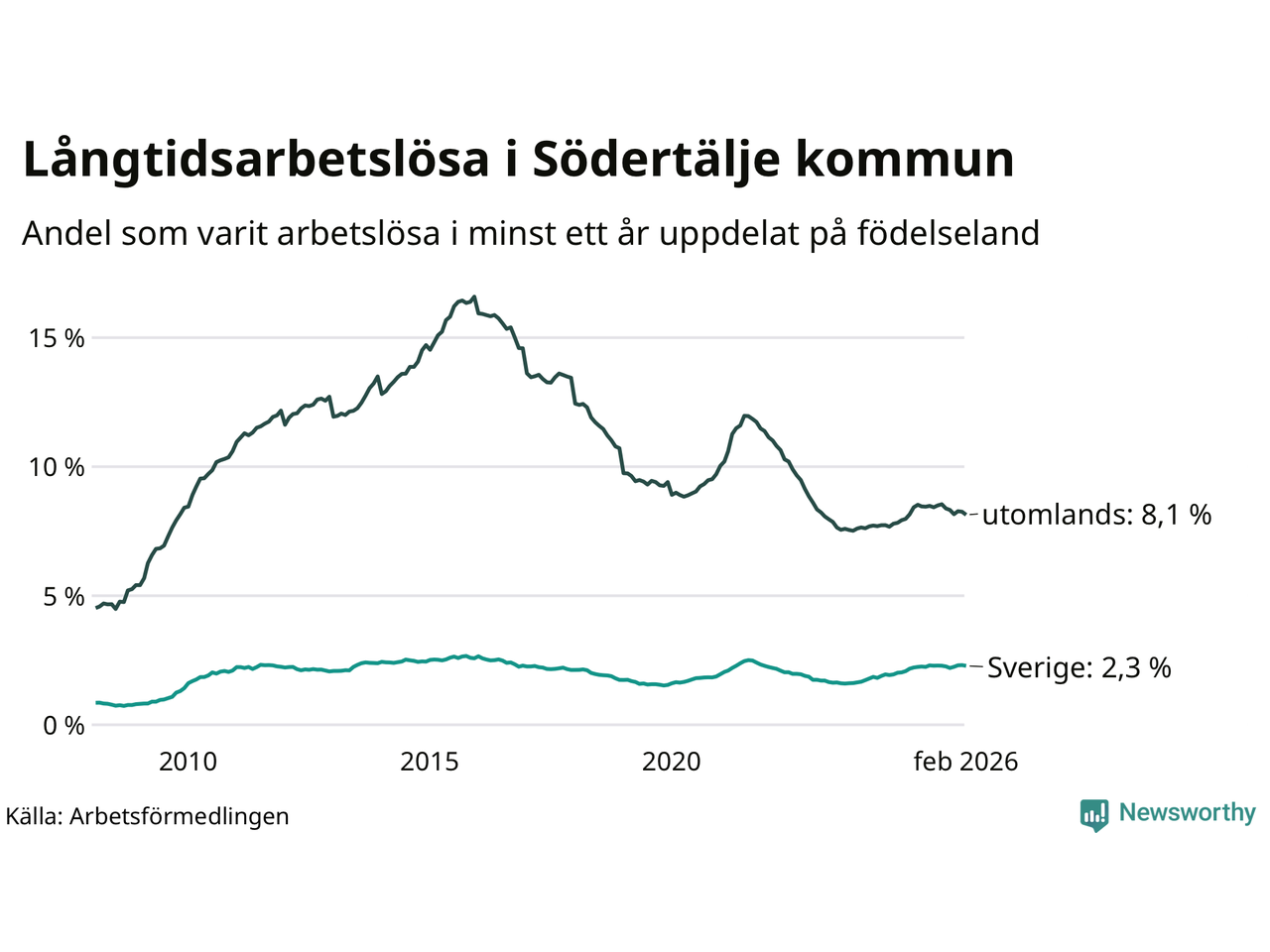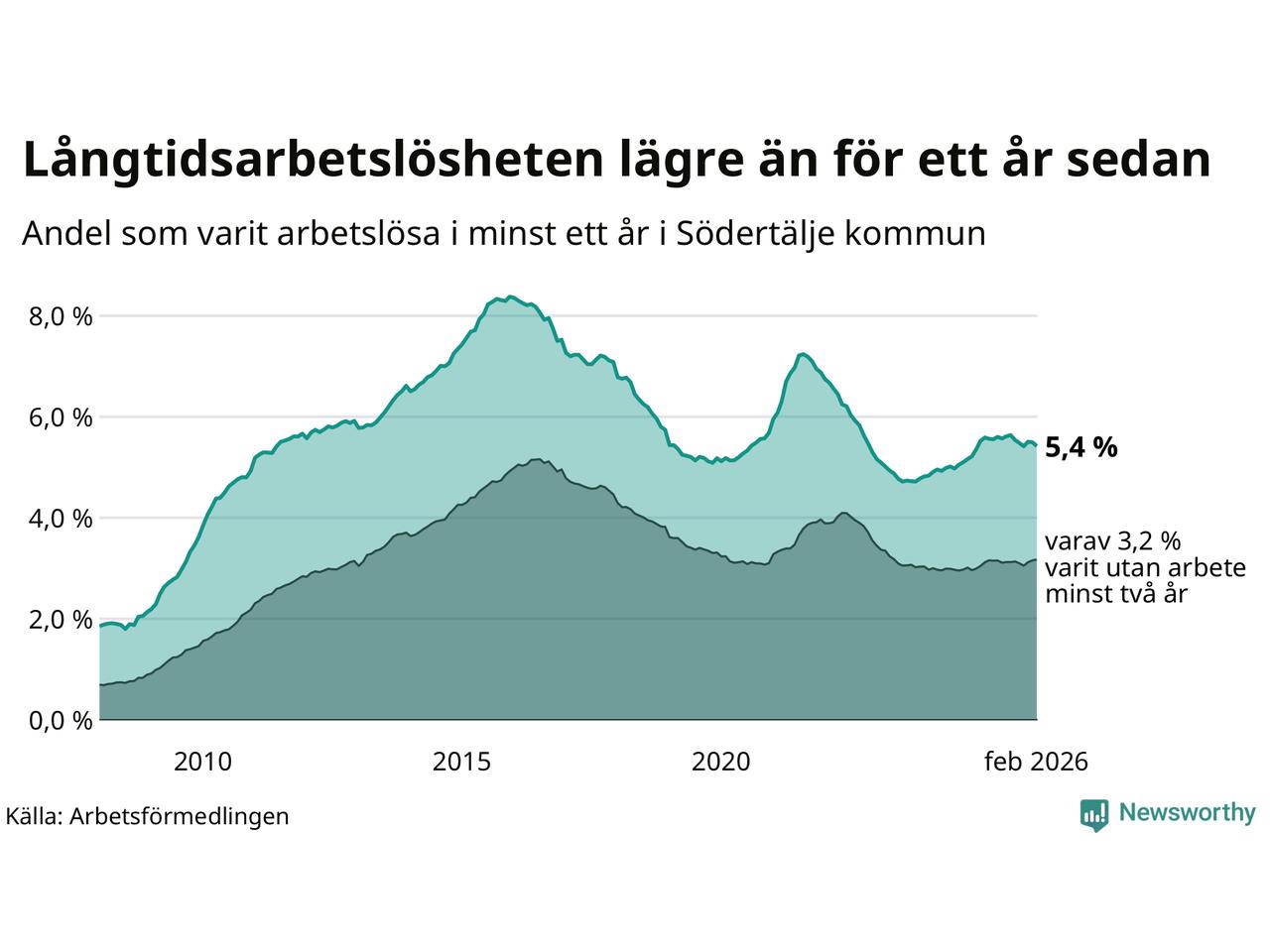 I februari hade 2 894 Södertäljebor varit arbetslösa i minst ett år, vilket är 41 färre än månaden innan. 2 894 personer motsvarar 5,4 procent av arbetskraften i kommunen – andelen långtidsarbetslösa är 0,2 procentenheter lägre än samma månad för ett år sedan. Södertälje kommun hade tredje högst andel långtidsarbetslösa i landet i februari.