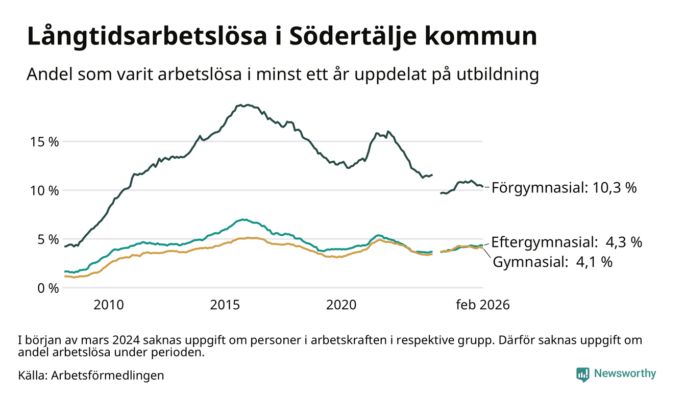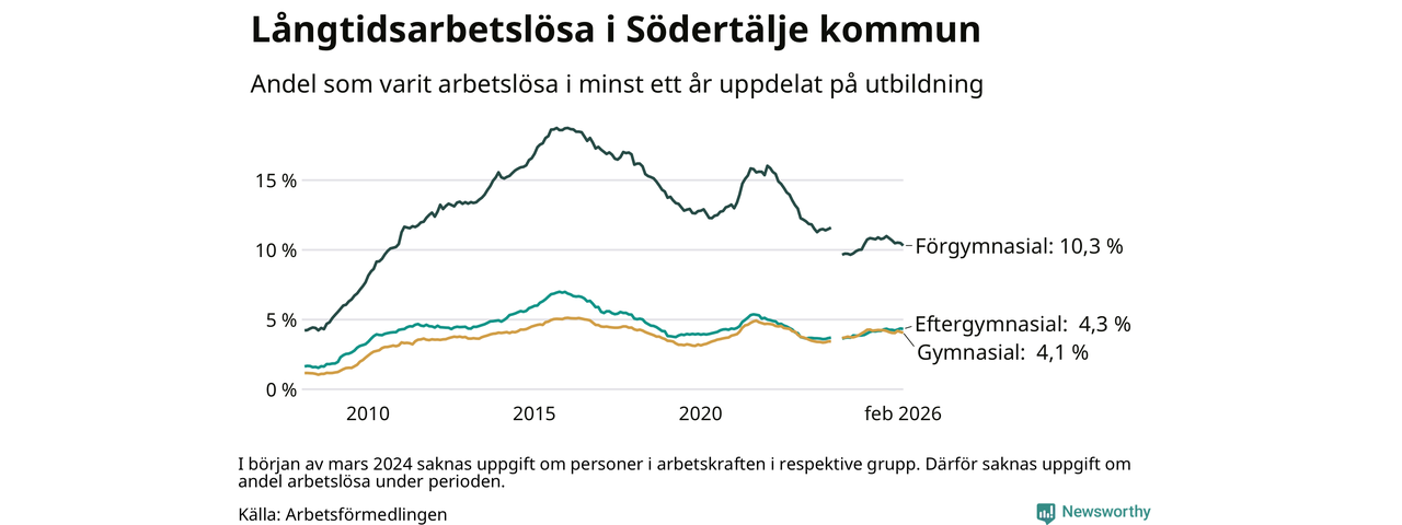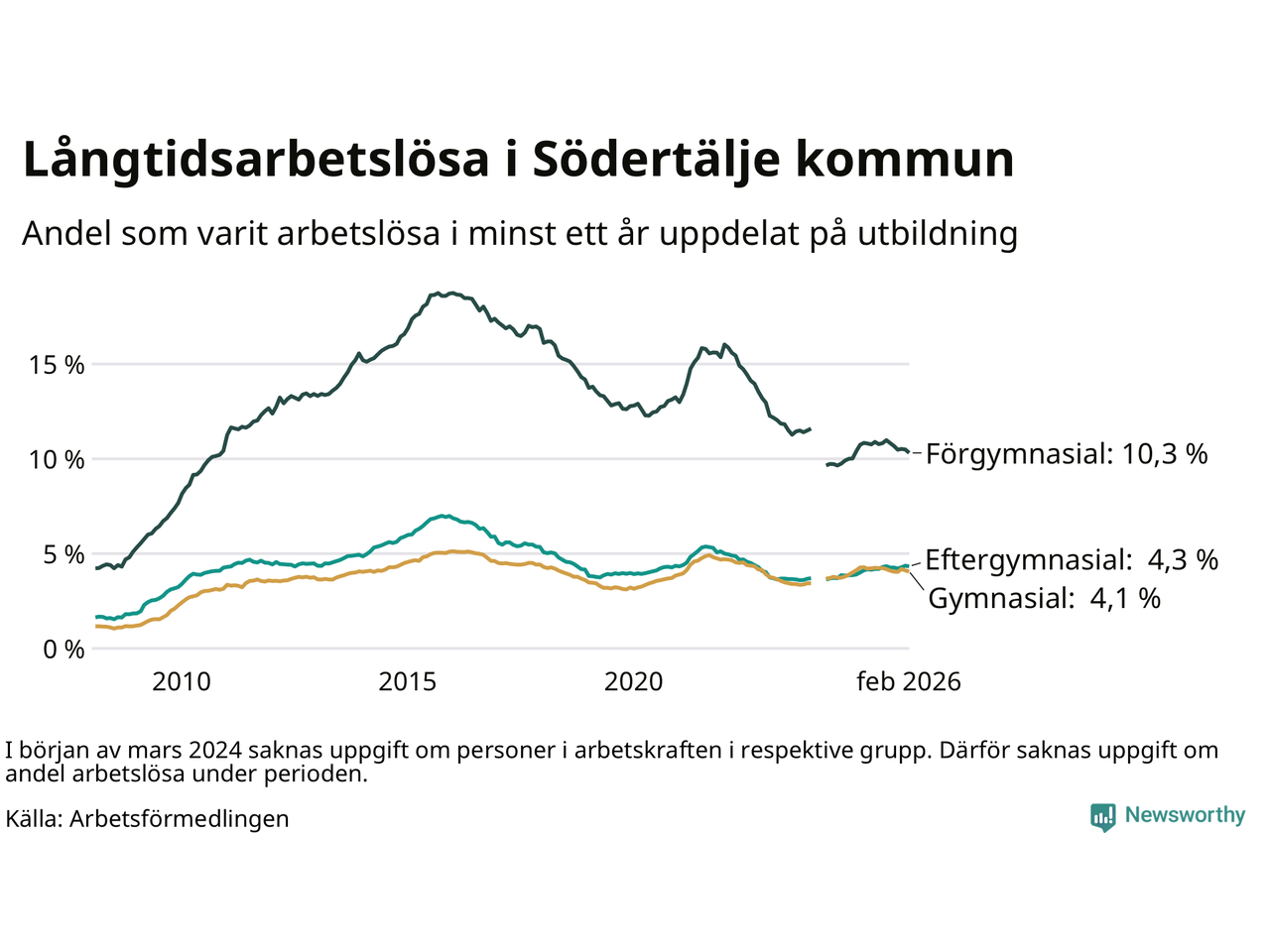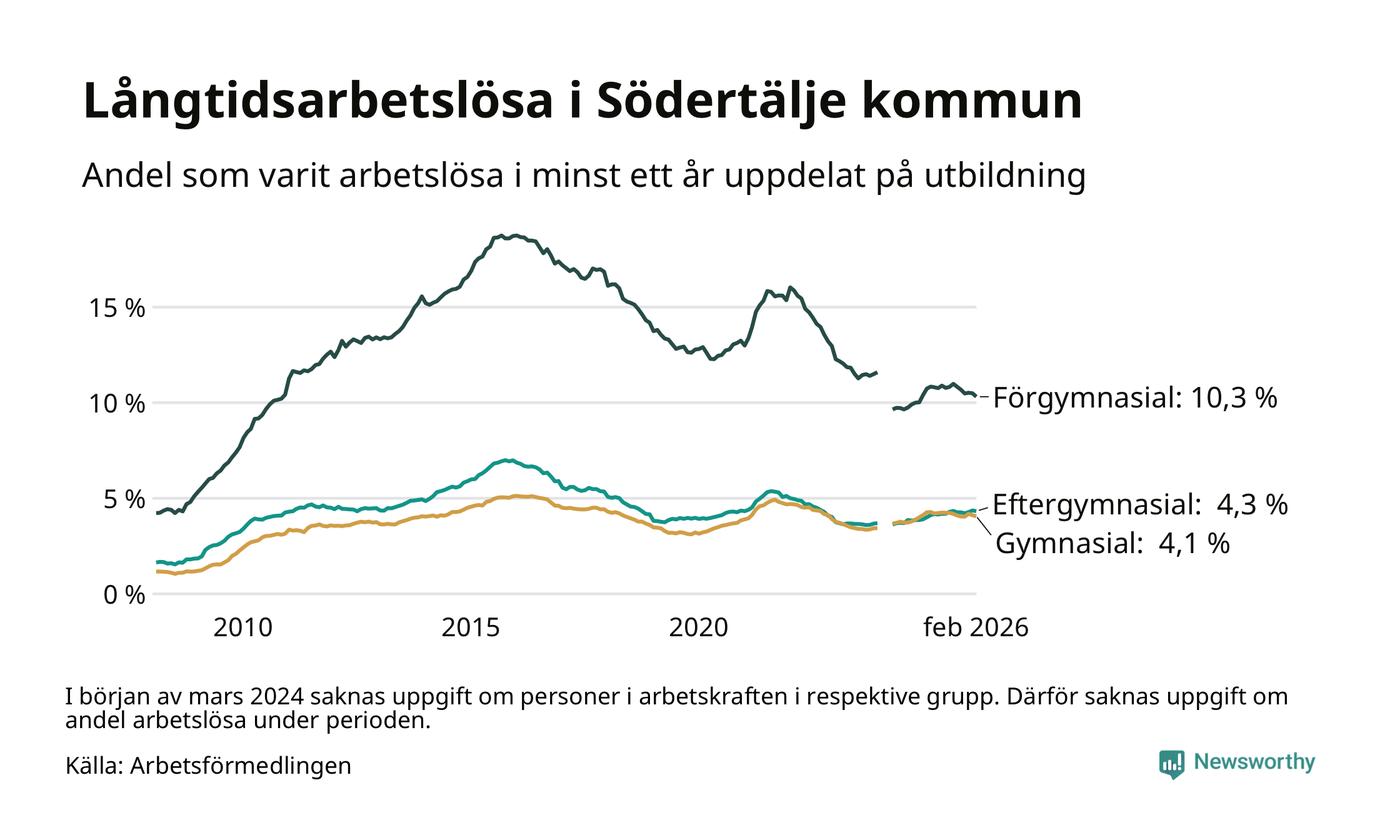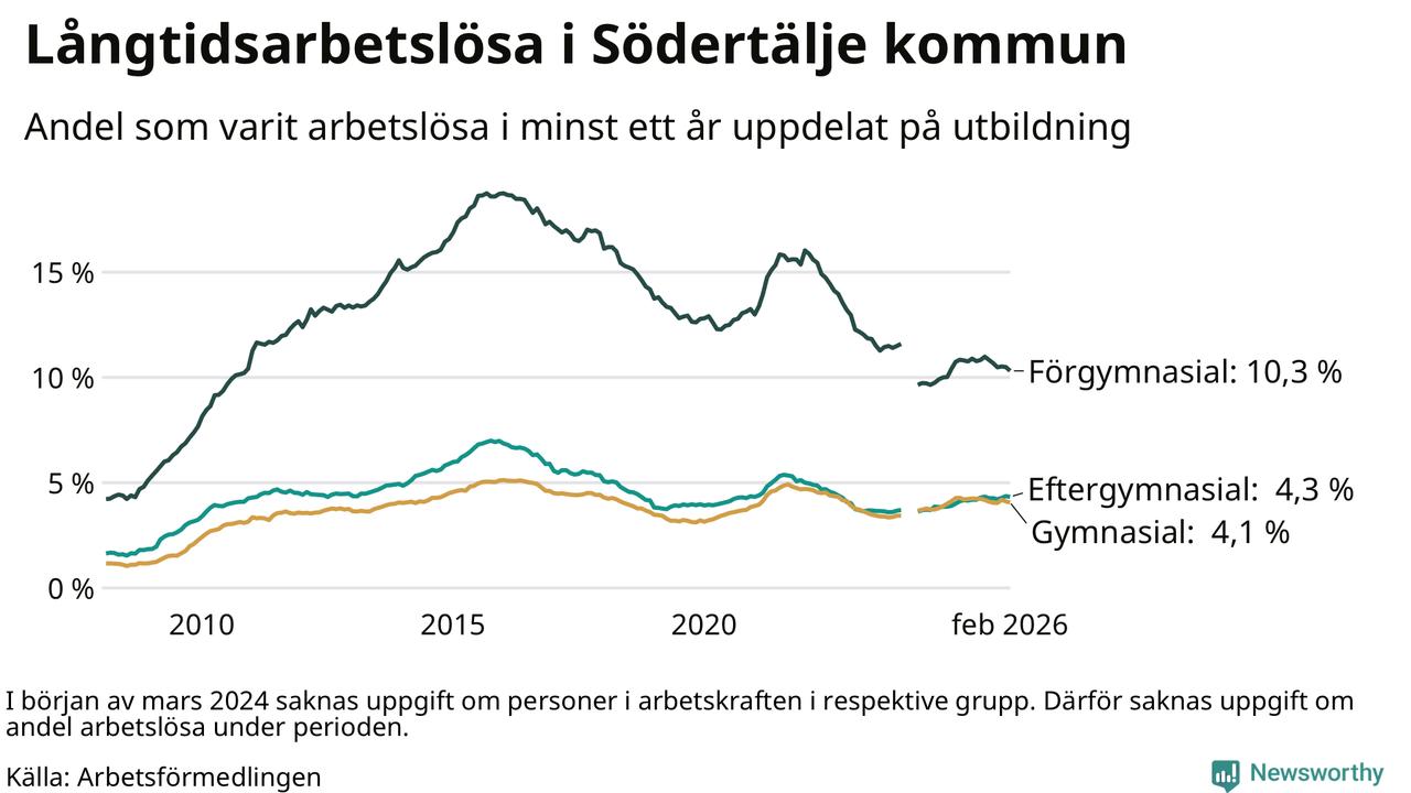 I februari hade 2 894 Södertäljebor varit arbetslösa i minst ett år, vilket är 41 färre än månaden innan. 2 894 personer motsvarar 5,4 procent av arbetskraften i kommunen – andelen långtidsarbetslösa är 0,2 procentenheter lägre än samma månad för ett år sedan. Södertälje kommun hade tredje högst andel långtidsarbetslösa i landet i februari.