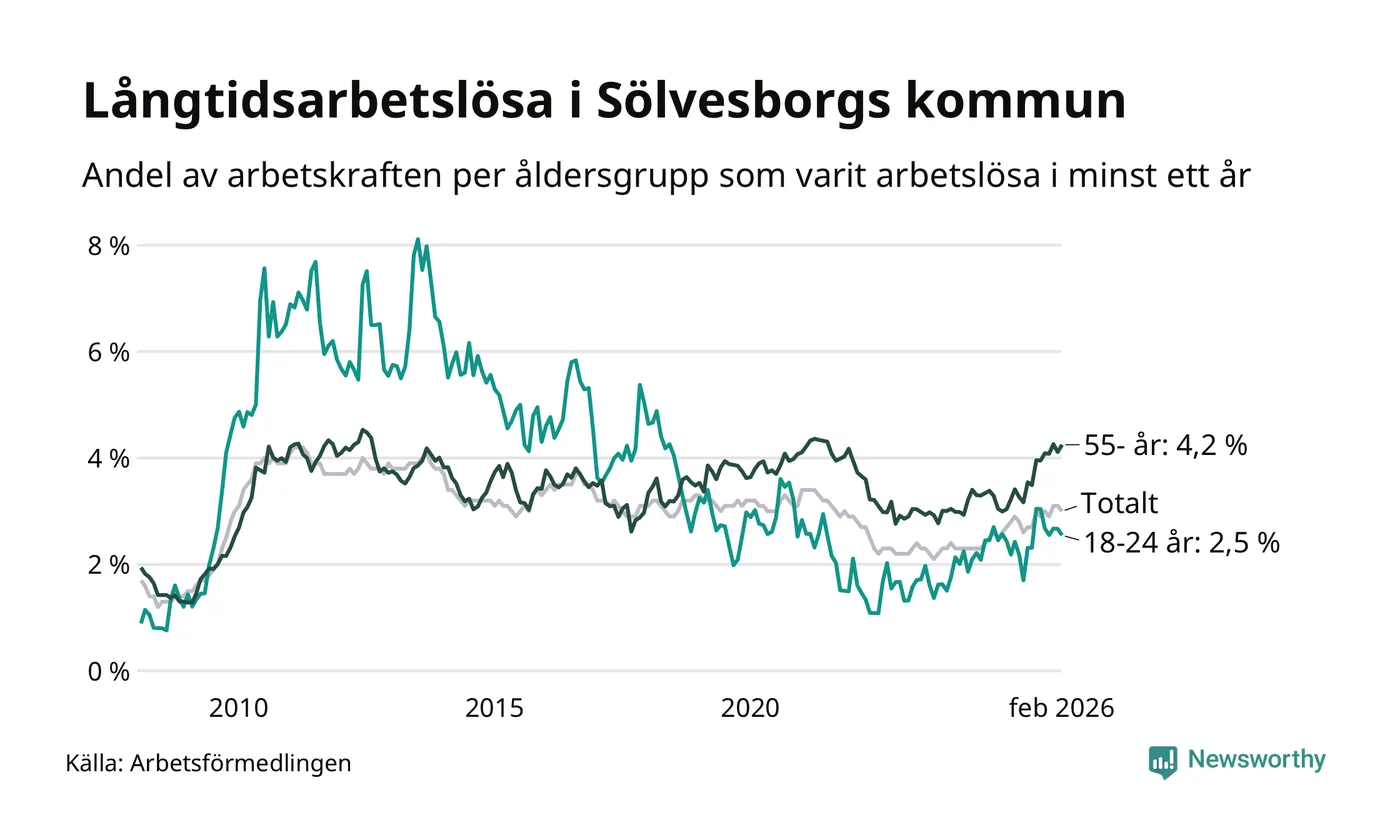 Av de 252 personerna som varit arbetslösa i mer än ett år i Sölvesborgs kommun är 91 personer mellan 55 och 661 år och 21 är mellan 18 och 24 år. För den äldre gruppen är andelen arbetslösa 4,2 procent medan den i den yngre gruppen är 2,5 procent. Även i riket som helhet är långtidsarbetslösheten högre i gruppen äldre.