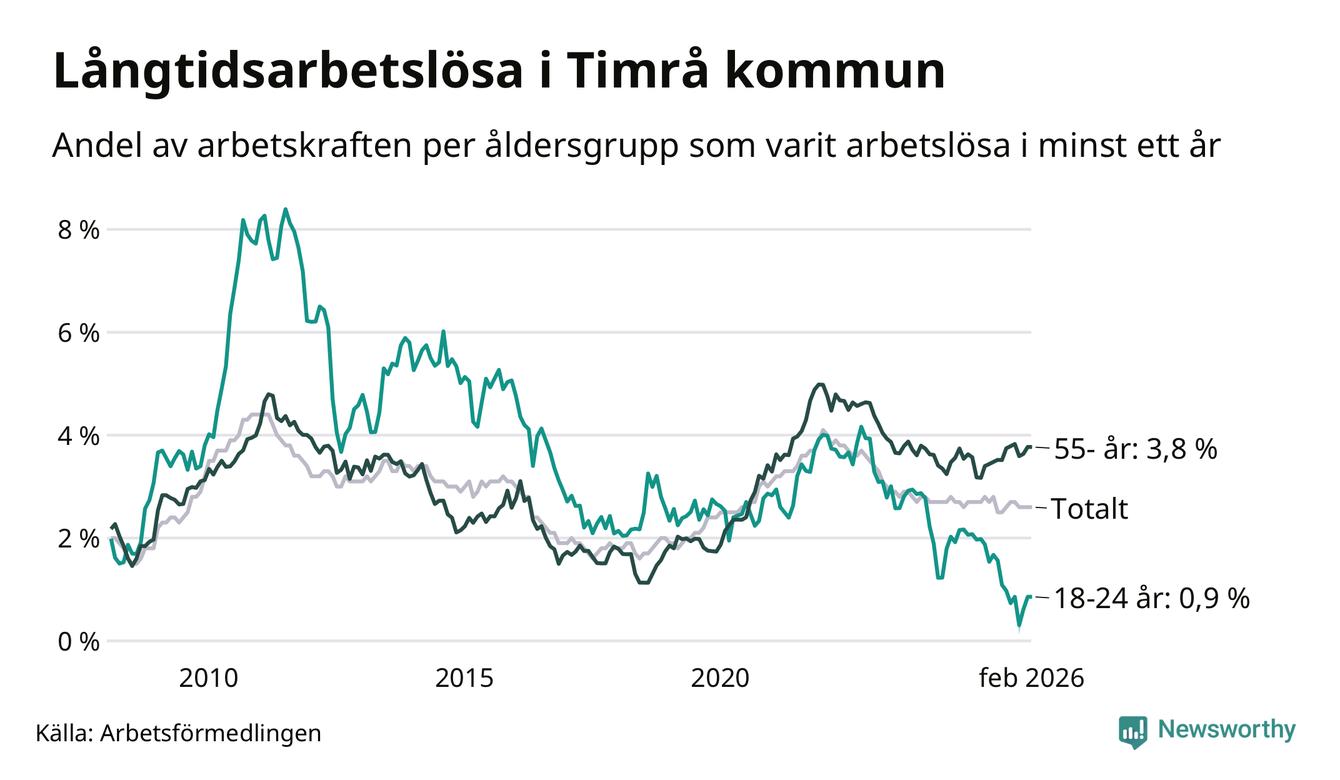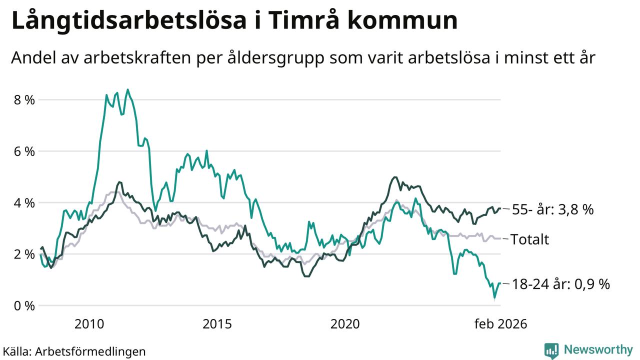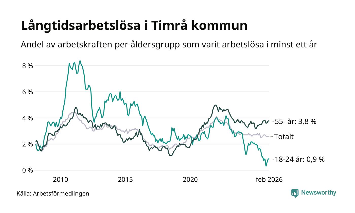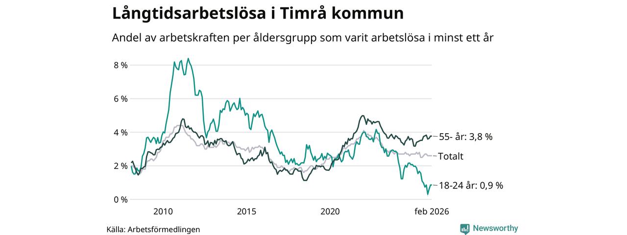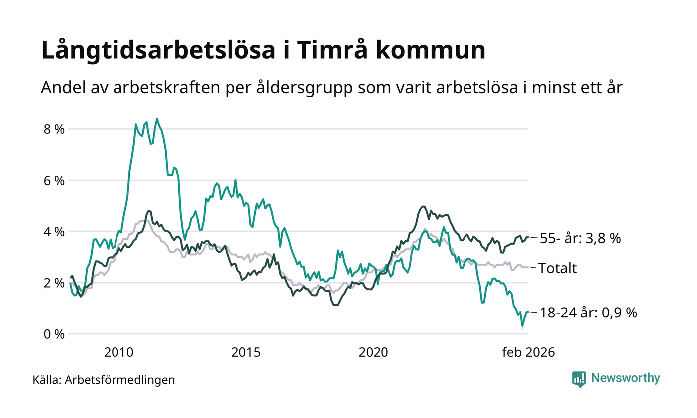 Av de 228 personerna som varit arbetslösa i mer än ett år i Timrå kommun är 81 personer mellan 55 och 661 år och sju är mellan 18 och 24 år. För den äldre gruppen är andelen arbetslösa 3,8 procent medan den i den yngre gruppen är 0,9 procent. Även i riket som helhet är långtidsarbetslösheten högre i gruppen äldre.