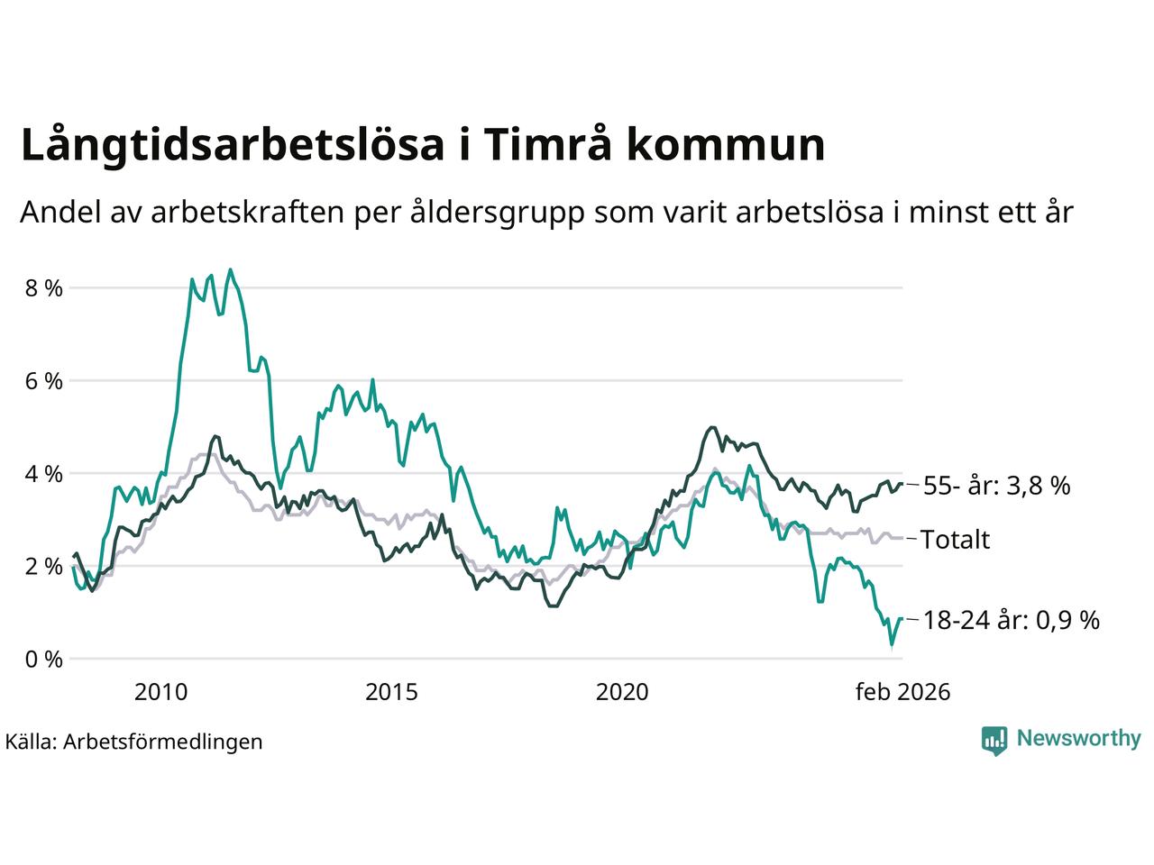 I februari hade 228 Timråbor varit arbetslösa i minst ett år, vilket är två fler än månaden innan. 228 personer motsvarar 2,6 procent av arbetskraften i kommunen – andelen långtidsarbetslösa är ungefär på samma nivå som för ett år sedan.
