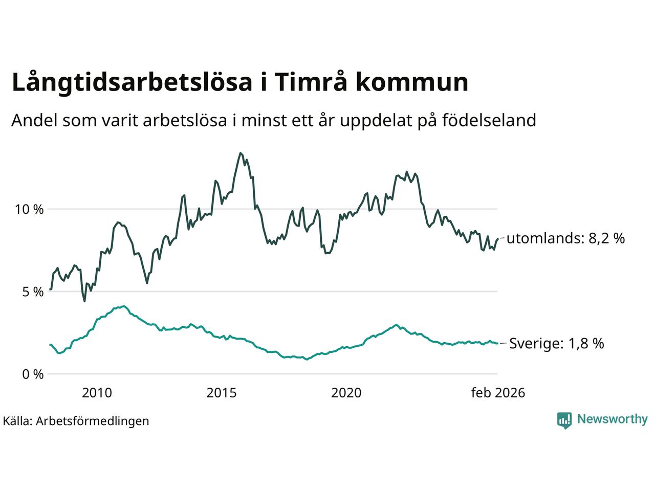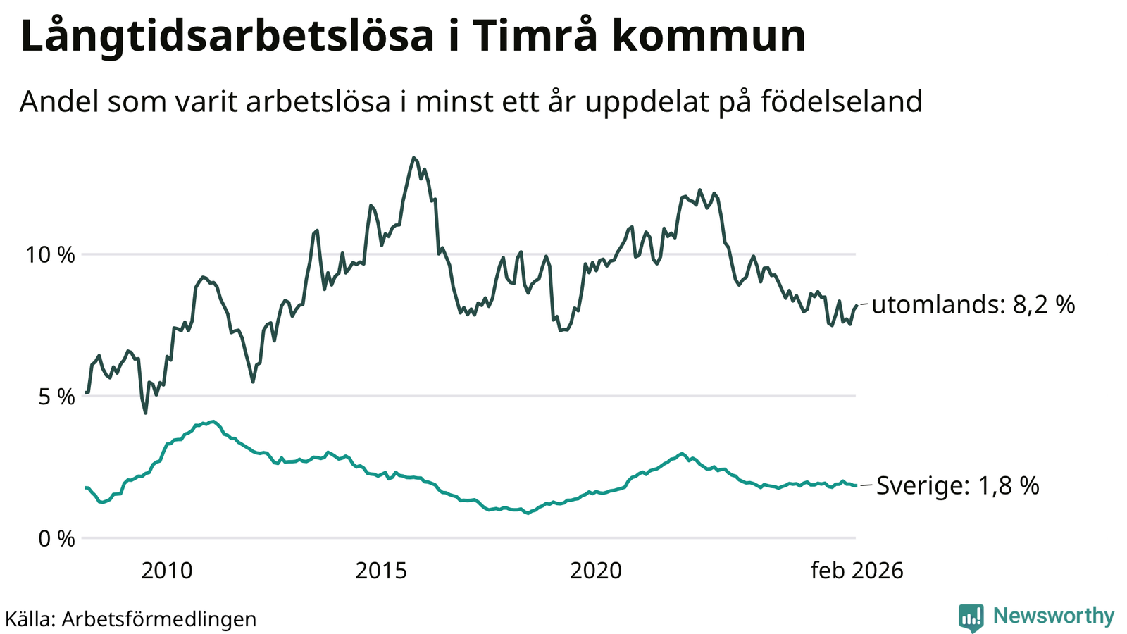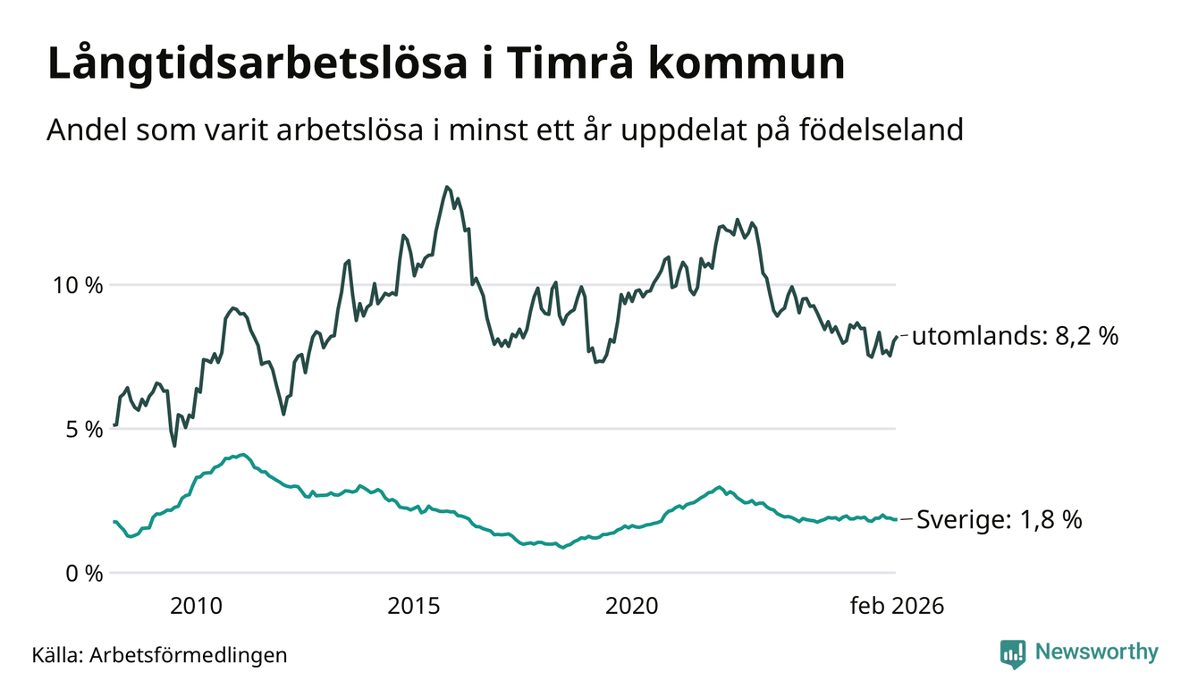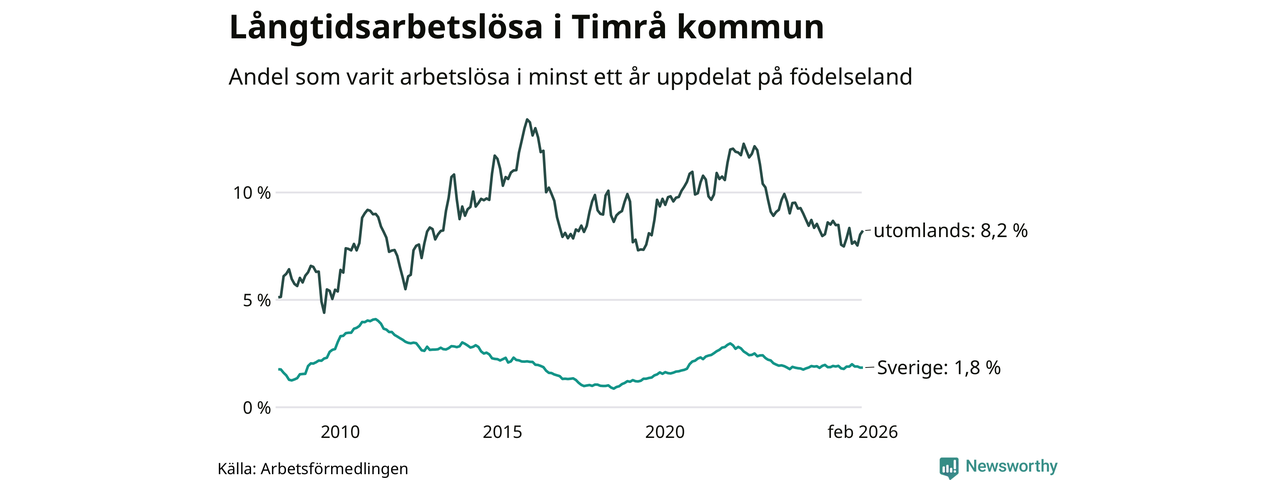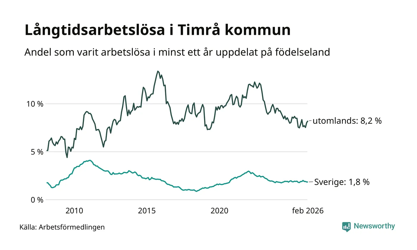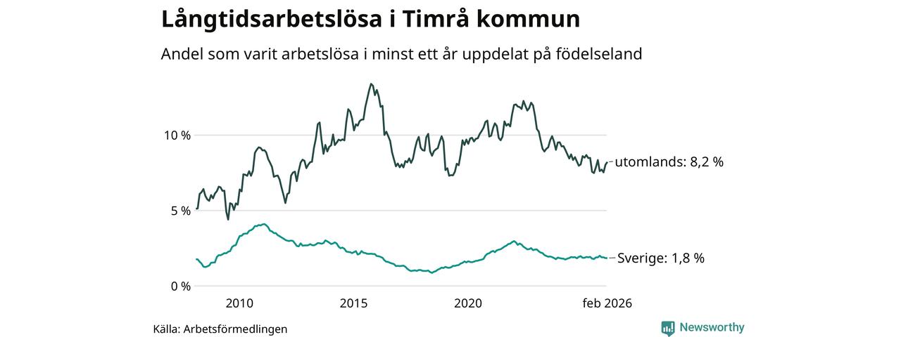 139 av de långtidsarbetslösa i Timrå är födda i Sverige, medan 89 är födda utomlands. Det innebär att långtidsarbetslösheten bland Sverigefödda är 1,8 procent, medan den är fem gånger så hög – 8,2 procent – bland födda utomlands. Även i riket som helhet är arbetslösheten högre bland utrikesfödda.