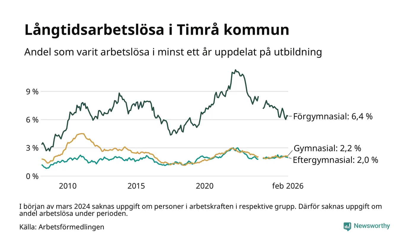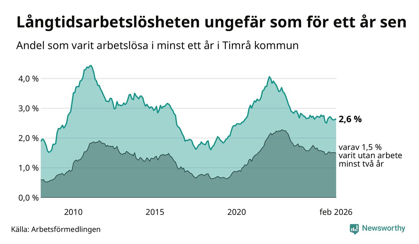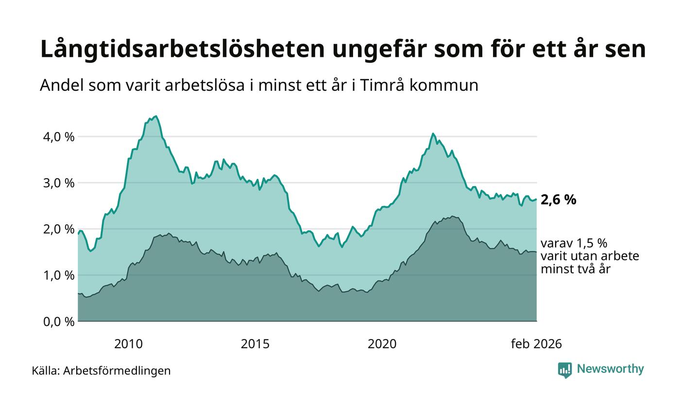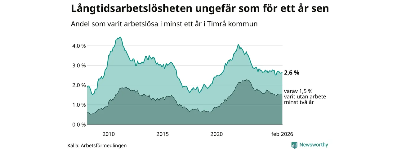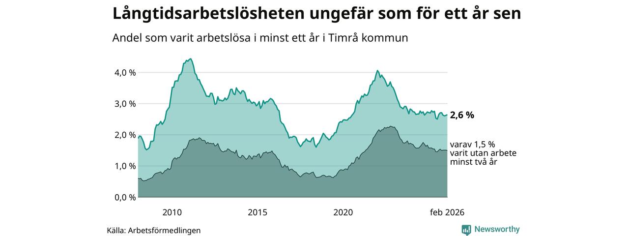 Andelen som varit utan arbete i minst ett år i Timrå var ungefär lika stor i februari jämfört med samma månad för ett år sedan. Det visar Arbetsfömedlingens senaste månadsstatistik.