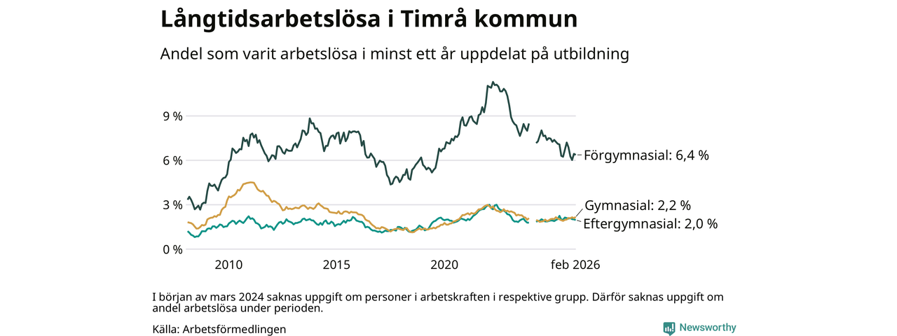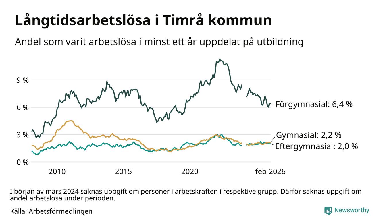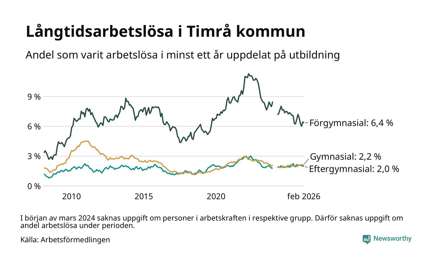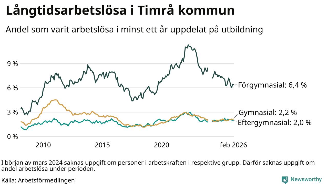 Andelen som varit utan arbete i minst ett år i Timrå var ungefär lika stor i februari jämfört med samma månad för ett år sedan. Det visar Arbetsfömedlingens senaste månadsstatistik.
