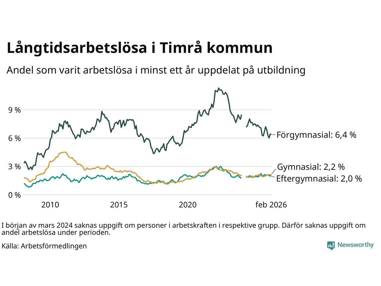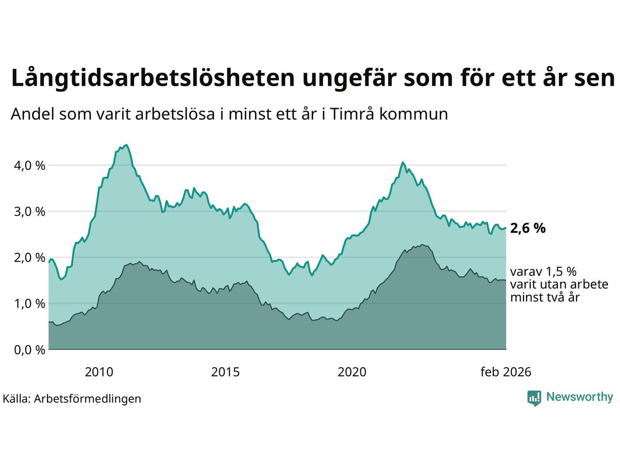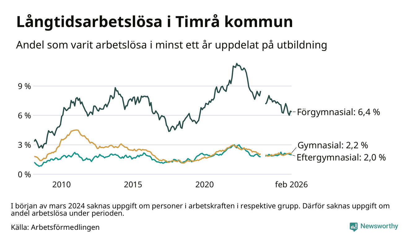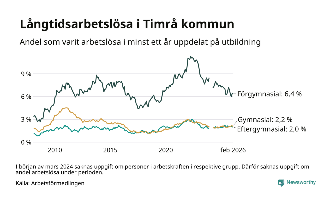 Andelen som varit utan arbete i minst ett år i Timrå var ungefär lika stor i februari jämfört med samma månad för ett år sedan. Det visar Arbetsfömedlingens senaste månadsstatistik.