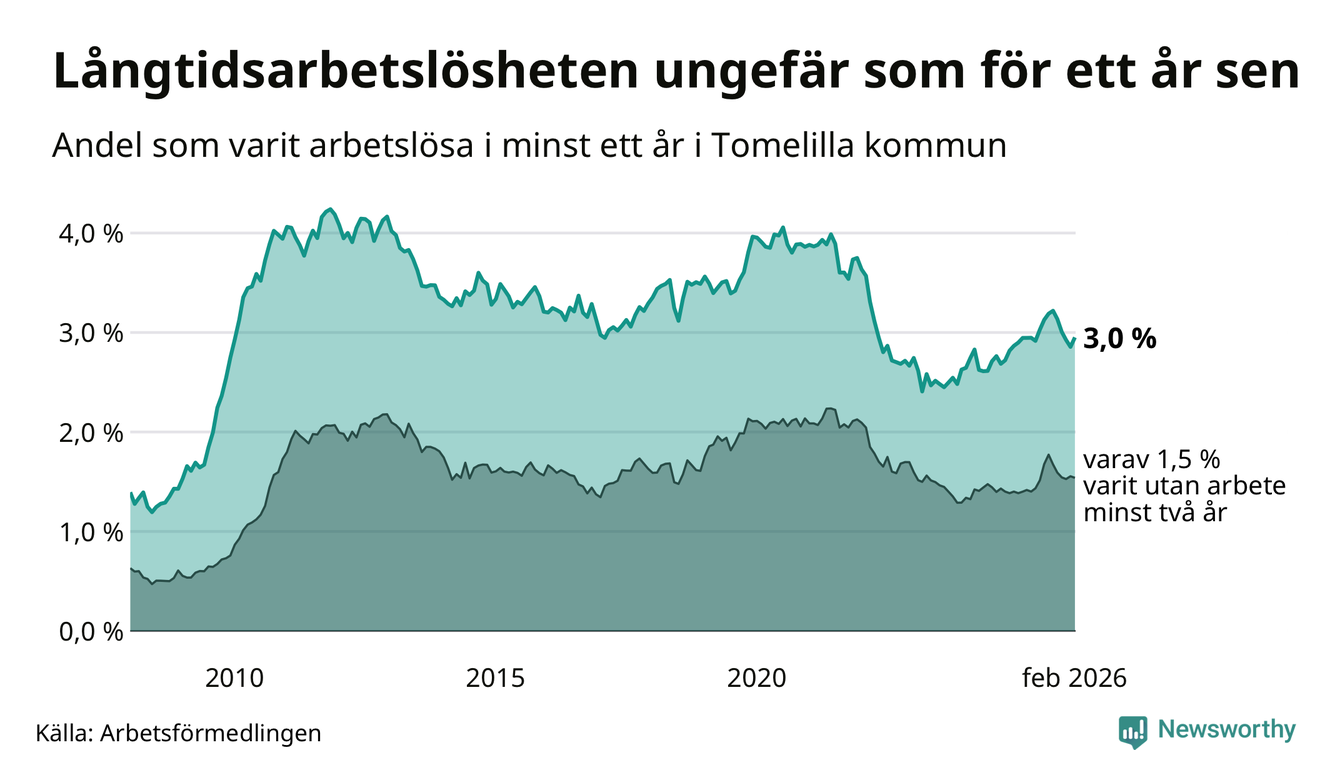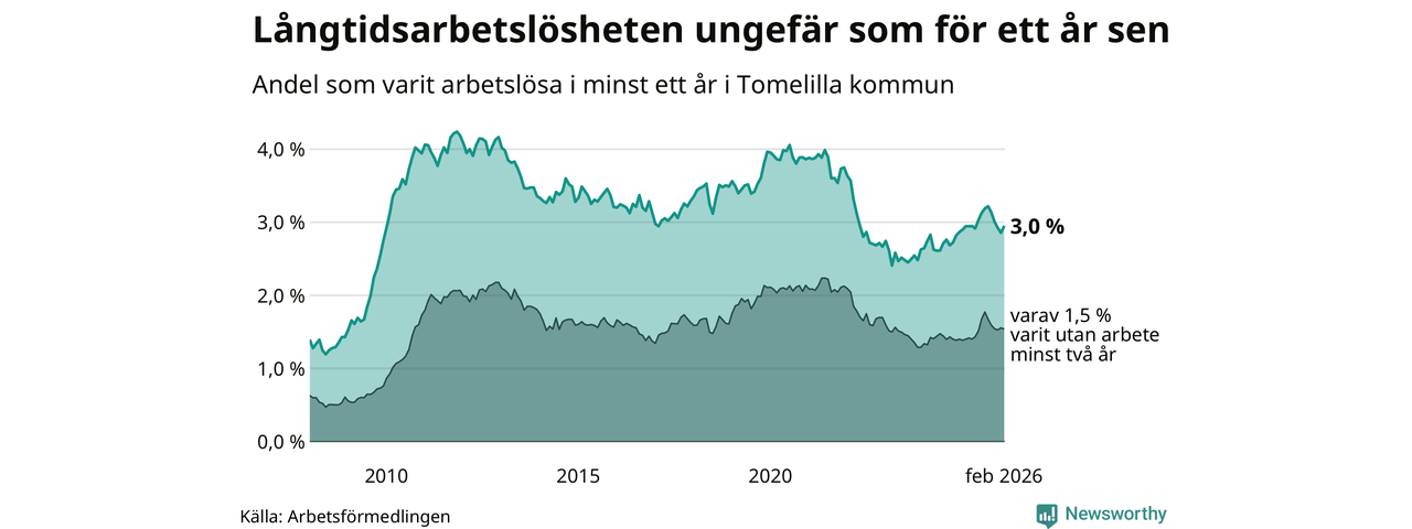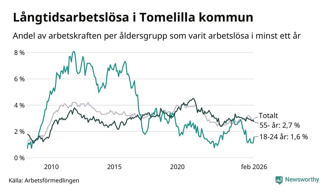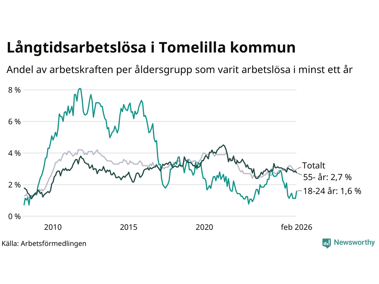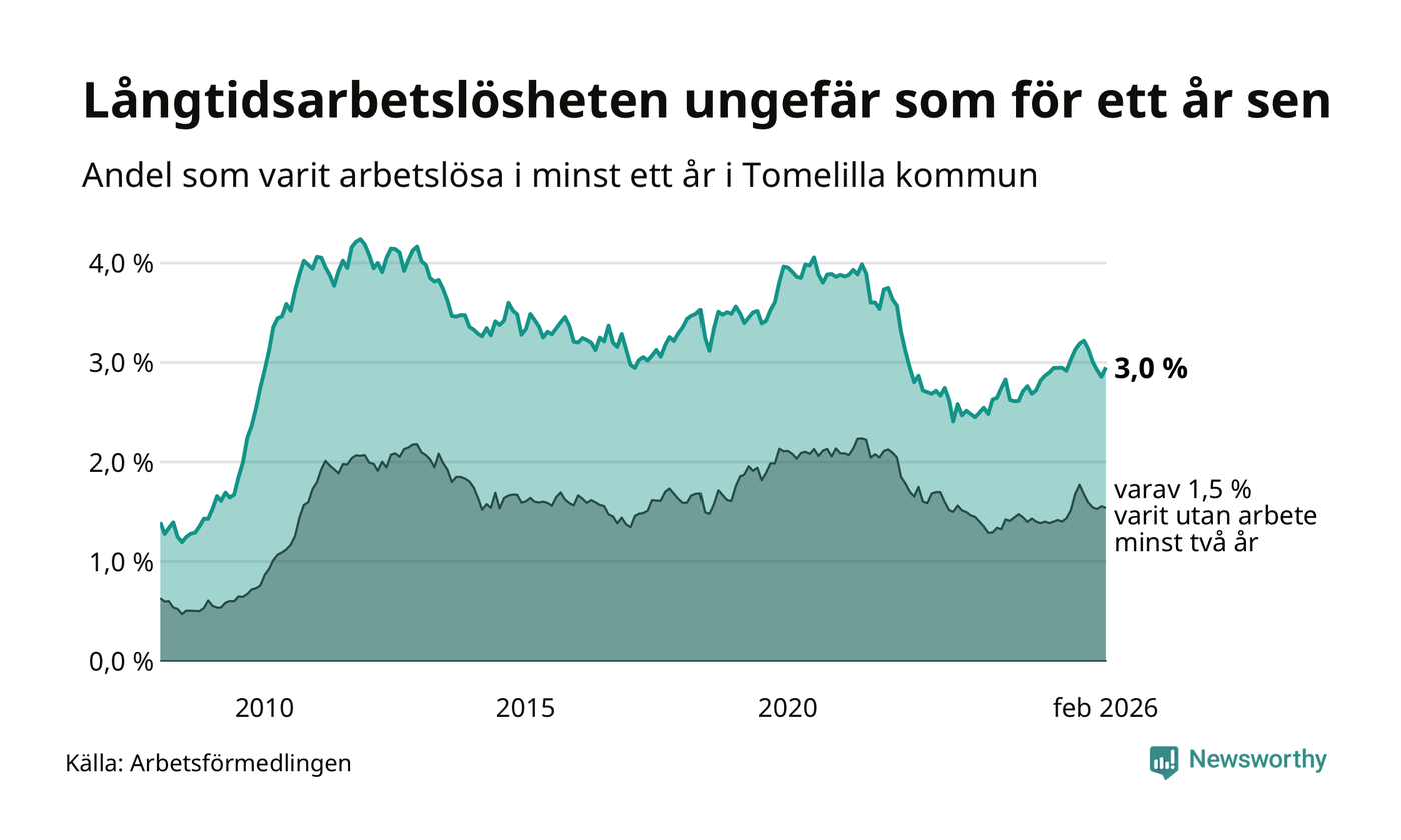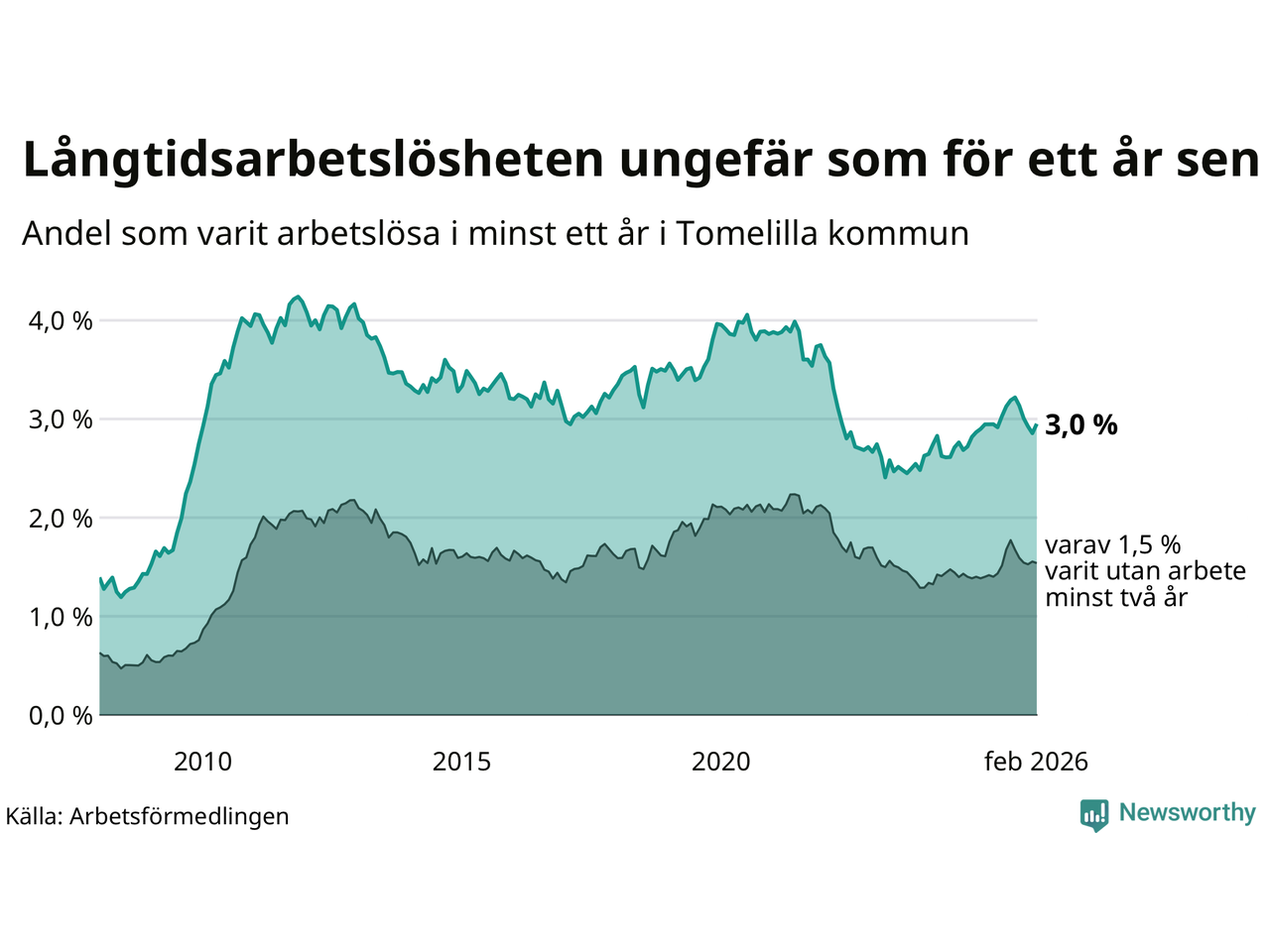 I februari hade 186 Tomelillabor varit arbetslösa i minst ett år, vilket är sex fler än månaden innan. Det är den första månaden sedan september 2025 som antalet arbetslösa ökar. 186 personer motsvarar 3,0 procent av arbetskraften i kommunen – andelen långtidsarbetslösa är ungefär på samma nivå som för ett år sedan.