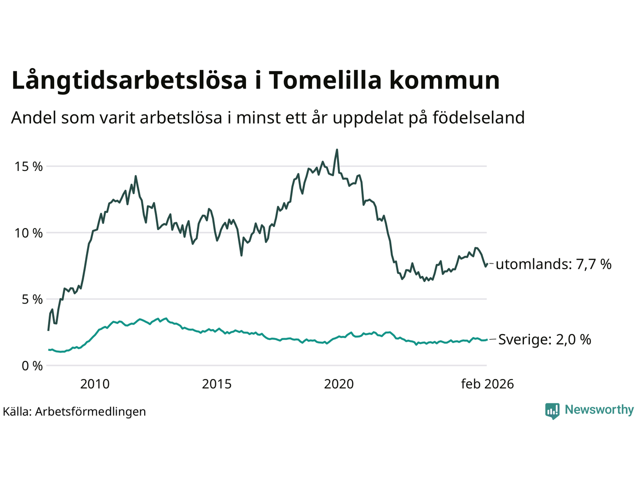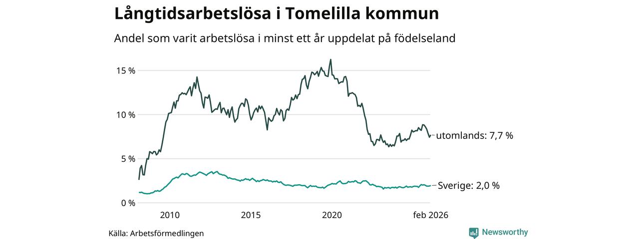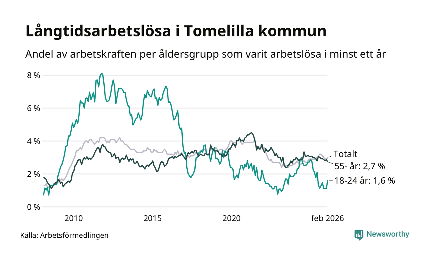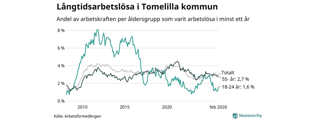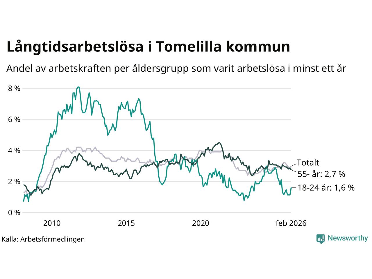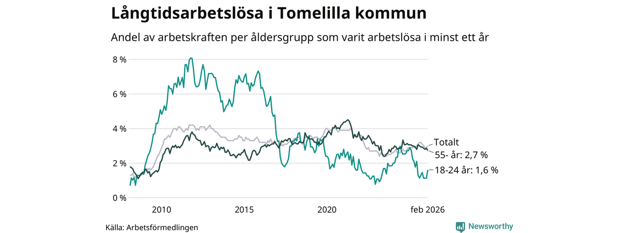 I februari hade 186 Tomelillabor varit arbetslösa i minst ett år, vilket är sex fler än månaden innan. Det är den första månaden sedan september 2025 som antalet arbetslösa ökar. 186 personer motsvarar 3,0 procent av arbetskraften i kommunen – andelen långtidsarbetslösa är ungefär på samma nivå som för ett år sedan.