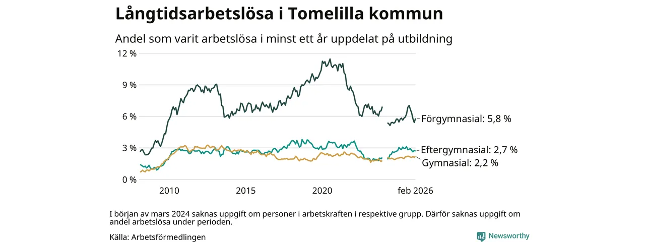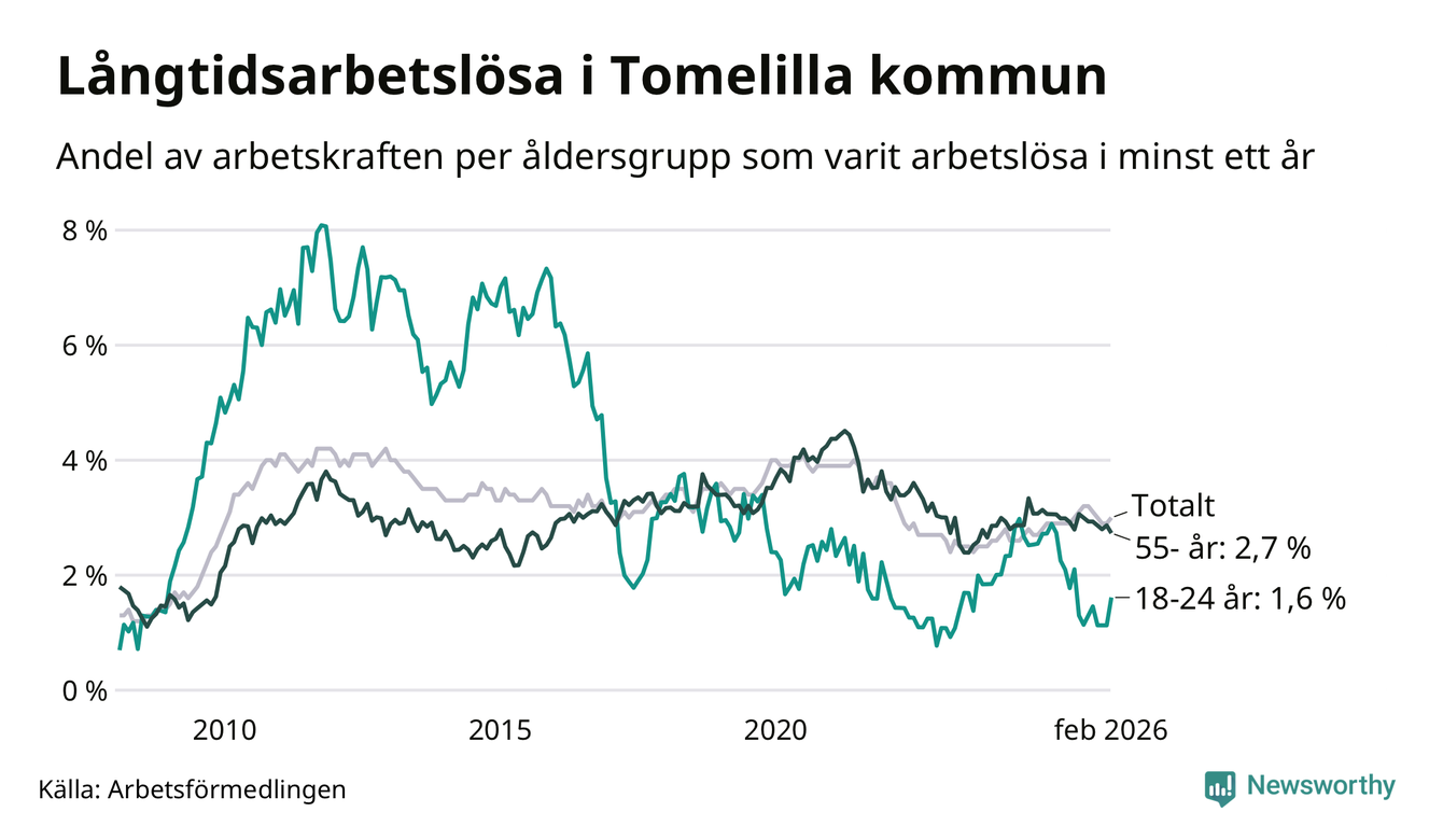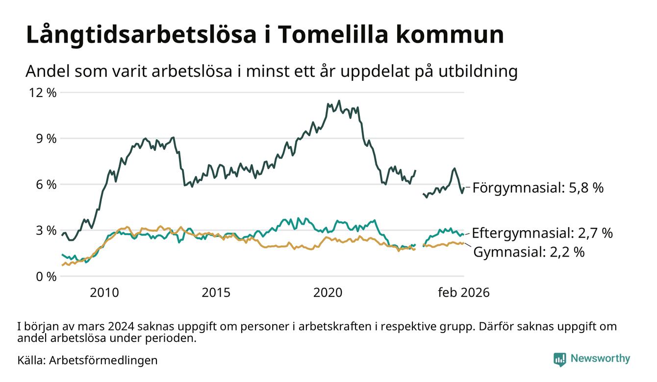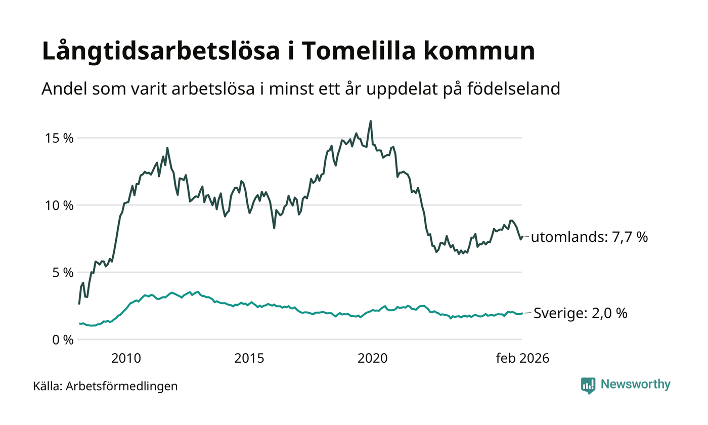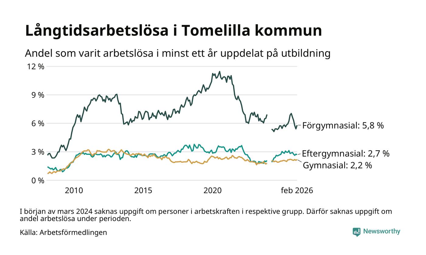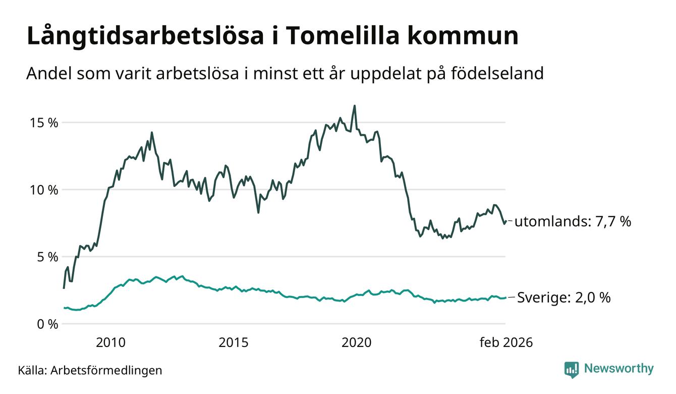 I februari hade 186 Tomelillabor varit arbetslösa i minst ett år, vilket är sex fler än månaden innan. Det är den första månaden sedan september 2025 som antalet arbetslösa ökar. 186 personer motsvarar 3,0 procent av arbetskraften i kommunen – andelen långtidsarbetslösa är ungefär på samma nivå som för ett år sedan.