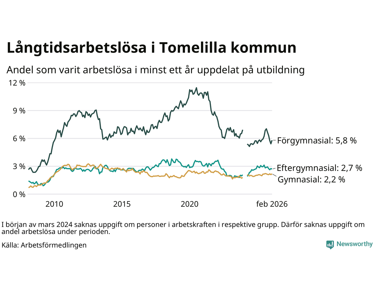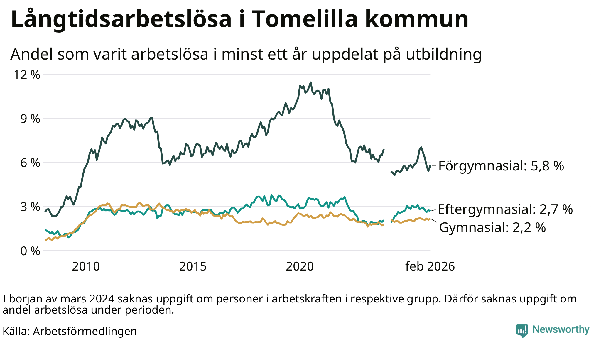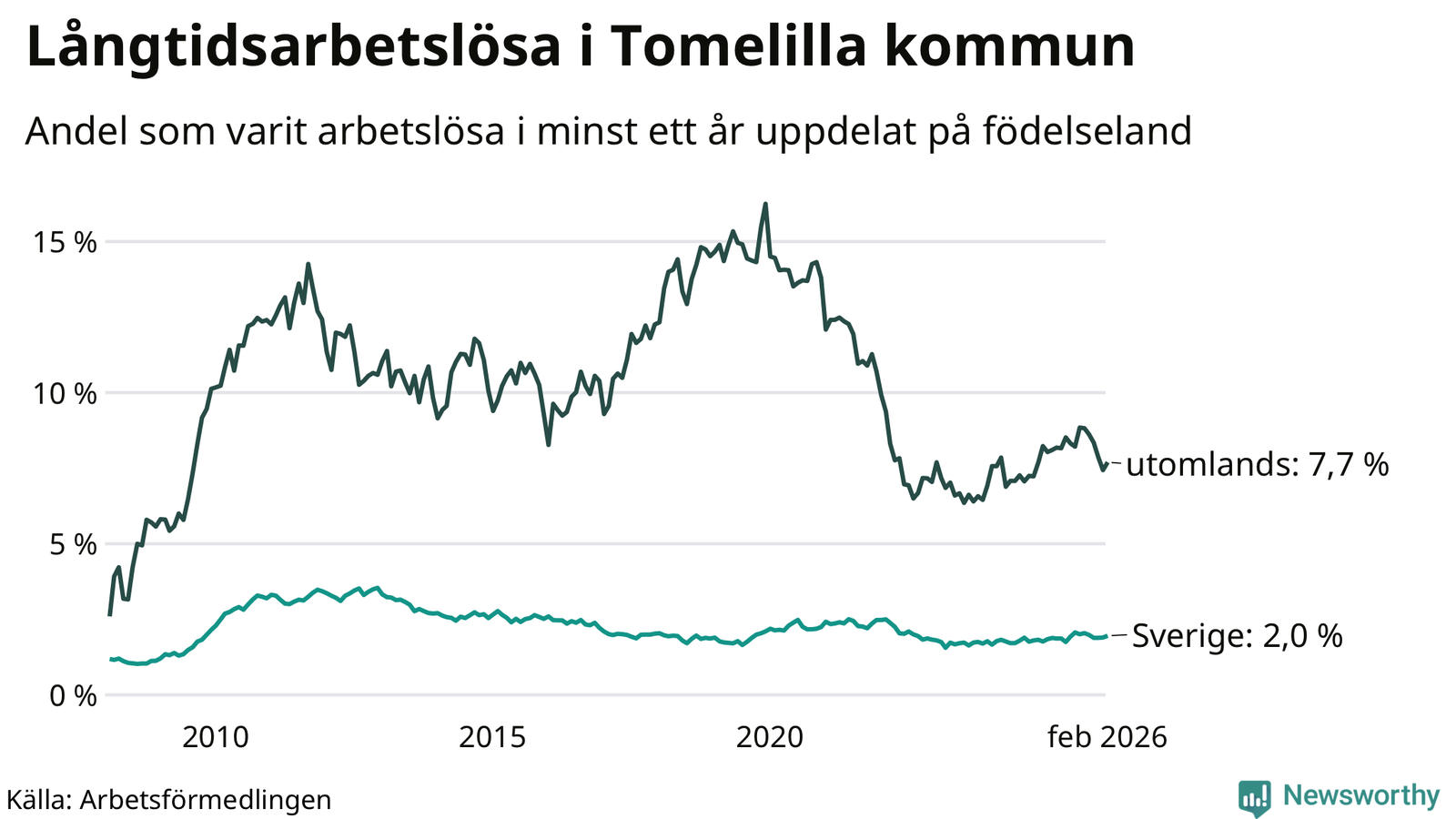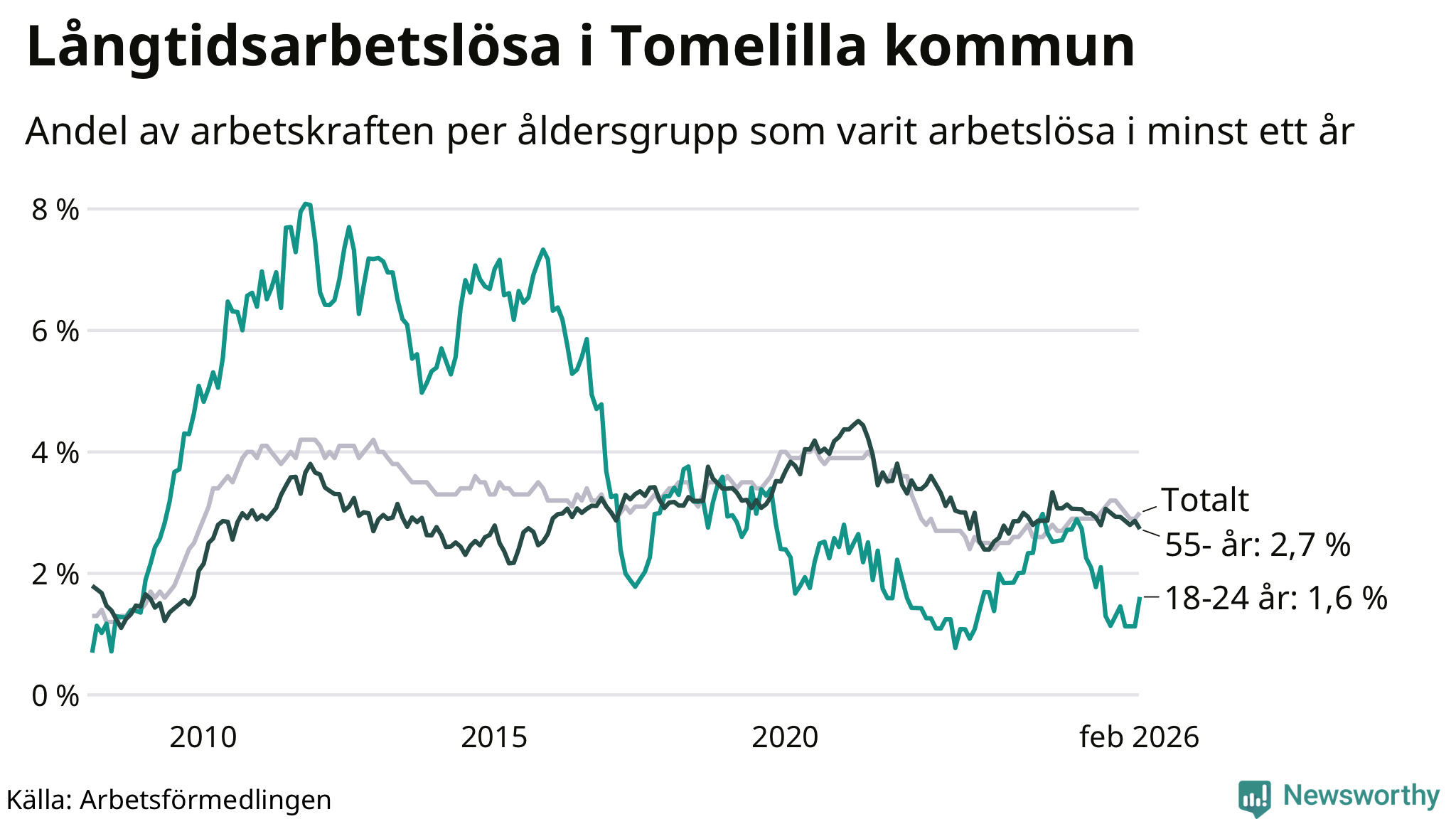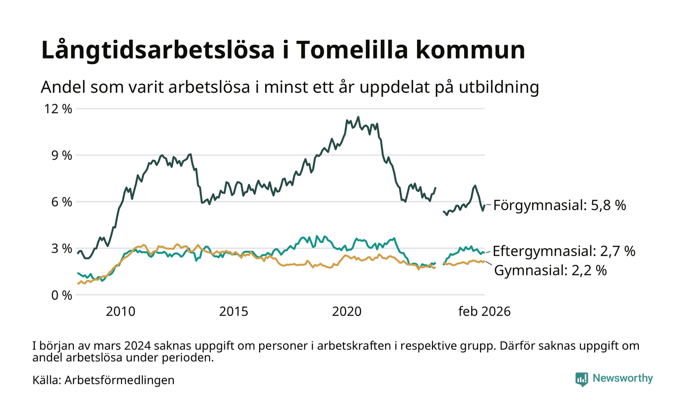 I februari hade 186 Tomelillabor varit arbetslösa i minst ett år, vilket är sex fler än månaden innan. Det är den första månaden sedan september 2025 som antalet arbetslösa ökar. 186 personer motsvarar 3,0 procent av arbetskraften i kommunen – andelen långtidsarbetslösa är ungefär på samma nivå som för ett år sedan.