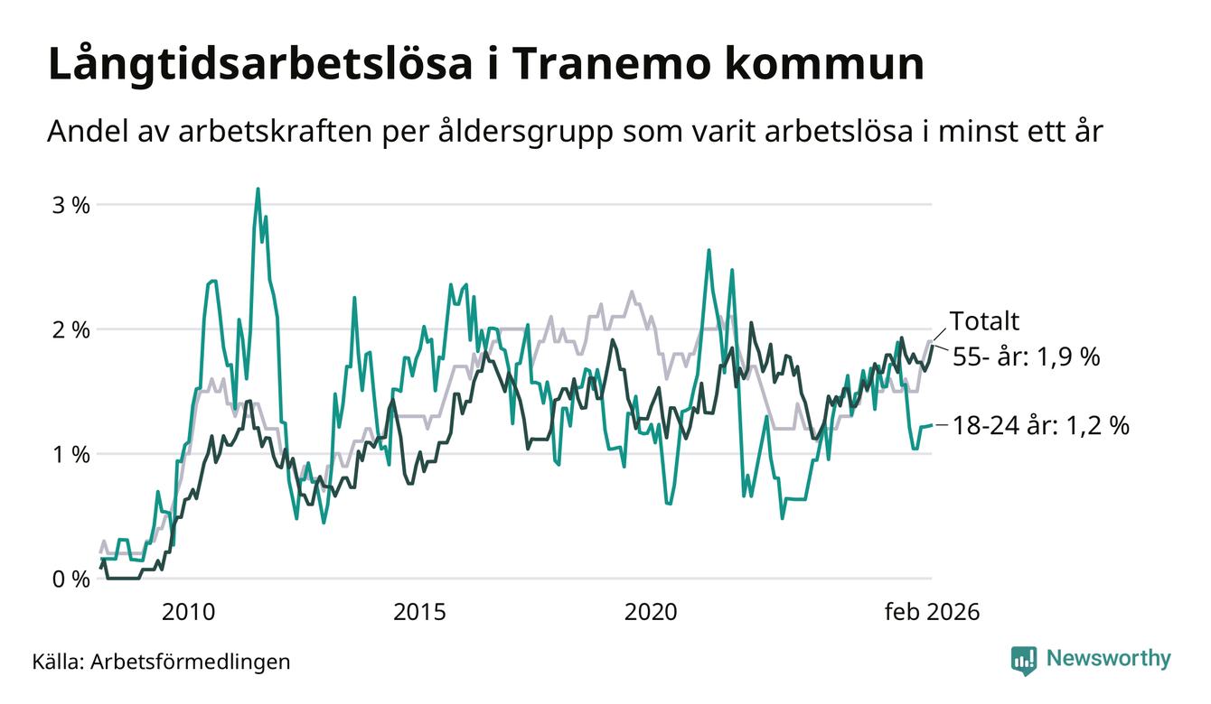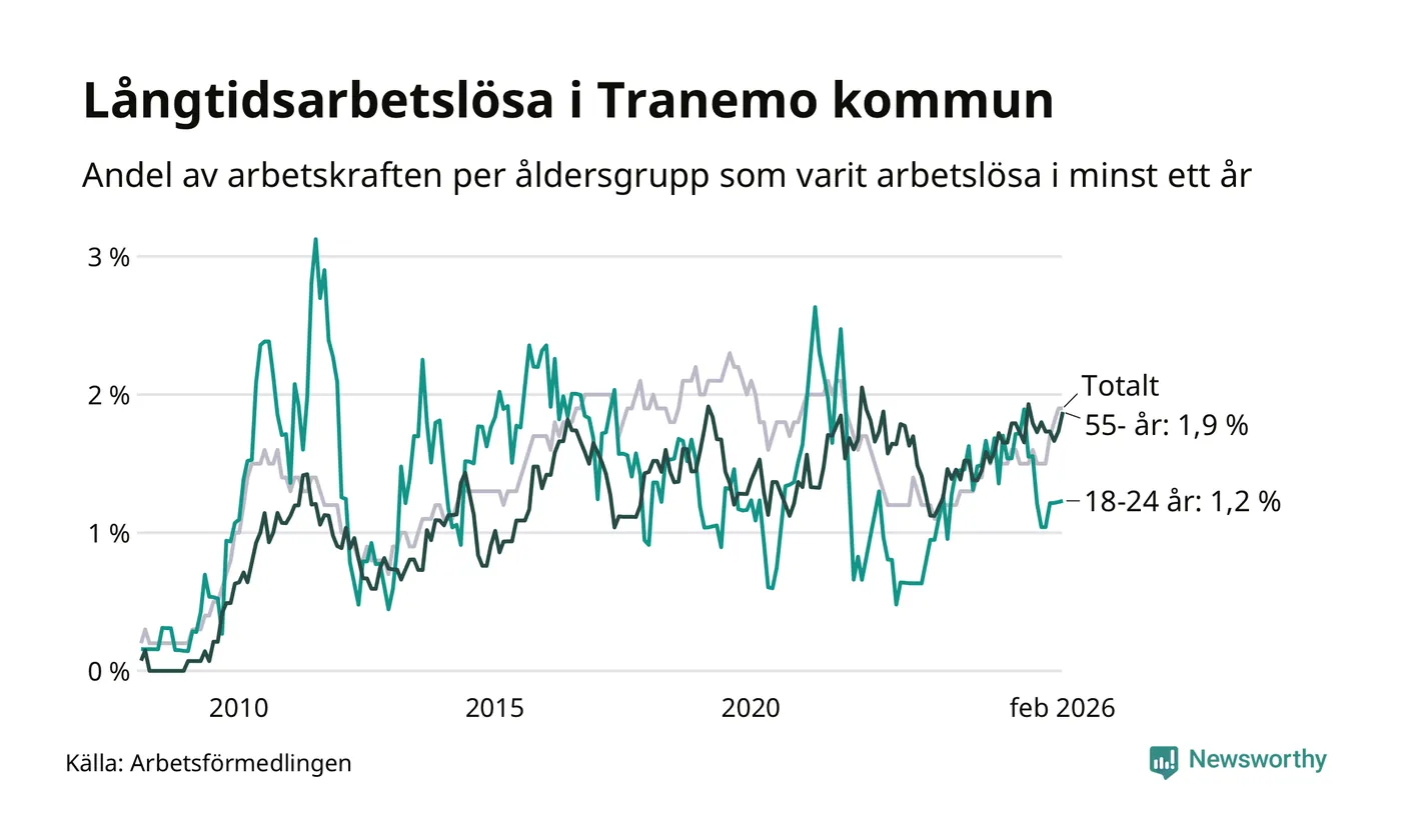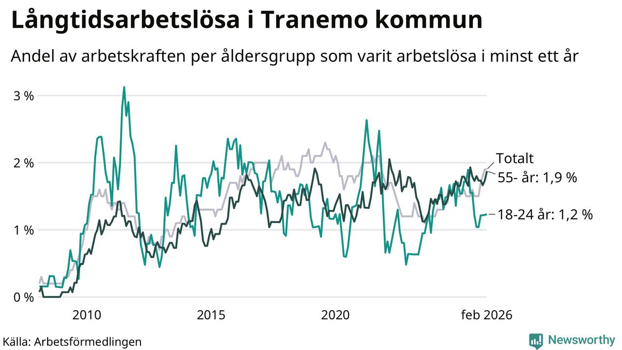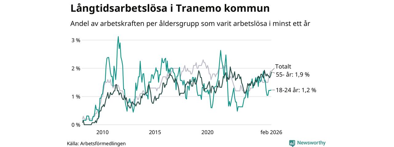 Av de 107 personerna som varit arbetslösa i mer än ett år i Tranemo kommun är 27 personer mellan 55 och 661 år och sju är mellan 18 och 24 år. För den äldre gruppen är andelen arbetslösa 1,9 procent medan den i den yngre gruppen är 1,2 procent. Även i riket som helhet är långtidsarbetslösheten högre i gruppen äldre.