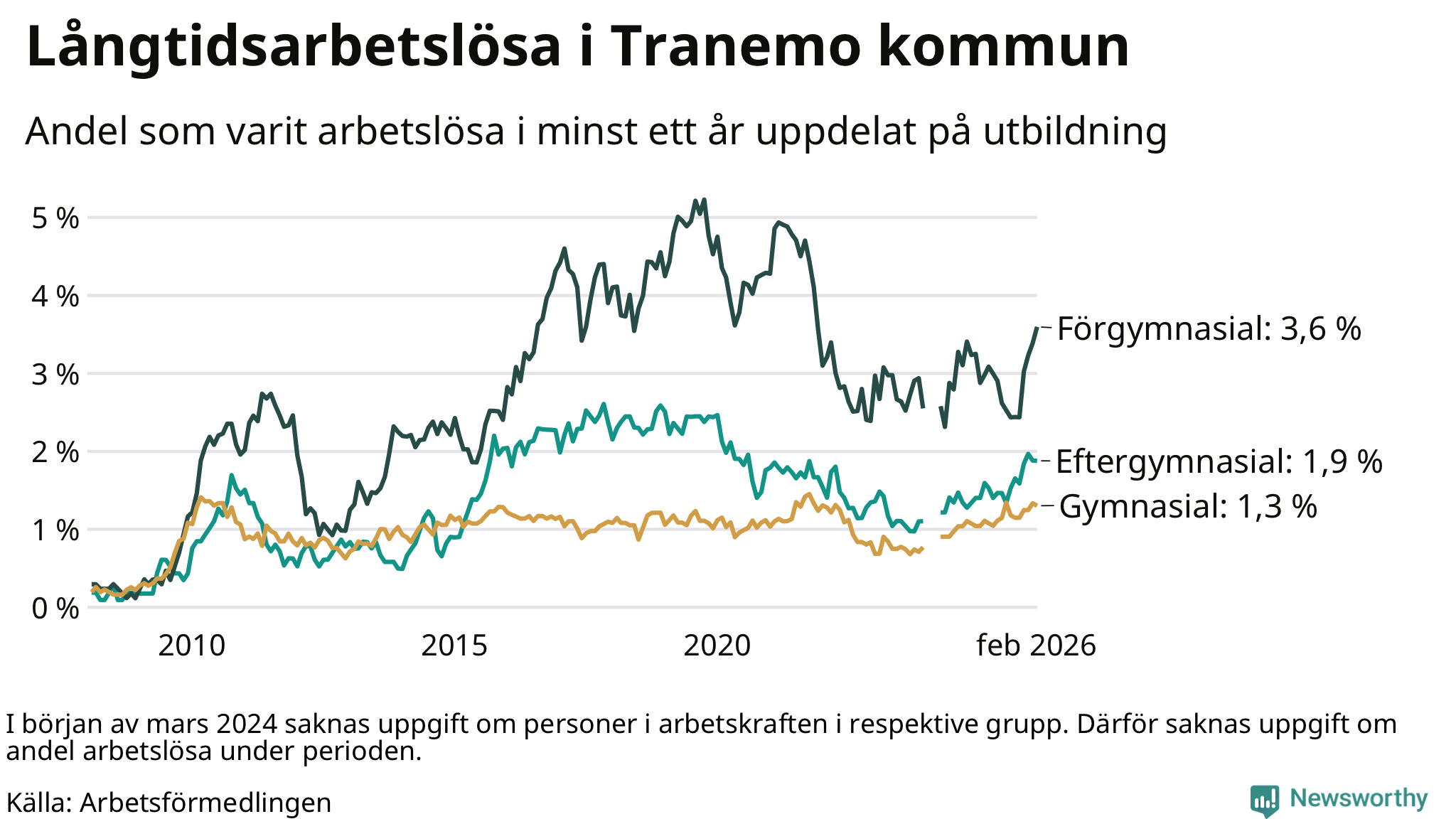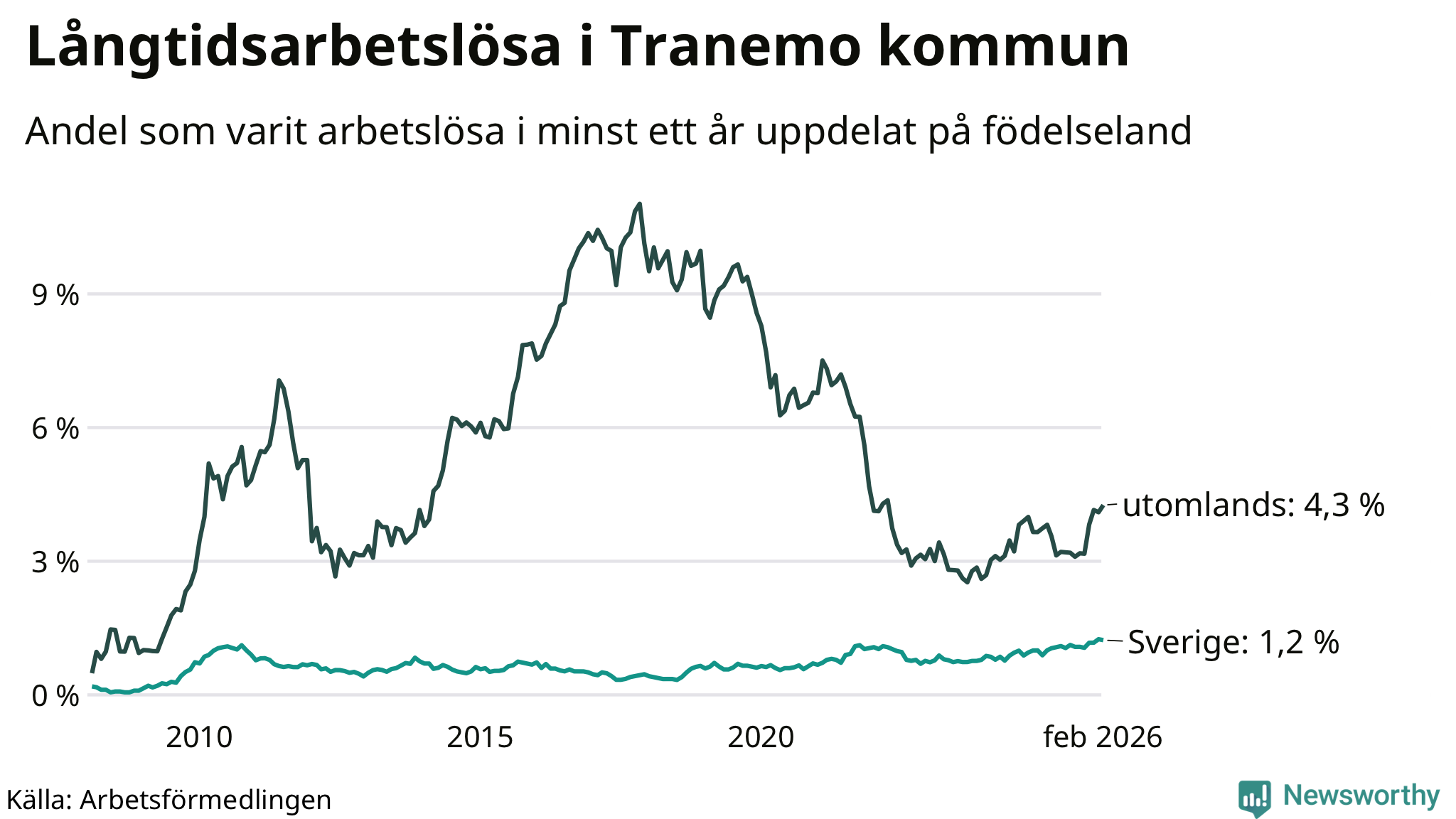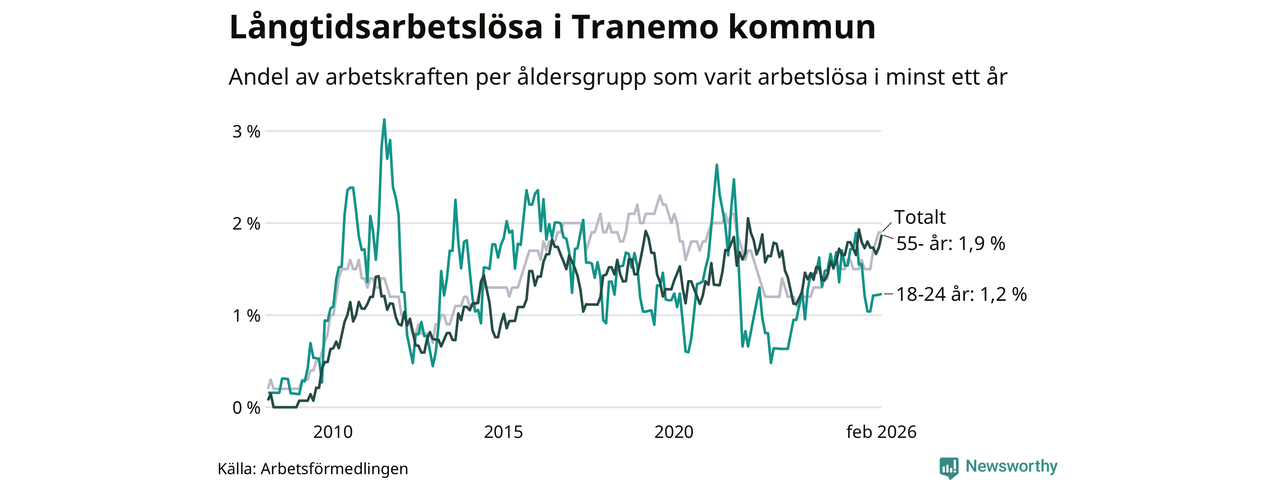 I februari hade 107 Tranemobor varit arbetslösa i minst ett år, vilket är en fler än månaden innan. Det är den fjärde månaden i rad med ökande antal långtidsarbetslösa. 107 personer motsvarar 1,9 procent av arbetskraften i kommunen – andelen långtidsarbetslösa är 0,3 procentenheter högre än samma månad för ett år sedan.