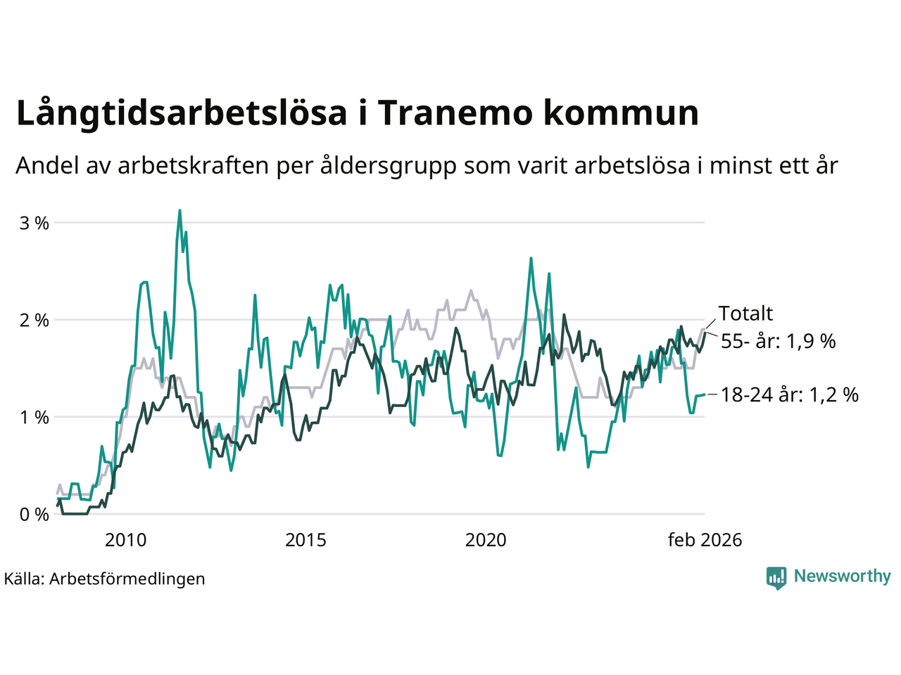 | Andel arbetslösa i minst två år | 0,8 % | 1,3 % | 1,6 % |