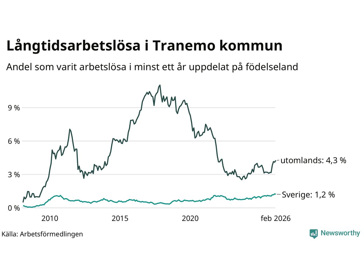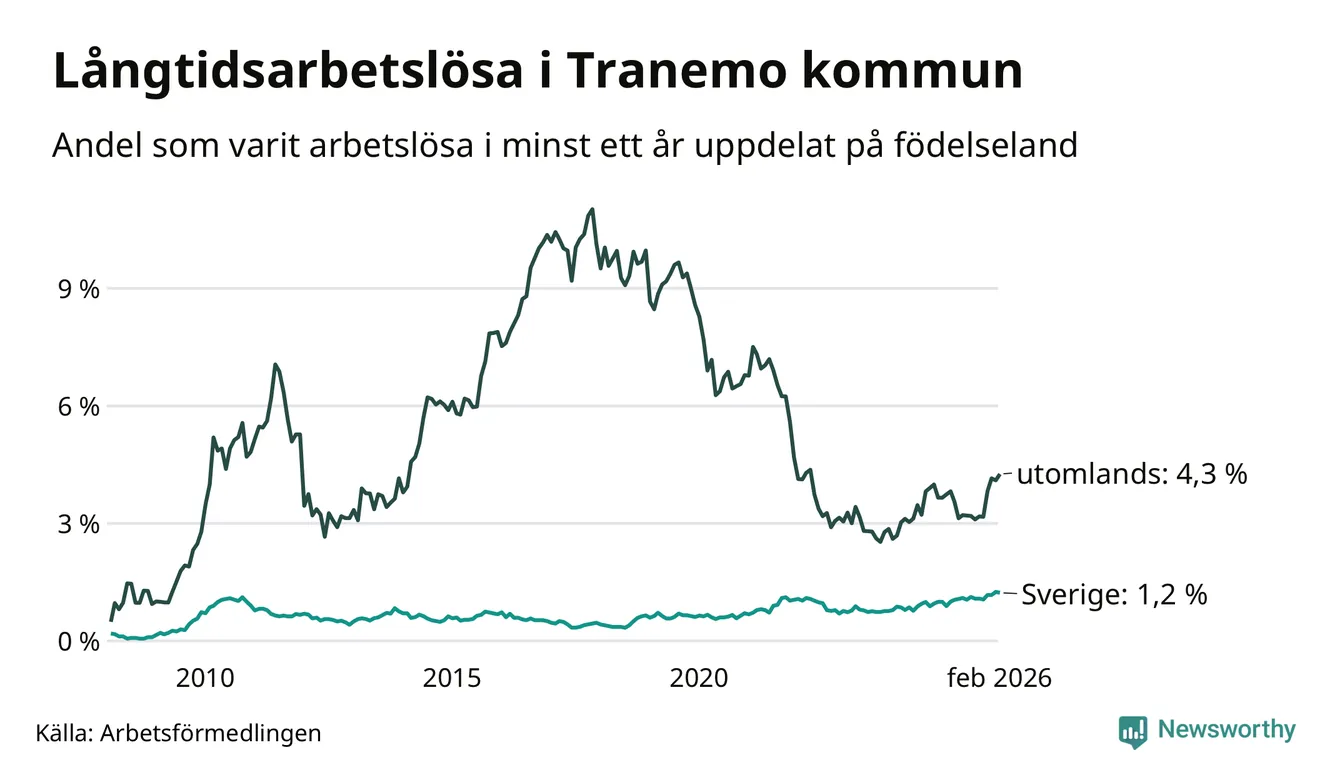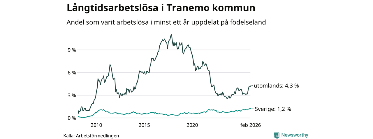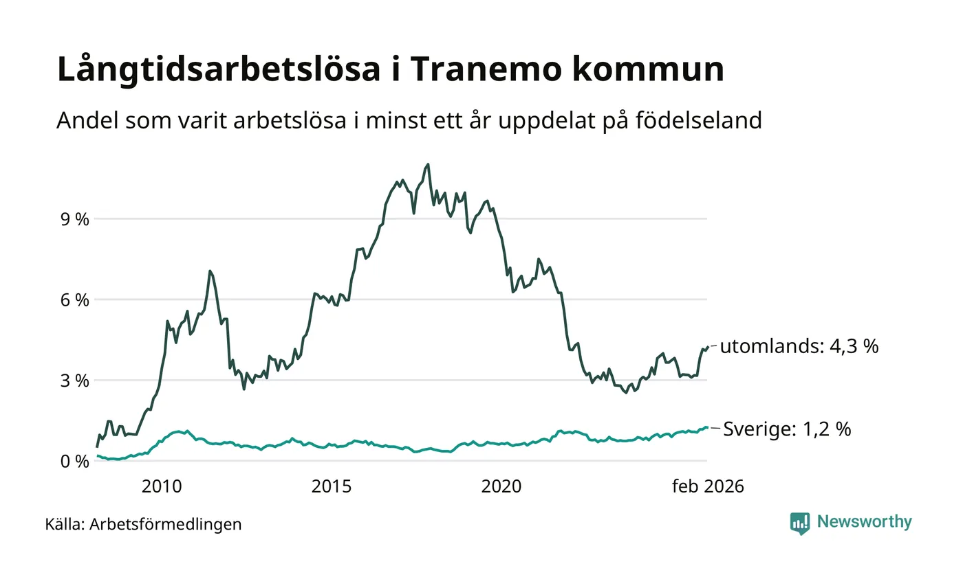 55 av de långtidsarbetslösa i Tranemo är födda i Sverige, medan 52 är födda utomlands. Det innebär att långtidsarbetslösheten bland Sverigefödda är 1,2 procent, medan den är fyra gånger så hög – 4,3 procent – bland födda utomlands. Även i riket som helhet är arbetslösheten högre bland utrikesfödda.