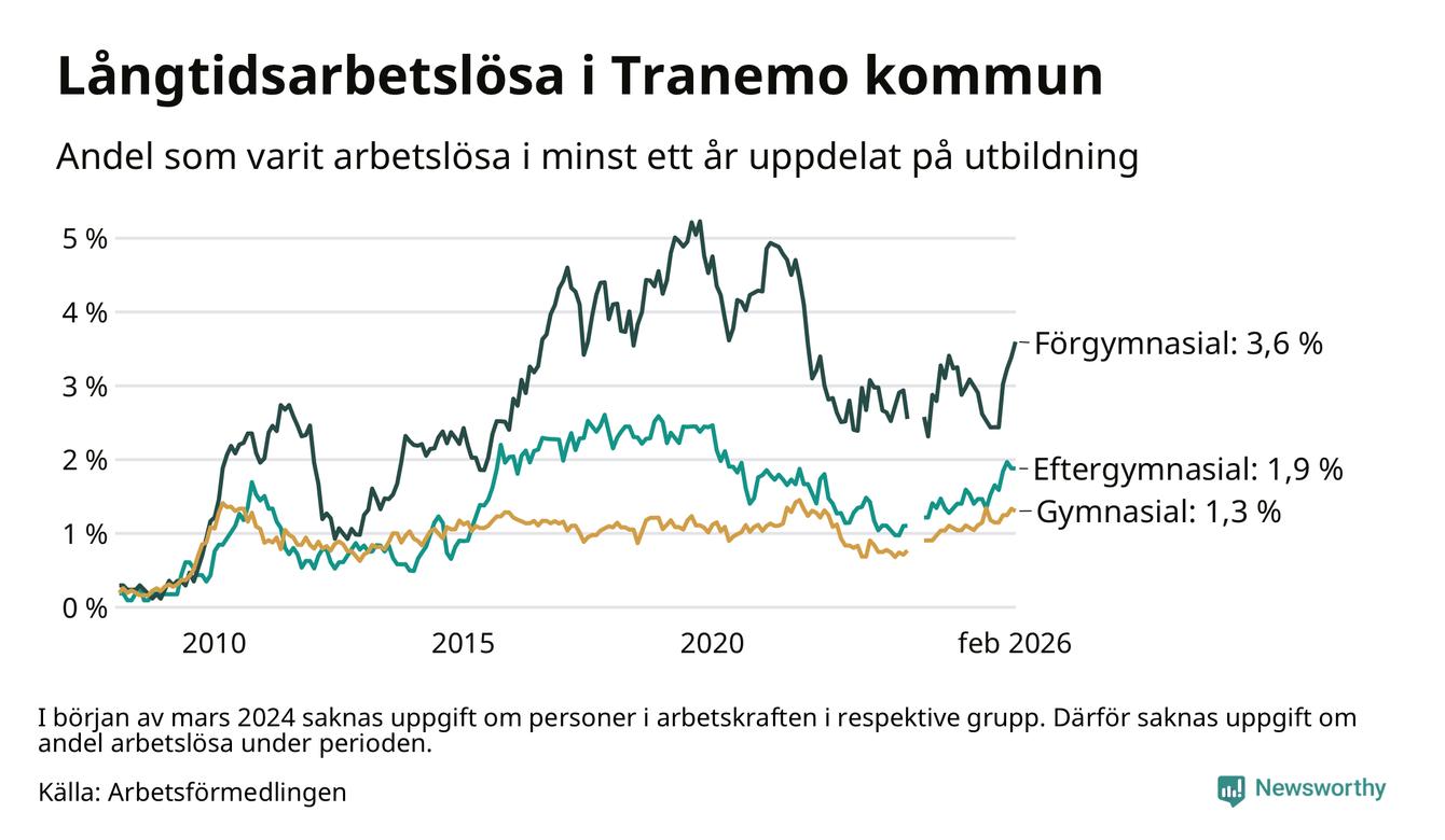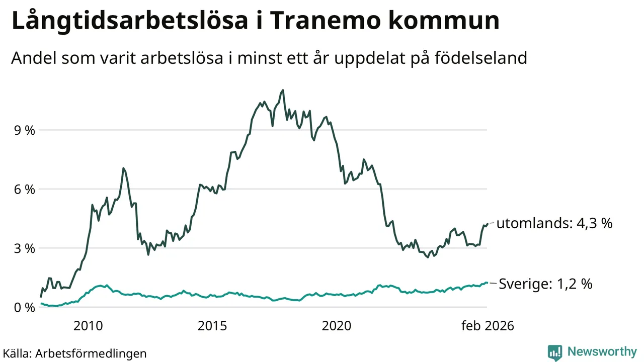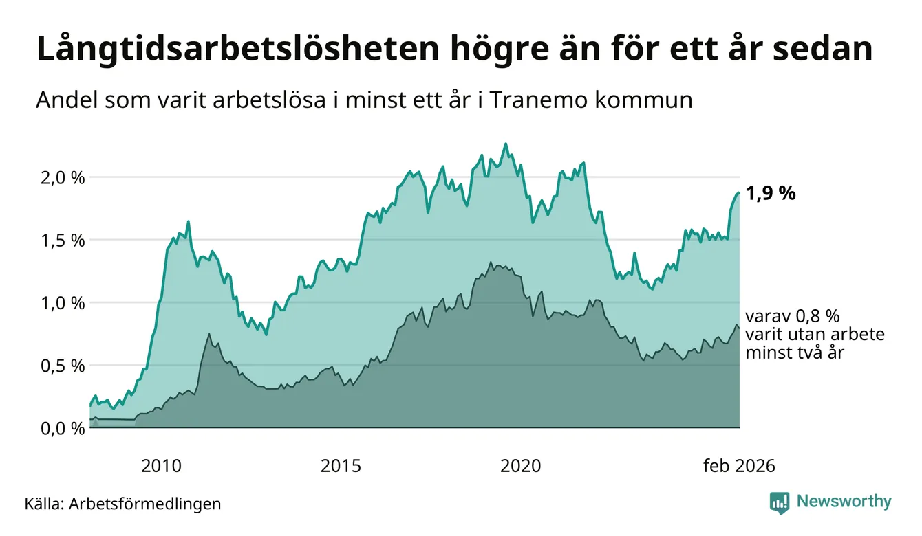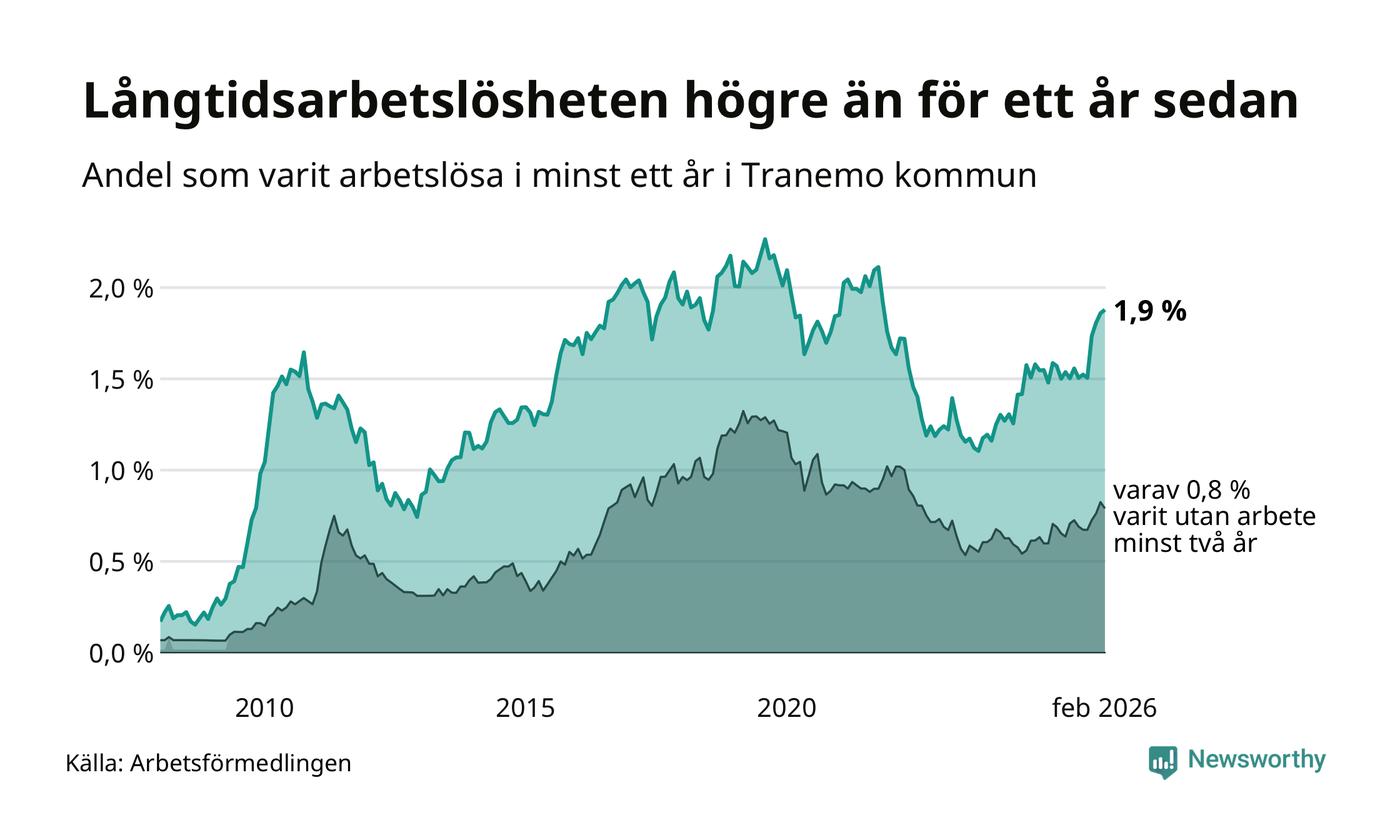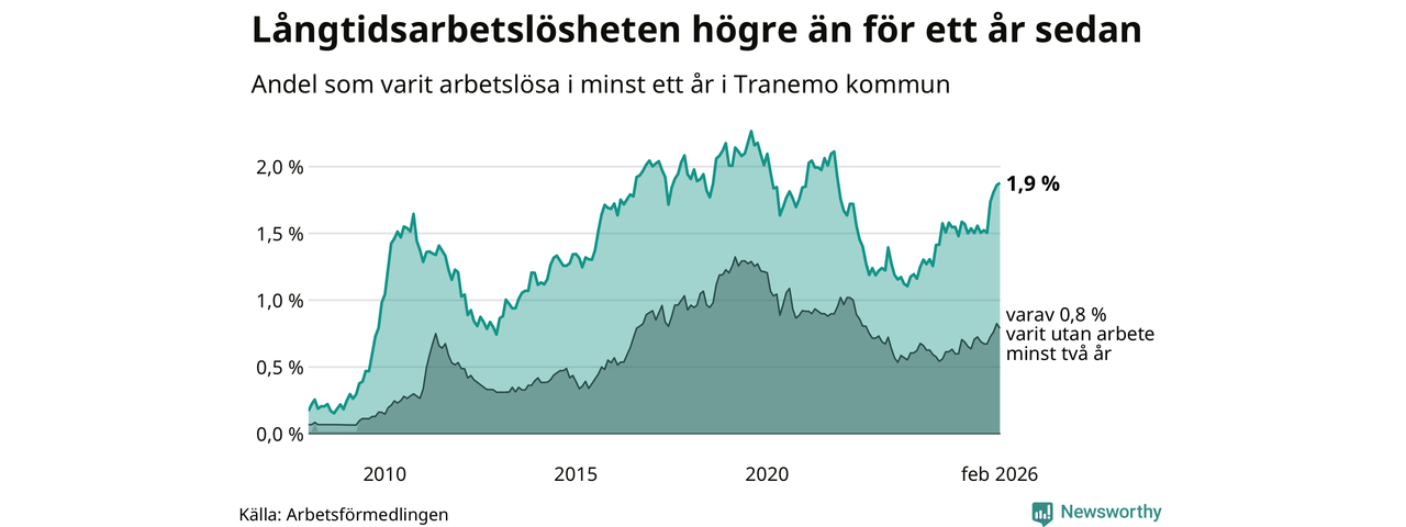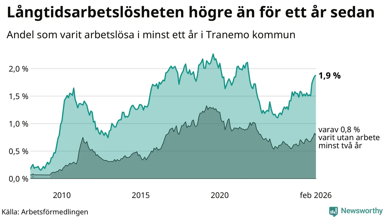 Inte sedan november 2021 har andelen långtidsarbetslösa varit så hög i Tranemo. Det visar Arbetsförmedlingens senaste månadsstatistik.