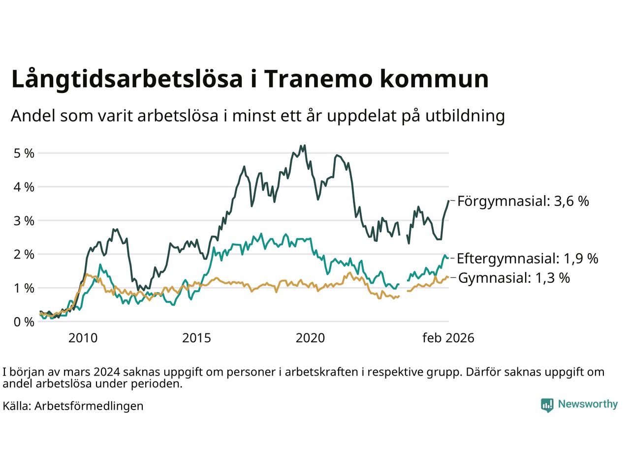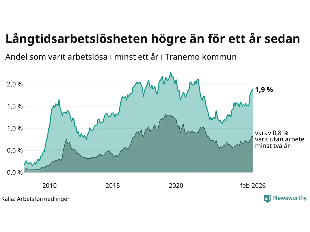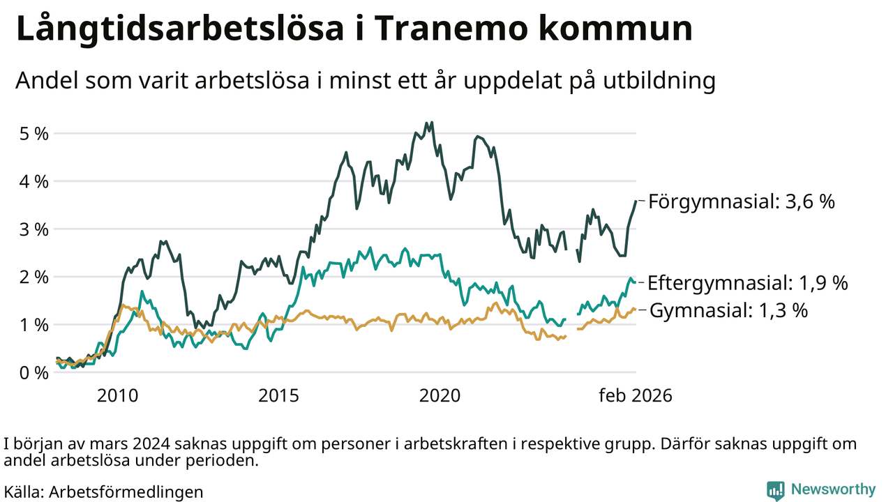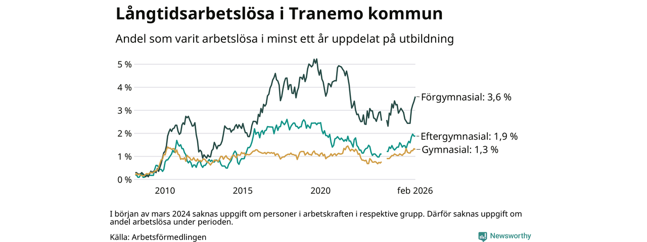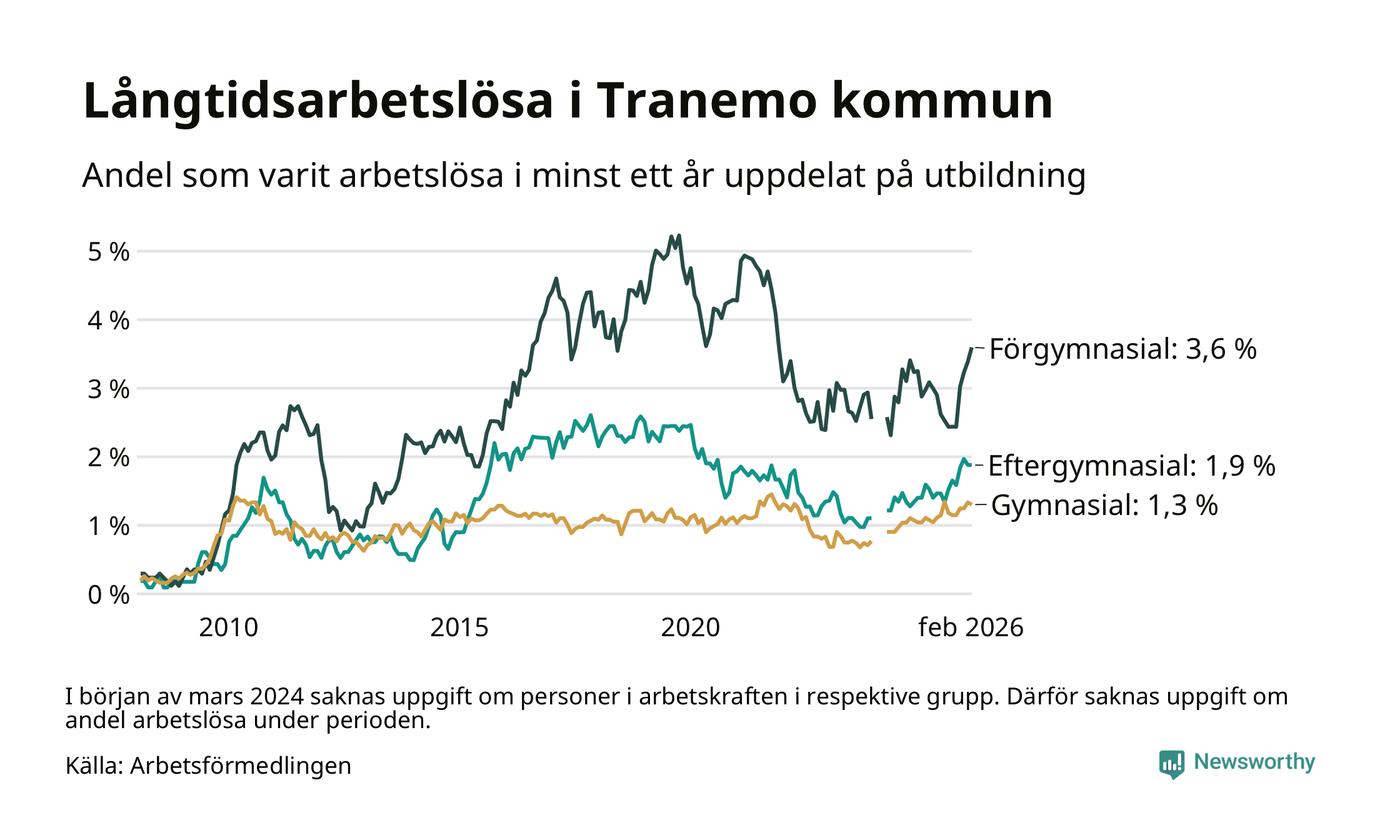 Inte sedan november 2021 har andelen långtidsarbetslösa varit så hög i Tranemo. Det visar Arbetsförmedlingens senaste månadsstatistik.