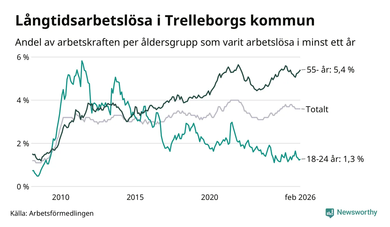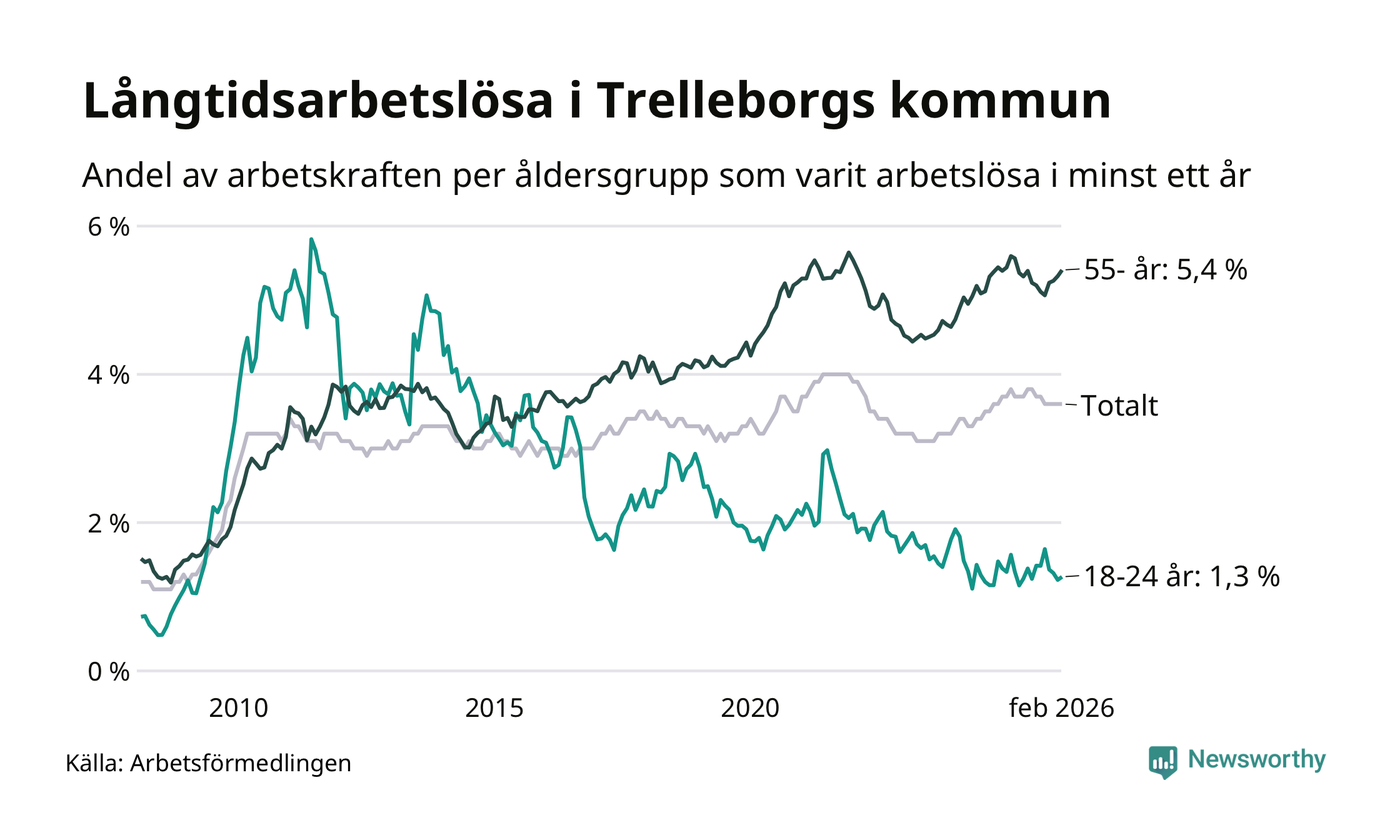 Av de 846 personerna som varit arbetslösa i mer än ett år i Trelleborgs kommun är 301 personer mellan 55 och 661 år och 28 är mellan 18 och 24 år. För den äldre gruppen är andelen arbetslösa 5,4 procent medan den i den yngre gruppen är 1,3 procent. Även i riket som helhet är långtidsarbetslösheten högre i gruppen äldre.