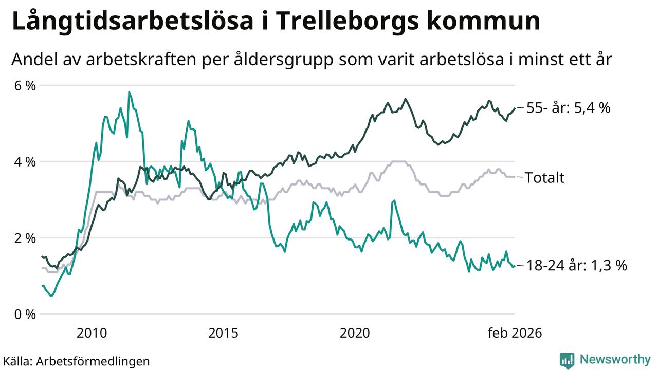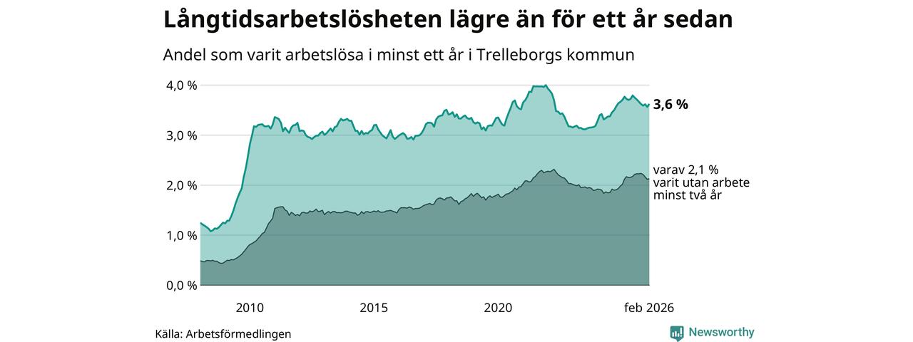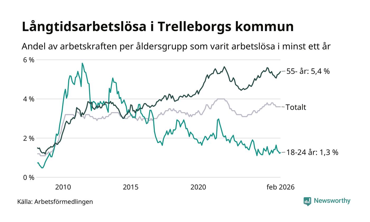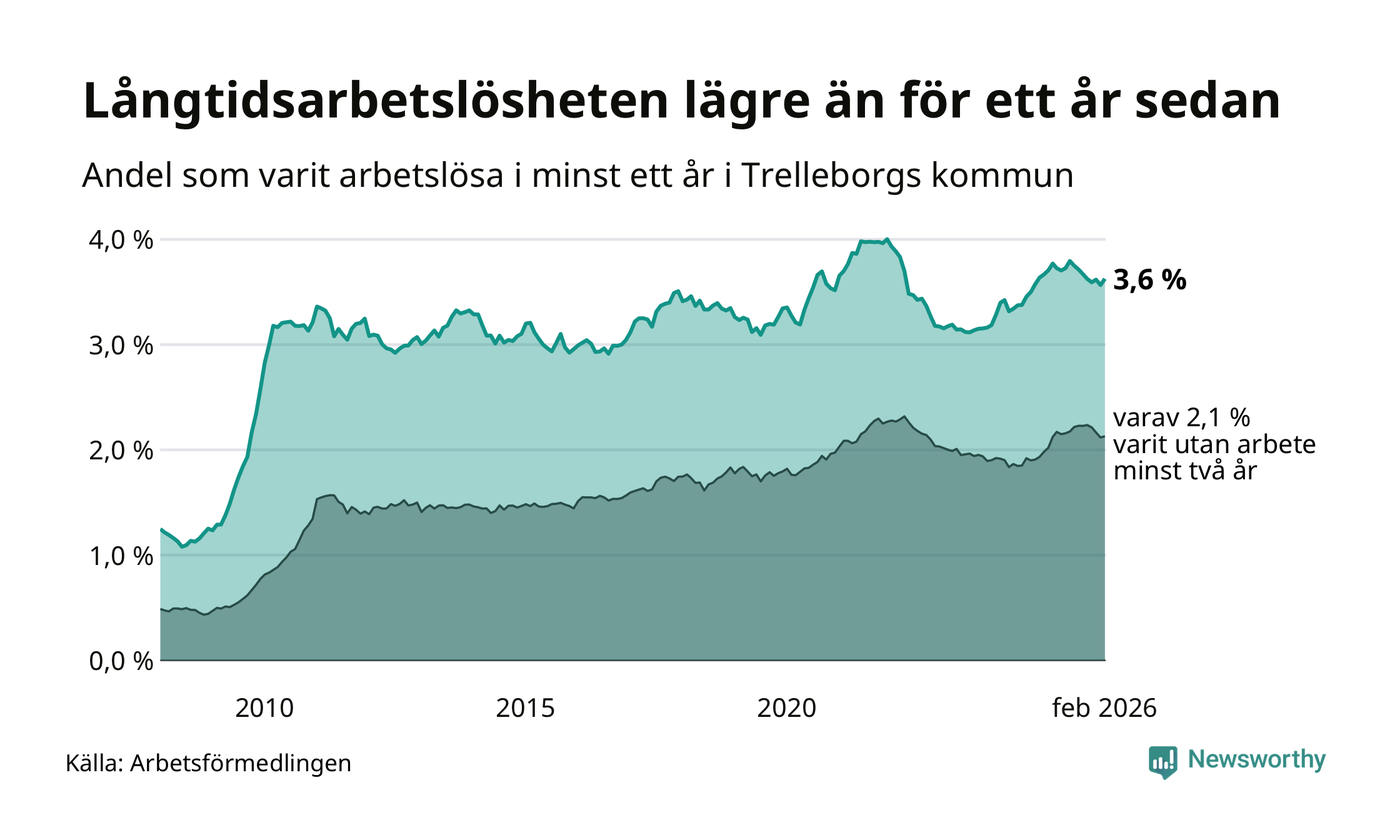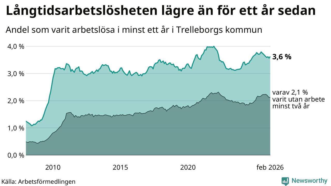 I februari hade 846 Trelleborgsbor varit arbetslösa i minst ett år, vilket är 14 fler än månaden innan. 846 personer motsvarar 3,6 procent av arbetskraften i kommunen – andelen långtidsarbetslösa är 0,2 procentenheter lägre än samma månad för ett år sedan.