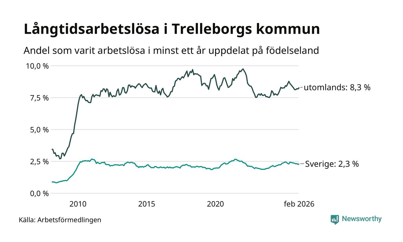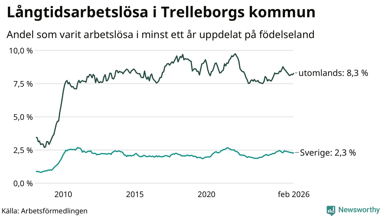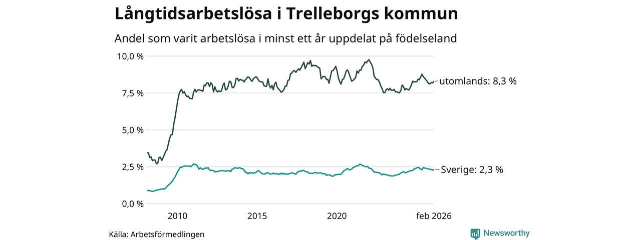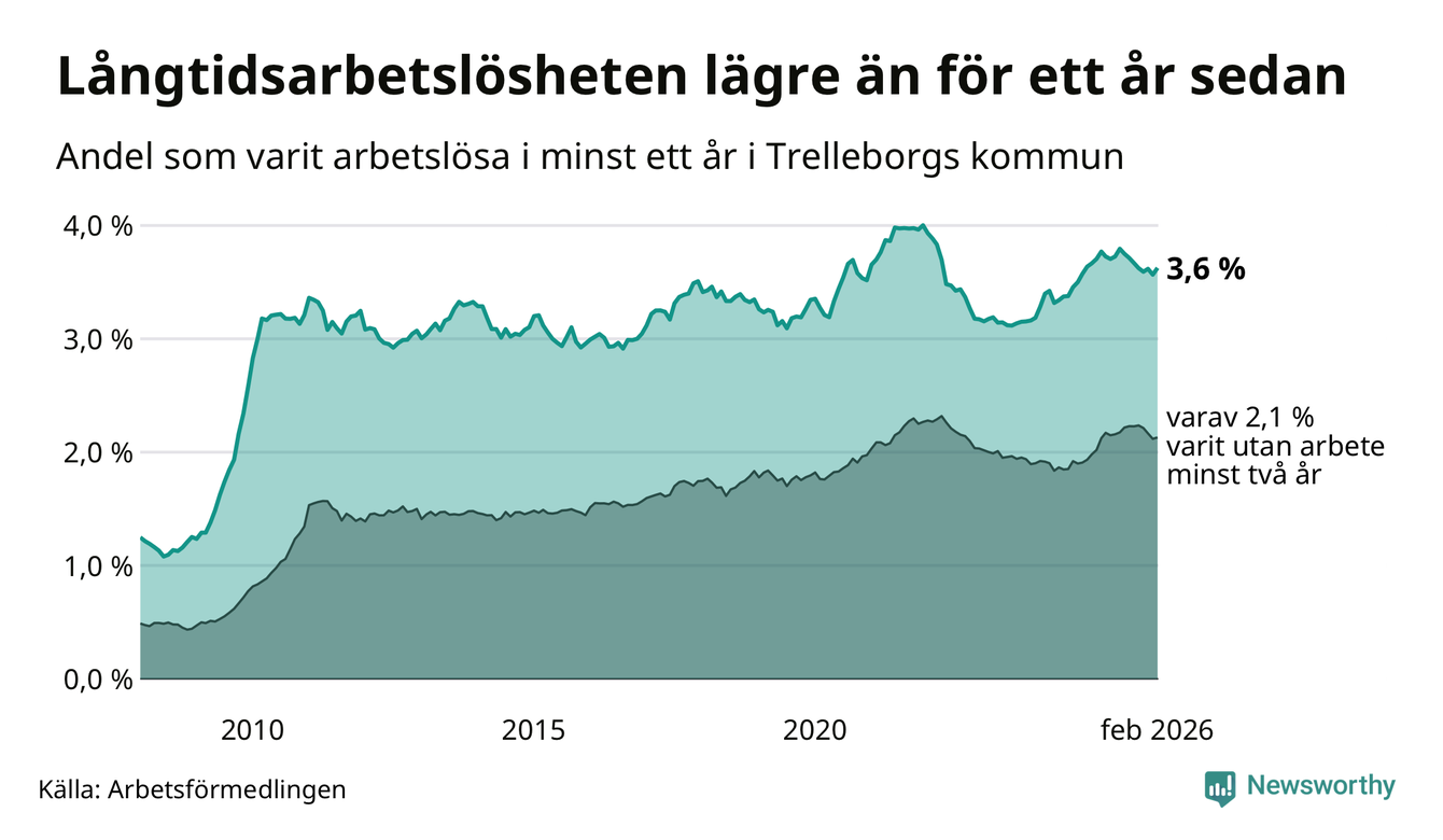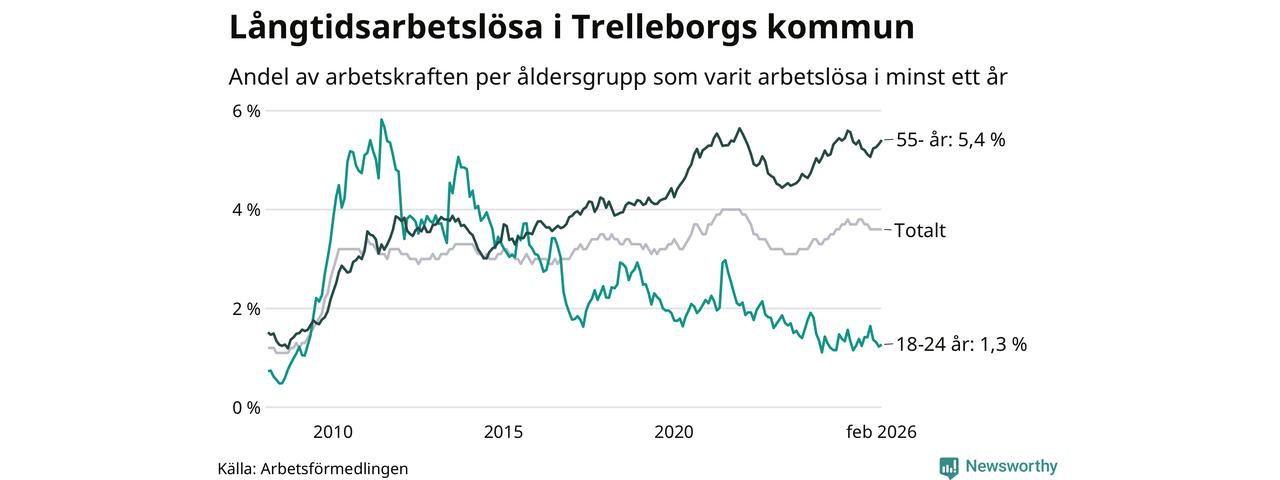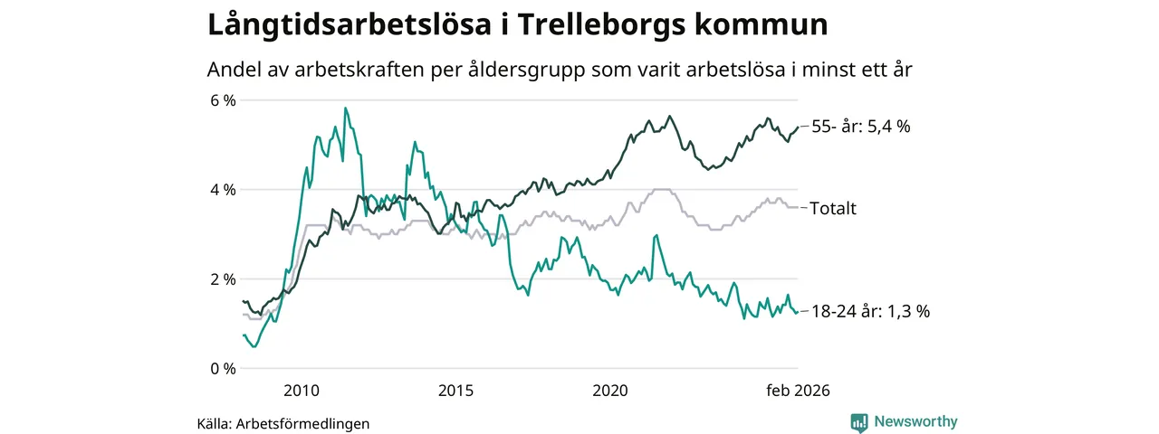 I februari hade 846 Trelleborgsbor varit arbetslösa i minst ett år, vilket är 14 fler än månaden innan. 846 personer motsvarar 3,6 procent av arbetskraften i kommunen – andelen långtidsarbetslösa är 0,2 procentenheter lägre än samma månad för ett år sedan.