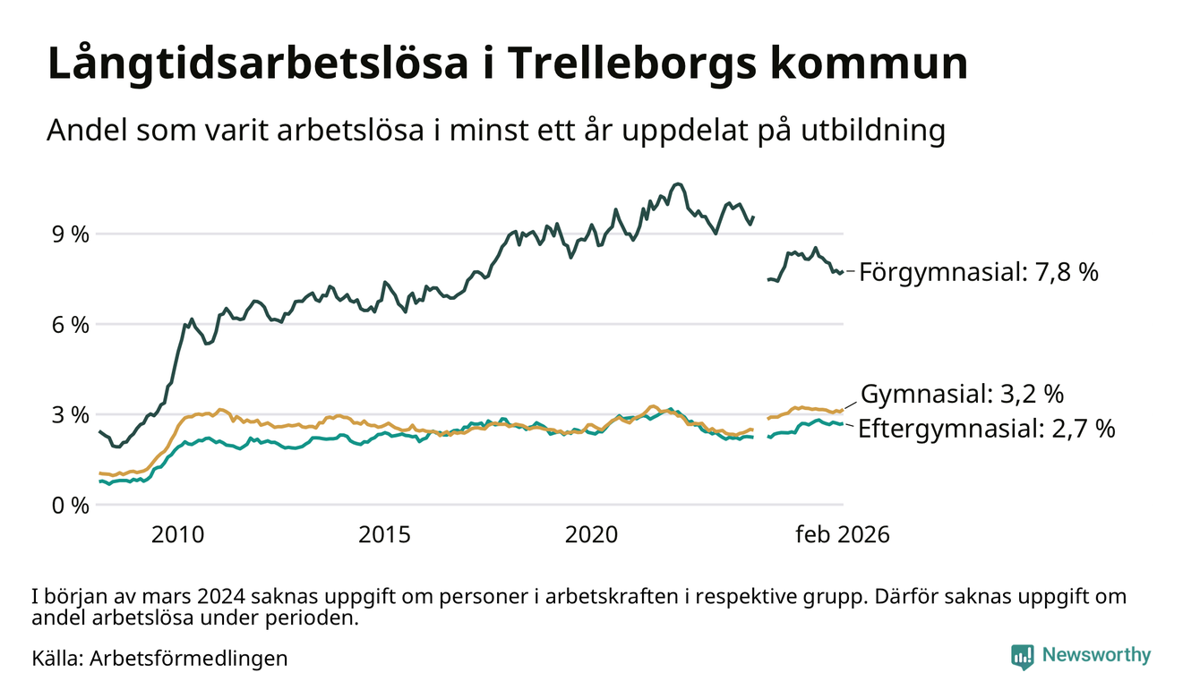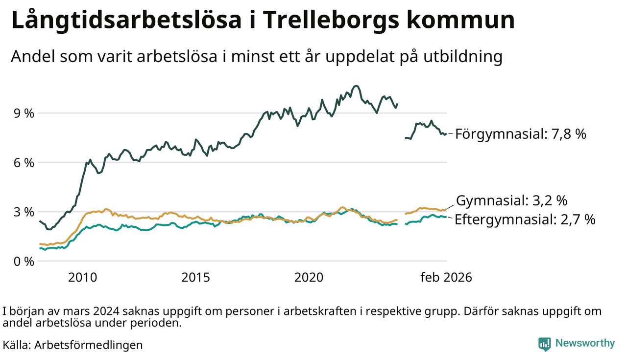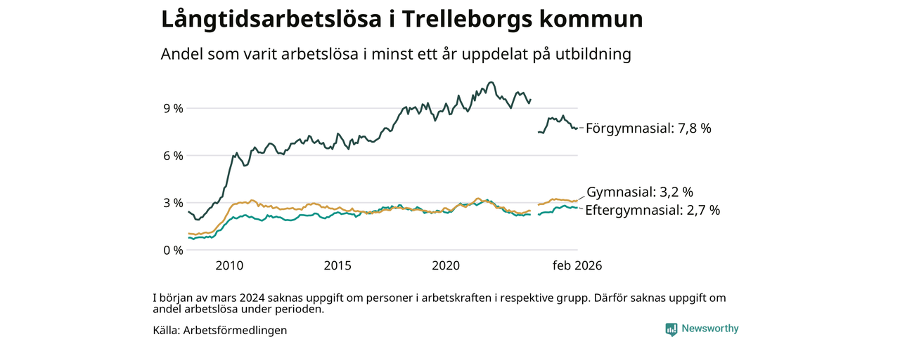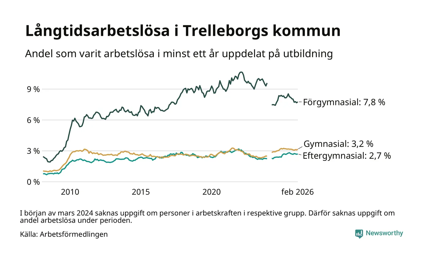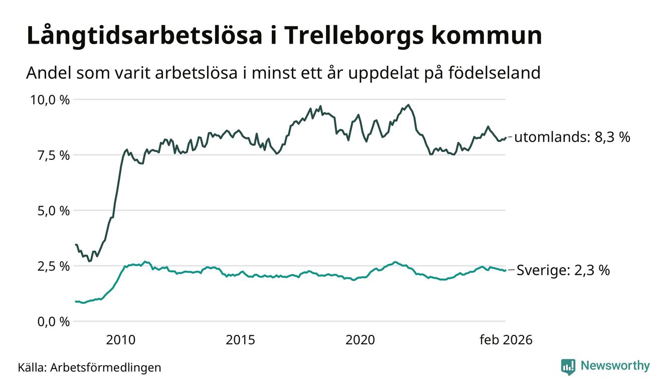 I februari hade 846 Trelleborgsbor varit arbetslösa i minst ett år, vilket är 14 fler än månaden innan. 846 personer motsvarar 3,6 procent av arbetskraften i kommunen – andelen långtidsarbetslösa är 0,2 procentenheter lägre än samma månad för ett år sedan.