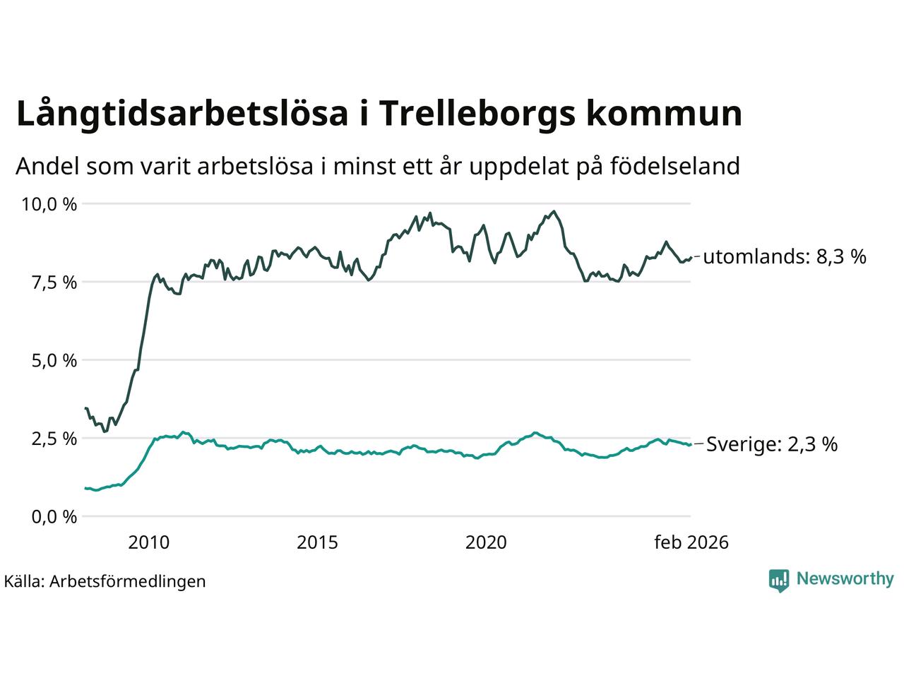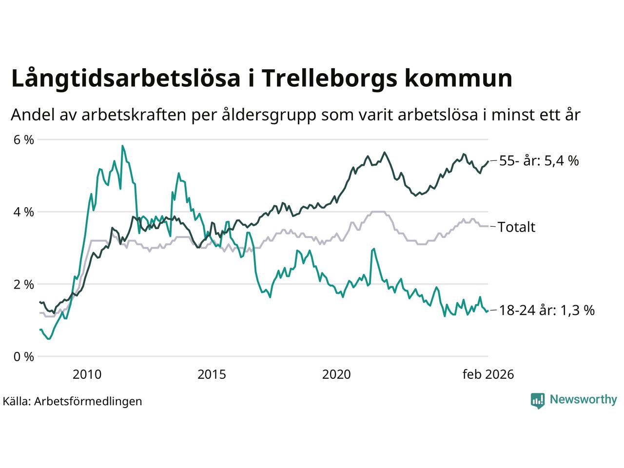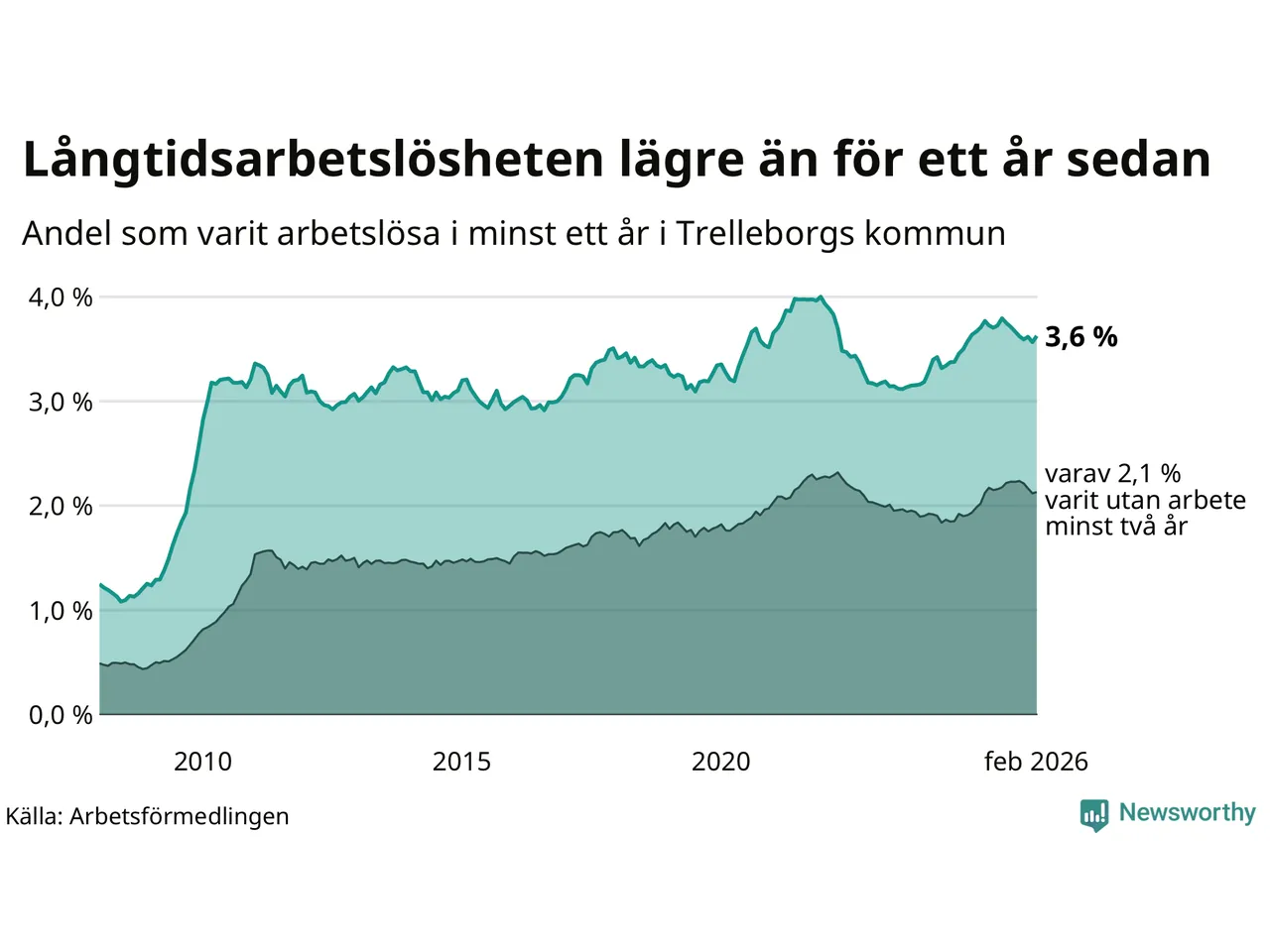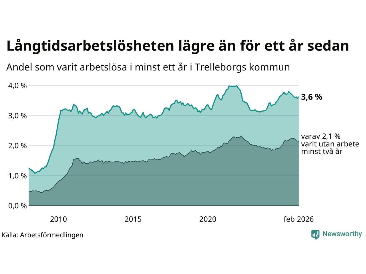 I februari hade 846 Trelleborgsbor varit arbetslösa i minst ett år, vilket är 14 fler än månaden innan. 846 personer motsvarar 3,6 procent av arbetskraften i kommunen – andelen långtidsarbetslösa är 0,2 procentenheter lägre än samma månad för ett år sedan.