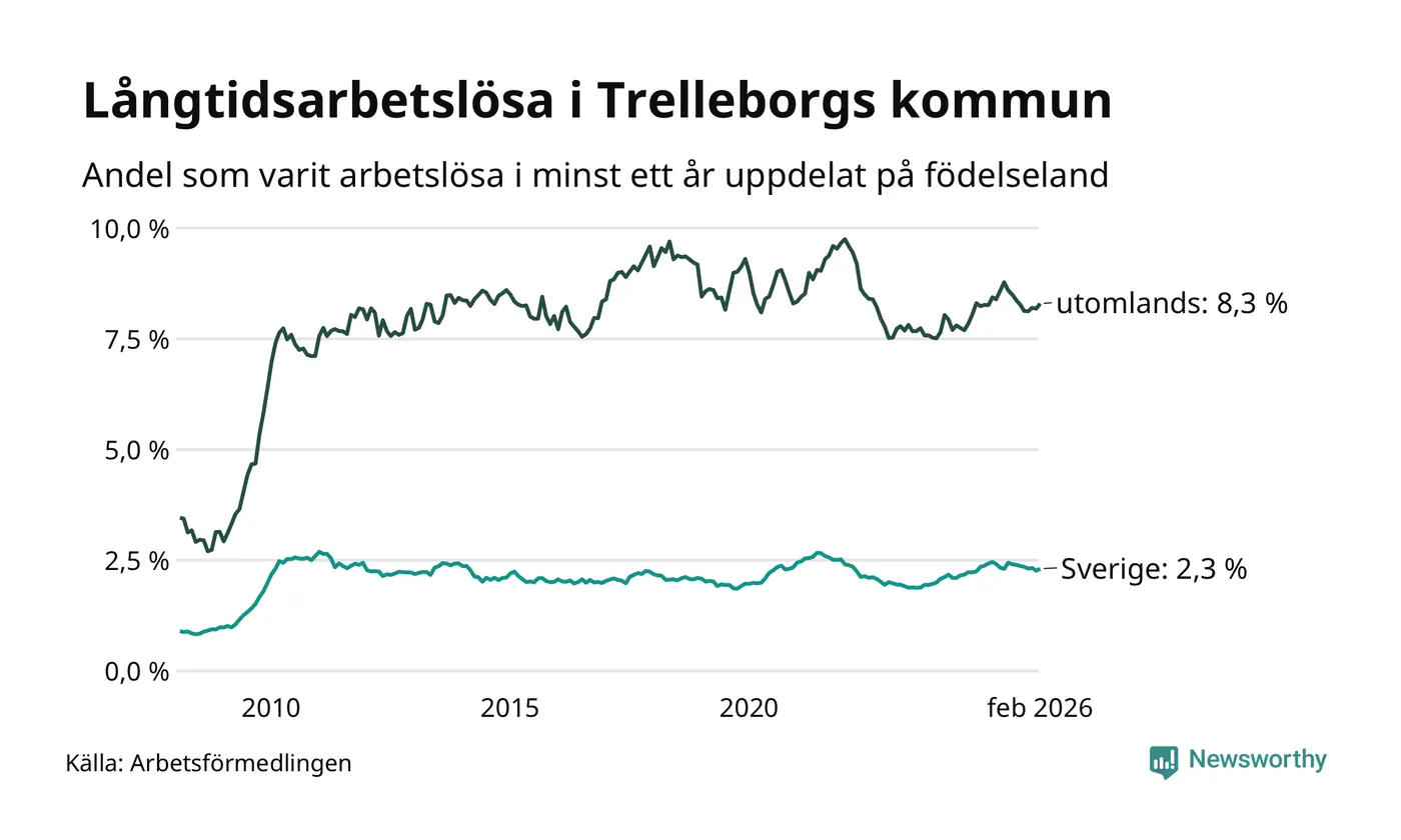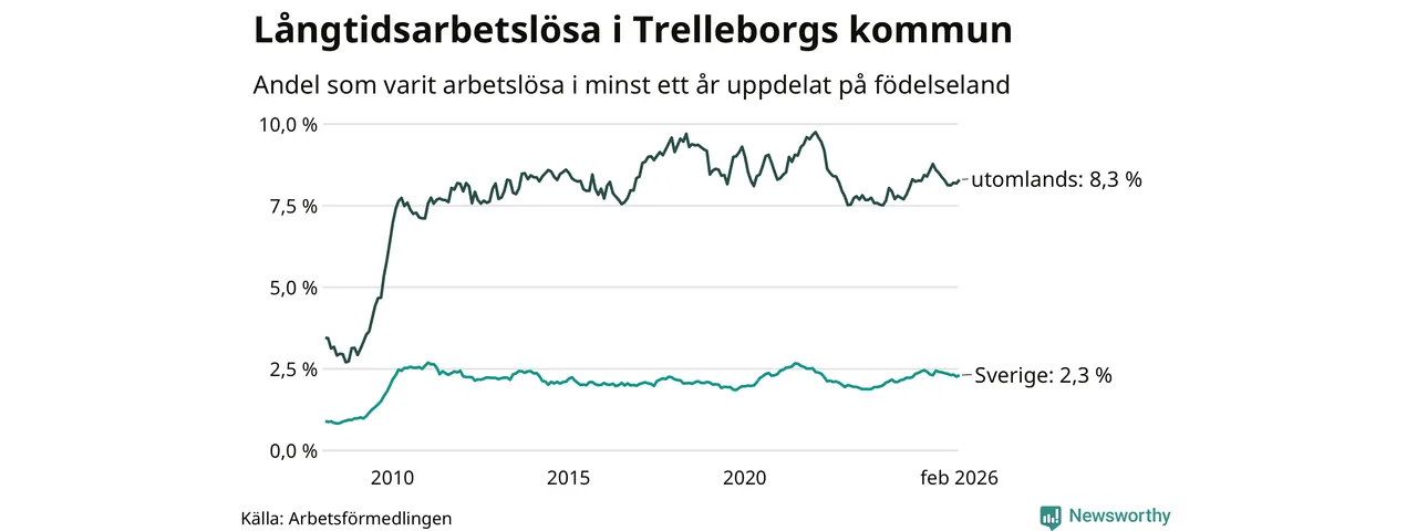 420 av de långtidsarbetslösa i Trelleborg är födda i Sverige, medan 426 är födda utomlands. Det innebär att långtidsarbetslösheten bland Sverigefödda är 2,3 procent, medan den är fyra gånger så hög – 8,3 procent – bland födda utomlands. Även i riket som helhet är arbetslösheten högre bland utrikesfödda.
