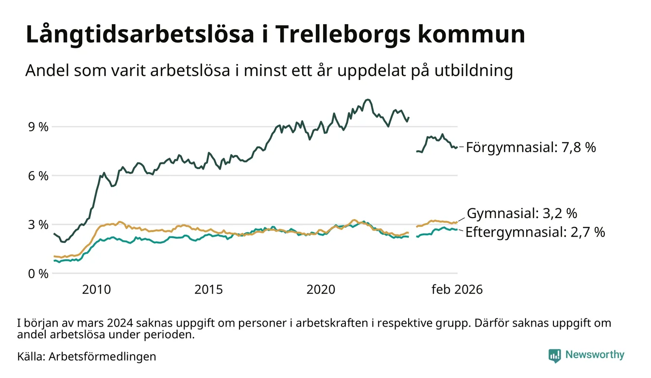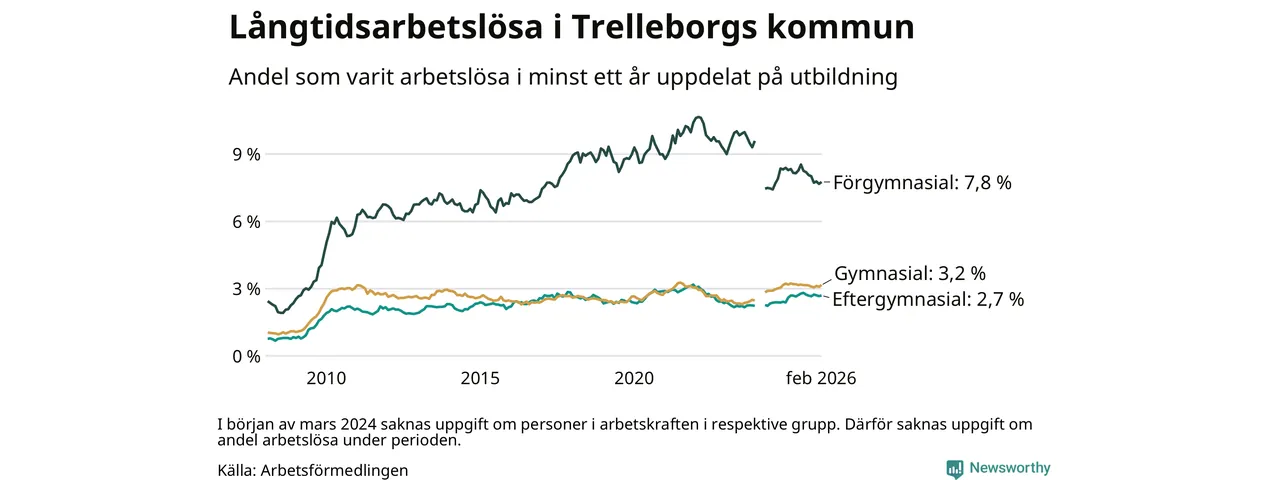 Andelen som varit utan arbete i minst ett år i Trelleborg i februari var lägre än för ett år sedan. Men jämfört med i januari har antalet långtidsarbetslösa ökat.