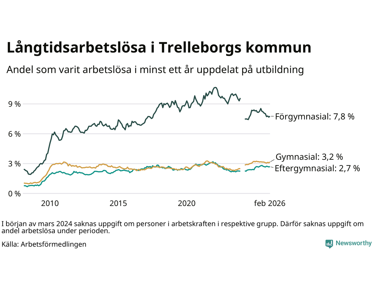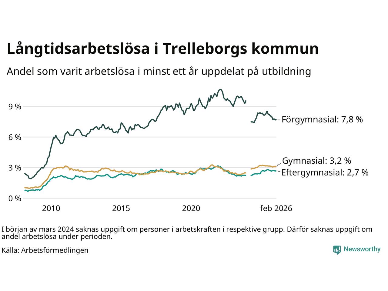 | Andel arbetslösa i minst ett år | 3,6 % | 4,0 % | 2,9 % |