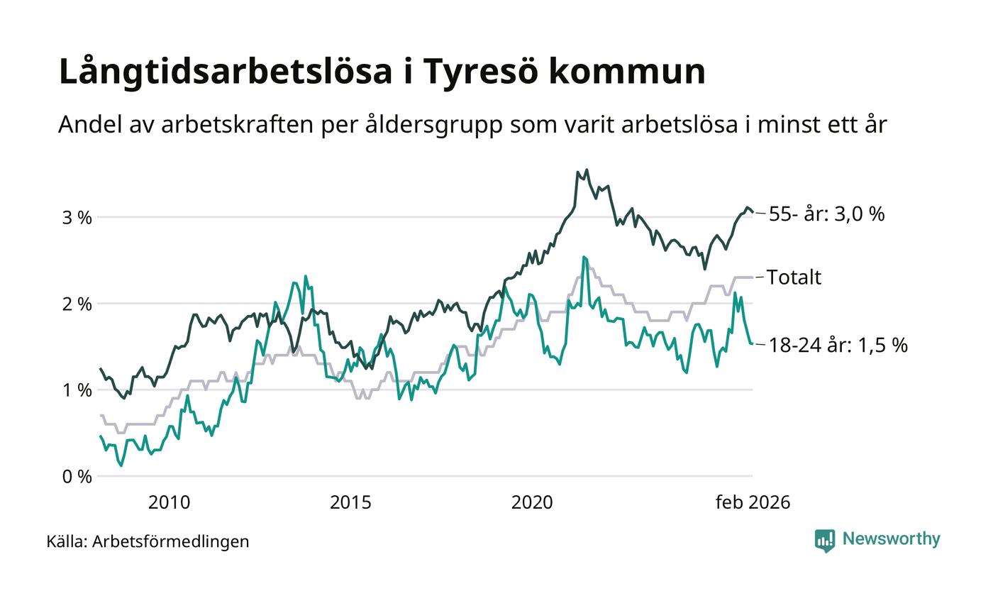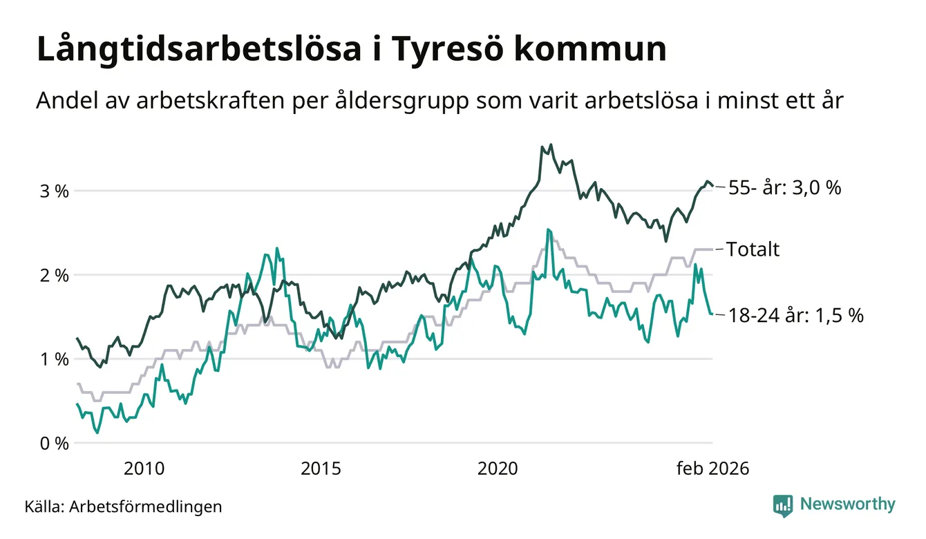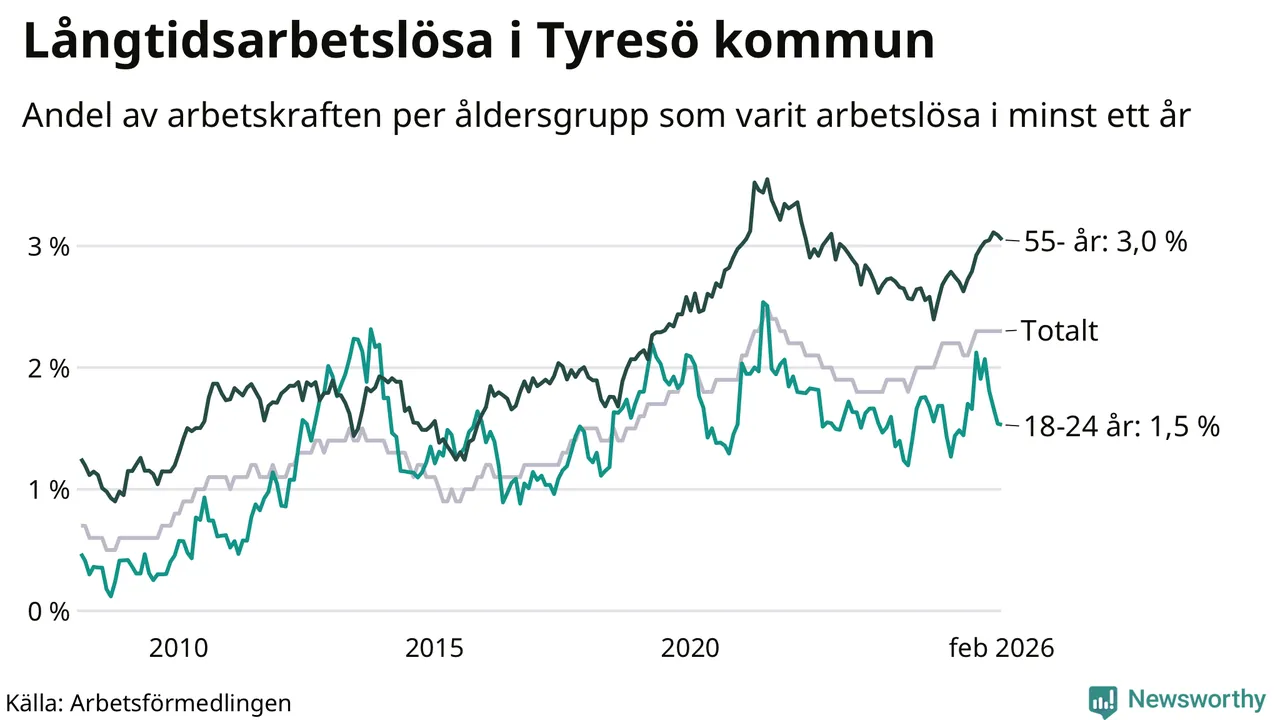 Av de 578 personerna som varit arbetslösa i mer än ett år i Tyresö kommun är 178 personer mellan 55 och 661 år och 37 är mellan 18 och 24 år. För den äldre gruppen är andelen arbetslösa 3,0 procent medan den i den yngre gruppen är 1,5 procent. Även i riket som helhet är långtidsarbetslösheten högre i gruppen äldre.