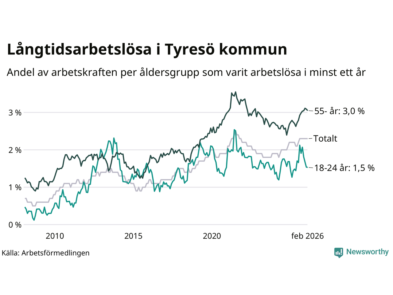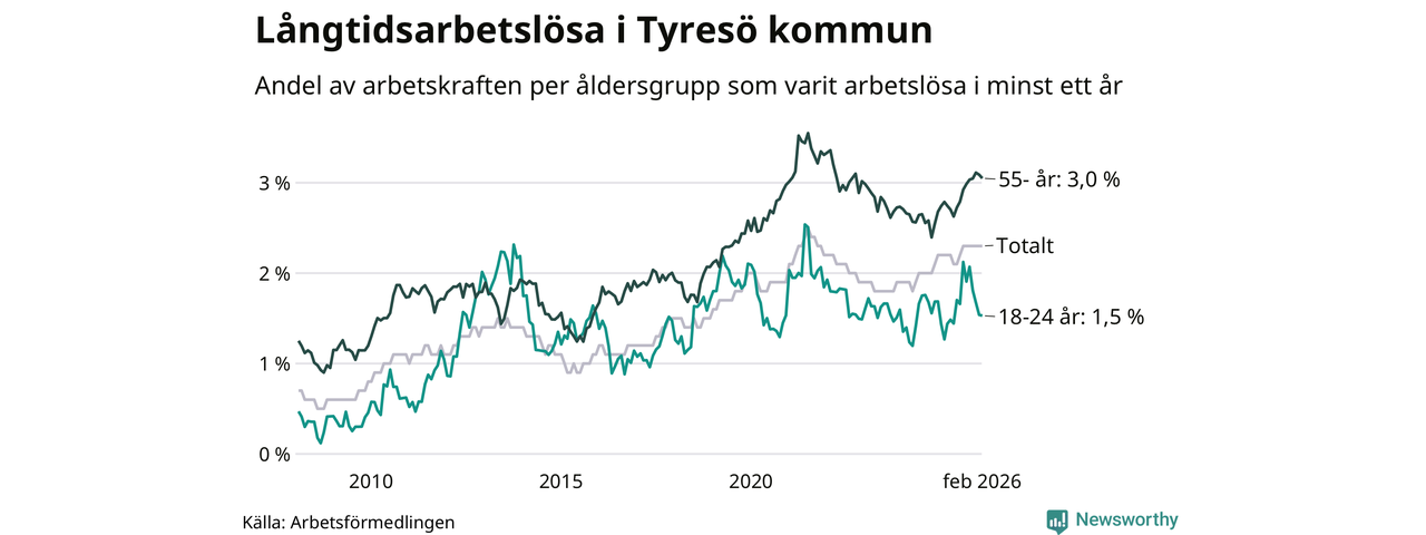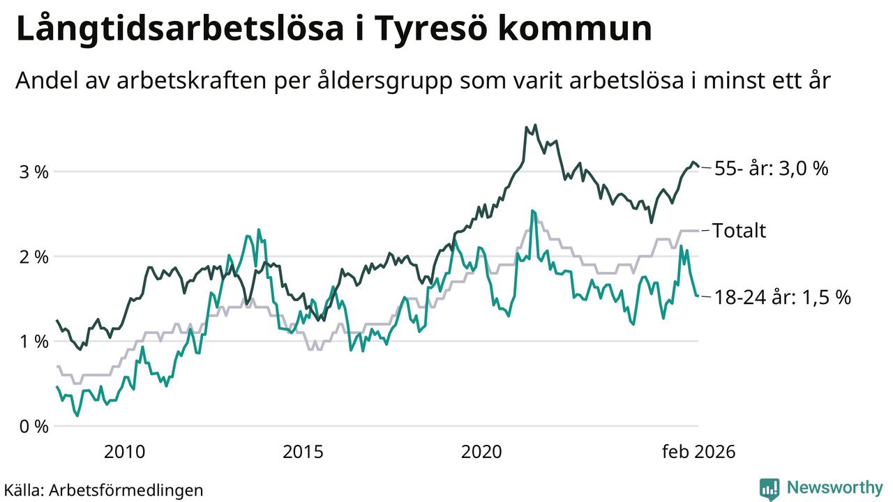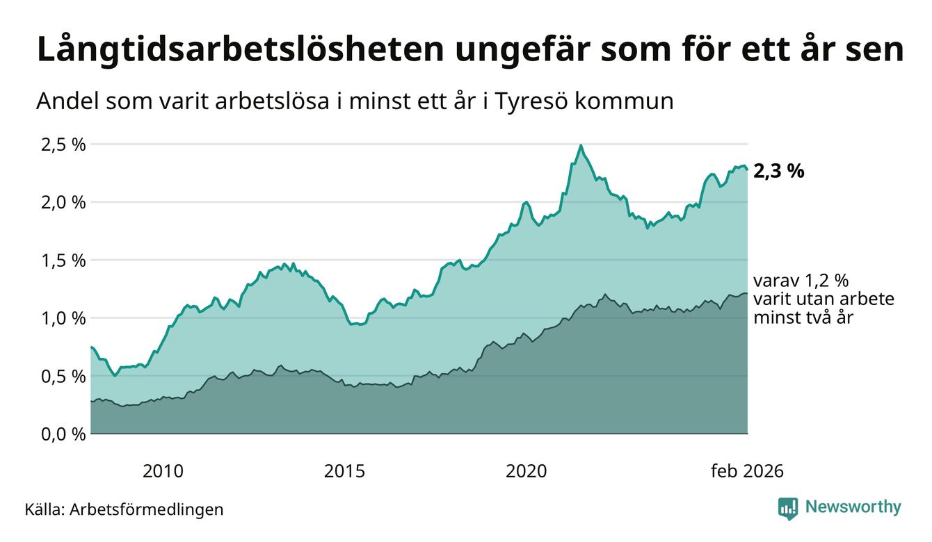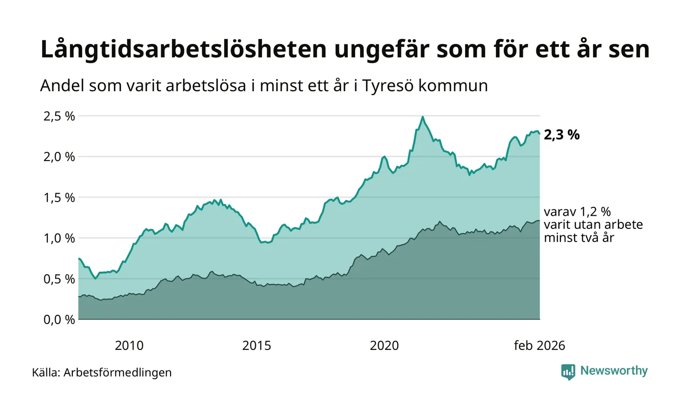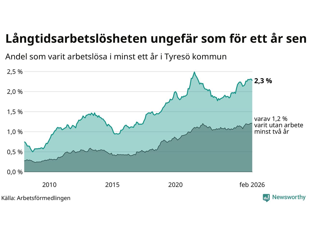 I februari hade 578 Tyresöbor varit arbetslösa i minst ett år, vilket är nio färre än månaden innan. 578 personer motsvarar 2,3 procent av arbetskraften i kommunen – andelen långtidsarbetslösa är ungefär på samma nivå som för ett år sedan.